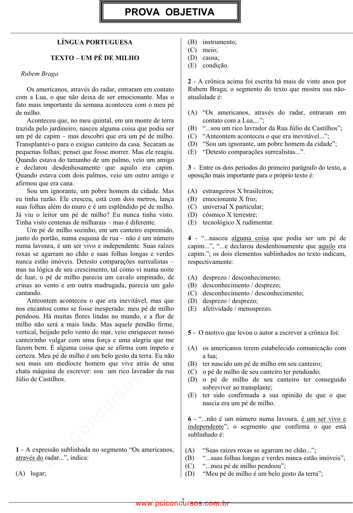 pcimarkpci MDAwMDowMDAwOjAwMDA6MDAwMDowMDAwOmZmZmY6MmRhMDo1YTc4:RnJpLCAxMyBBdWcgMjAyMSAxNzoxODoyOCAtMDMwMA== 2 PROVA OBJETIVA LÍNGUA PORTUGUESA TEXTO – UM PÉ DE MILHO Rubem Braga Os americanos, através do radar, entraram em contato com a Lua, o que não deixa de ser emocionante. Mas o fato mais importante da semana aconteceu com o meu pé de milho. Aconteceu que, no meu quintal, em um monte de terra trazida pelo jardineiro, nasceu alguma coisa que podia ser um pé de capim – mas descobri que era um pé de milho. Transplantei-o para o exíguo canteiro da casa. Secaram as pequenas folhas; pensei que fosse morrer. Mas ele reagiu. Quando estava do tamanho de um palmo, veio um amigo e declarou desdenhosamente que aquilo era capim. Quando estava com dois palmos, veio um outro amigo e afirmou que era cana. Sou um ignorante, um pobre homem da cidade. Mas eu tinha razão. Ele cresceu, está com dois metros, lança suas folhas além do muro e é um esplêndido pé de milho. Já viu o leitor um pé de milho? Eu nunca tinha visto. Tinha visto centenas de milharais – mas é diferente. Um pé de milho sozinho, em um canteiro espremido, junto do portão, numa esquina de rua – não é um número numa lavoura, é um ser vivo e independente. Suas raízes roxas se agarram no chão e suas folhas longas e verdes nunca estão imóveis. Detesto comparações surrealistas – mas na lógica de seu crescimento, tal como vi numa noite de luar, o pé de milho parecia um cavalo empinado, de crinas ao vento e em outra madrugada, parecia um galo cantando. Anteontem aconteceu o que era inevitável, mas que nos encantou como se fosse inesperado: meu pé de milho pendoou. Há muitas flores lindas no mundo, e a flor de milho não será a mais linda. Mas aquele pendão firme, vertical, beijado pelo vento do mar, veio enriquecer nosso canteirinho vulgar com uma força e uma alegria que me fazem bem. É alguma coisa que se afirma com ímpeto e certeza. Meu pé de milho é um belo gesto da terra. Eu não sou mais um medíocre homem que vive atrás de uma chata máquina de escrever: sou um rico lavrador da rua Júlio de Castilhos. 1 - A expressão sublinhada no segmento “Os americanos, através do radar...”, indica: (A) lugar; (B) instrumento; (C) meio; (D) causa; (E) condição. 2 - A crônica acima foi escrita há mais de vinte anos por Rubem Braga; o segmento do texto que mostra sua não- atualidade é: (A) “Os americanos, através do radar, entraram em contato com a Lua,...”; (B) “...sou um rico lavrador da Rua Júlio de Castilhos”; (C) “Anteontem aconteceu o que era inevitável...”; (D) “Sou um ignorante, um pobre homem da cidade”; (E) “Detesto comparações surrealistas...”. 3 - Entre os dois períodos do primeiro parágrafo do texto, a oposição mais importante para o próprio texto é: (A) estrangeiros X brasileiros; (B) emocionante X frio; (C) universal X particular; (D) cósmico X terrestre; (E) tecnológico X rudimentar. 4 - “...nasceu alguma coisa que podia ser um pé de capim...”, “...e declarou desdenhosamente que aquilo era capim.”; os dois elementos sublinhados no texto indicam, respectivamente: (A) desprezo / desconhecimento; (B) desconhecimento / desprezo; (C) desconhecimento / desconhecimento; (D) desprezo / desprezo; (E) afetividade / menosprezo. 5 - O motivo que levou o autor a escrever a crônica foi: (A) os americanos terem estabelecido comunicação com a lua; (B) ter nascido um pé de milho em seu canteiro; (C) o pé de milho de seu canteiro ter pendoado; (D) o pé de milho de seu canteiro ter conseguido sobreviver ao transplante; (E) ter sido confirmada a sua opinião de que o que nascia era um pé de milho. 6 - “...não é um número numa lavoura, é um ser vivo e independente”; o segmento que confirma o que está sublinhado é: (A) “Suas raízes roxas se agarram no chão...”; (B) “...suas folhas longas e verdes nunca estão imóveis”; (C) “...meu pé de milho pendoou”; (D) “Meu pé de milho é um belo gesto da terra”; www.pciconcursos.com.br pcimarkpci MDAwMDowMDAwOjAwMDA6MDAwMDowMDAwOmZmZmY6MmRhMDo1YTc4:RnJpLCAxMyBBdWcgMjAyMSAxNzoxODoyOCAtMDMwMA== 3 PROVA OBJETIVA (E) “...afirmou que era cana”. 7 - Considerando o segundo e o terceiro parágrafos do texto, o segmento que pode ser considerado uma interrupção da narrativa é: (A) “Quando estava com dois palmos, veio outro amigo e afirmou que era cana”; (B) “-mas descobri que era um pé de milho”; (C) “Mas ele reagiu”; (D) “Sou um ignorante, um pobre homem da cidade”; (E) “Ele cresceu, está com dois metros...”. 8 - A substituição correta do termo sublinhado por um sinônimo está em: (A) “Transplantei-o para o exíguo canteiro...” = raso; (B) “...e declarou desdenhosamente que aquilo era capim” = depreciativamente; (C) “...veio enriquecer o nosso canteirinho vulgar...” = popular; (D) “Anteontem aconteceu o que era inevitável...” = imprevisível; (E) “...que se afirma com ímpeto e certeza” = velocidade. 9 - A substituição da expressão sublinhada por um só termo é INADEQUADA em: (A) “Sou um ignorante, um pobre homem da cidade” = urbano; (B) “...tal como vi numa noite de luar...” = enluarada; (C) “...beijado pelo vento do mar...” = marinho; (D) “...exíguo canteiro da casa.” = doméstico; (E) “...é um belo gesto da terra.” = terrestre. 10 - Em todos os segmentos abaixo há um sintagma construído por um substantivo + adjetivo (ou vice-versa); o sintagma em que a troca de posições entre esses vocábulos pode trazer mudança de sentido é: (A) “Transplantei-o para o exíguo canteiro da casa”; (B) “Secaram as pequenas folhas”; (C) “Sou um ignorante, um pobre homem da cidade”; (D) “...e é um esplêndido pé de milho”; (E) “...em um canteiro espremido...”. 11 - “Detesto comparações surrealistas...”; apesar disso, o autor do texto faz uma dessas comparações: (A) “...o pé de milho parecia 