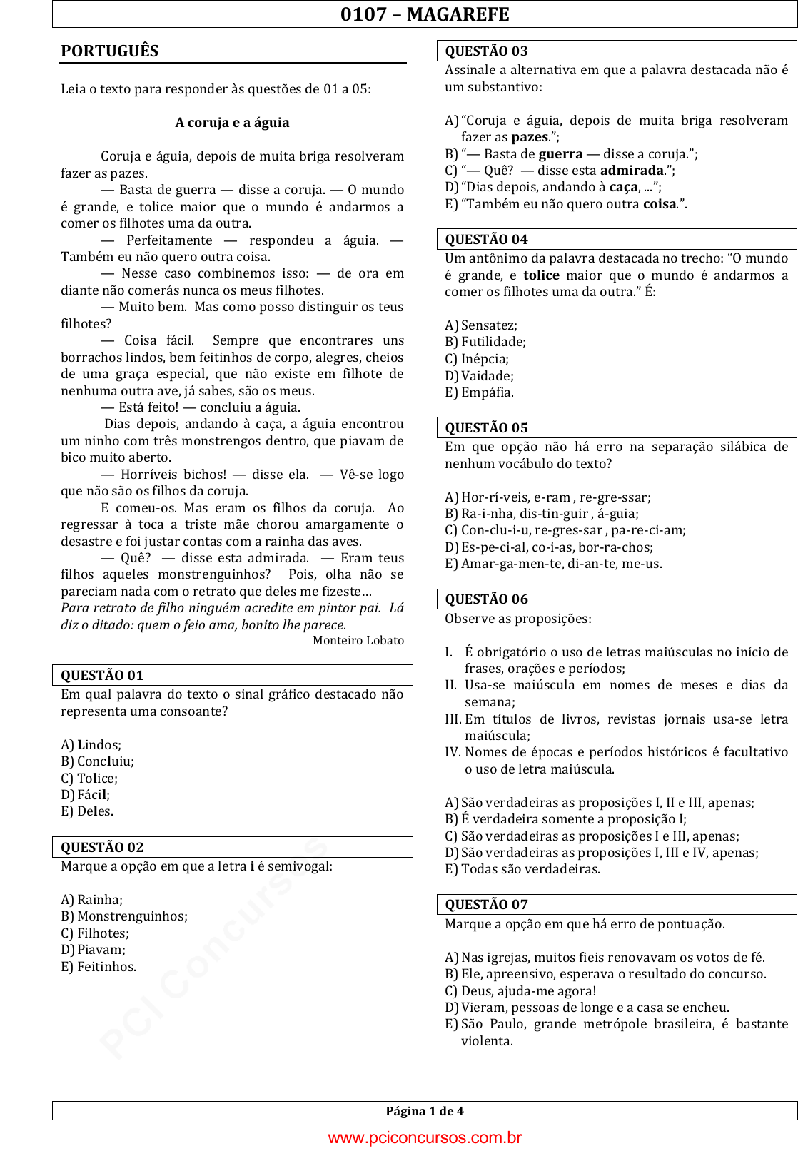 pcimarkpci MDAwMDowMDAwOjAwMDA6MDAwMDowMDAwOmZmZmY6MmRhMDo1YTc4:RnJpLCAxMyBBdWcgMjAyMSAxNzoyNTozMiAtMDMwMA== 0107 – MAGAREFE Página 1 de 4 PORTUGUÊS Leia o texto para responder às questões de 01 a 05: A coruja e a águia Coruja e águia, depois de muita briga resolveram fazer as pazes. — Basta de guerra — disse a coruja. — O mundo é grande, e tolice maior que o mundo é andarmos a comer os filhotes uma da outra. — Perfeitamente — respondeu a águia. — Também eu não quero outra coisa. — Nesse caso combinemos isso: — de ora em diante não comerás nunca os meus filhotes. — Muito bem. Mas como posso distinguir os teus filhotes? — Coisa fácil. Sempre que encontrares uns borrachos lindos, bem feitinhos de corpo, alegres, cheios de uma graça especial, que não existe em filhote de nenhuma outra ave, já sabes, são os meus. — Está feito! — concluiu a águia. Dias depois, andando à caça, a águia encontrou um ninho com três monstrengos dentro, que piavam de bico muito aberto. — Horríveis bichos! — disse ela. — Vê-se logo que não são os filhos da coruja. E comeu-os. Mas eram os filhos da coruja. Ao regressar à toca a triste mãe chorou amargamente o desastre e foi justar contas com a rainha das aves. — Quê? — disse esta admirada. — Eram teus filhos aqueles monstrenguinhos? Pois, olha não se pareciam nada com o retrato que deles me fizeste… Para retrato de filho ninguém acredite em pintor pai. Lá diz o ditado: quem o feio ama, bonito lhe parece. Monteiro Lobato QUESTÃO 01 Em qual palavra do texto o sinal gráfico destacado não representa uma consoante? A) Lindos; B) Concluiu; C) Tolice; D) Fácil; E) Deles. QUESTÃO 02 Marque a opção em que a letra i é semivogal: A) Rainha; B) Monstrenguinhos; C) Filhotes; D) Piavam; E) Feitinhos. QUESTÃO 03 Assinale a alternativa em que a palavra destacada não é um substantivo: A) “Coruja e águia, depois de muita briga resolveram fazer as pazes.”; B) “— Basta de guerra — disse a coruja.”; C) “— Quê? — disse esta admirada.”; D) “Dias depois, andando à caça, ...”; E) “Também eu não quero outra coisa.”. QUESTÃO 04 Um antônimo da palavra destacada no trecho: “O mundo é grande, e tolice maior que o mundo é andarmos a comer os filhotes uma da outra.” É: A) Sensatez; B) Futilidade; C) Inépcia; D) Vaidade; E) Empáfia. QUESTÃO 05 Em que opção não há erro na separação silábica de nenhum vocábulo do texto? A) Hor-rí-veis, e-ram , re-gre-ssar; B) Ra-i-nha, dis-tin-guir , á-guia; C) Con-clu-i-u, re-gres-sar , pa-re-ci-am; D) Es-pe-ci-al, co-i-as, bor-ra-chos; E) Amar-ga-men-te, di-an-te, me-us. QUESTÃO 06 Observe as proposições: I. É obrigatório o uso de letras maiúsculas no início de frases, orações e períodos; II. Usa-se maiúscula em nomes de meses e dias da semana; III. Em títulos de livros, revistas jornais usa-se letra maiúscula; IV. Nomes de épocas e períodos históricos é facultativo o uso de letra maiúscula. A) São verdadeiras as proposições I, II e III, apenas; B) É verdadeira somente a proposição I; C) São verdadeiras as proposições I e III, apenas; D) São verdadeiras as proposições I, III e IV, apenas; E) Todas são verdadeiras. QUESTÃO 07 Marque a opção em que há erro de pontuação. A) Nas igrejas, muitos fieis renovavam os votos de fé. B) Ele, apreensivo, esperava o resultado do concurso. C) Deus, ajuda-me agora! D) Vieram, pessoas de longe e a casa se encheu. E) São Paulo, grande metrópole brasileira, é bastante violenta. www.pciconcursos.com.br pcimarkpci MDAwMDowMDAwOjAwMDA6MDAwMDowMDAwOmZmZmY6MmRhMDo1YTc4:RnJpLCAxMyBBdWcgMjAyMSAxNzoyNTozMiAtMDMwMA== 0107 – MAGAREFE Página 2 de 4 Observe o poema de Cecília Meireles para responder às questões de 08 a 10: Retrato "Eu não tinha este rosto de hoje, assim calmo, assim triste, assim magro, nem estes olhos tão vazios, nem o lábio amargo. Eu não tinha estas mãos sem força, tão paradas e frias e mortas; eu não tinha este coração que nem se mostra. Eu não dei por esta mudança, tão simples, tão certa, tão fácil: Em que espelho ficou perdida a minha face?" QUESTÃO 08 Marque a opção em que a palavra tirada do texto é um substantivo abstrato: A) Espelho; B) Mãos; C) Olhos; D) Lábio; E) Mudança. QUESTÃO 09 Assinale a opção em que a palavra tirada do texto não é dissílaba: A) Assim; B) Mãos; C) Mostra; D) Frias; E) Lábio. QUESTÃO 10 Há uma palavra paroxítona em: A) Fácil; B) Ficou; C) Mãos; D) Tão; E) Assim. QUESTÃO 11 Marque o item em que há erro na indicação do plural da palavra: A) Xadrez – xadrezes; B) Troféu – troféis; C) O atlas – os atlas; D) Paul – pauis; E) Lobisomem – lobisomens. QUESTÃO 12 Assinale a opção em que todos os substantivos são femininos: A) Cal, libido, sentinela, hélice; B) Derme, juriti, faringe, estigma; C) Usucapião, eclipse, cal, tíbia; D) Sucuri, comichão, champanha, cataplasma; E) Libido, rês, sabiá, estigma. QUESTÃO 13 Marque o item em que há erro na indicação do substantivo coletivo: A) piquete: de pessoas envolvidas em uma greve; B) herbário: de plantas para estudo ou exposição; C) falange: de soldados, de tropas; D) claque: de atores; E) vara: de porcos. ANOTAÇÕES www.pciconcursos.com.br pcimarkpci MDAwMDowMDAwOjAwMDA6MDAwMDowMDAwOmZmZmY6MmRhMDo1YTc4:RnJpLCAxMyBBdWcgMjAyMSAxNzoyNTozMiAtMDMwMA== 0107 – MAGAREFE Página 3 de 4 O texto servirá de base para as questões 14 e 15: Cão, cão, cão Abriu a porta e viu o amigo que há tanto não via. Estranhou apenas que ele, amigo, viesse acompanhado de um cão. O cão não muito grande, mas bastante forte, de raça indefinida, saltitante e com um ar alegremente agressivo. Abriu a porta e cumprimentou o amigo, com toda efusão. "Quanto tempo!". O cão aproveitou as saudações, se embarafustou casa adentro e logo o barulho na cozinha demonstrava que ele tinha quebrado alguma coisa. O dono da casa encompridou
