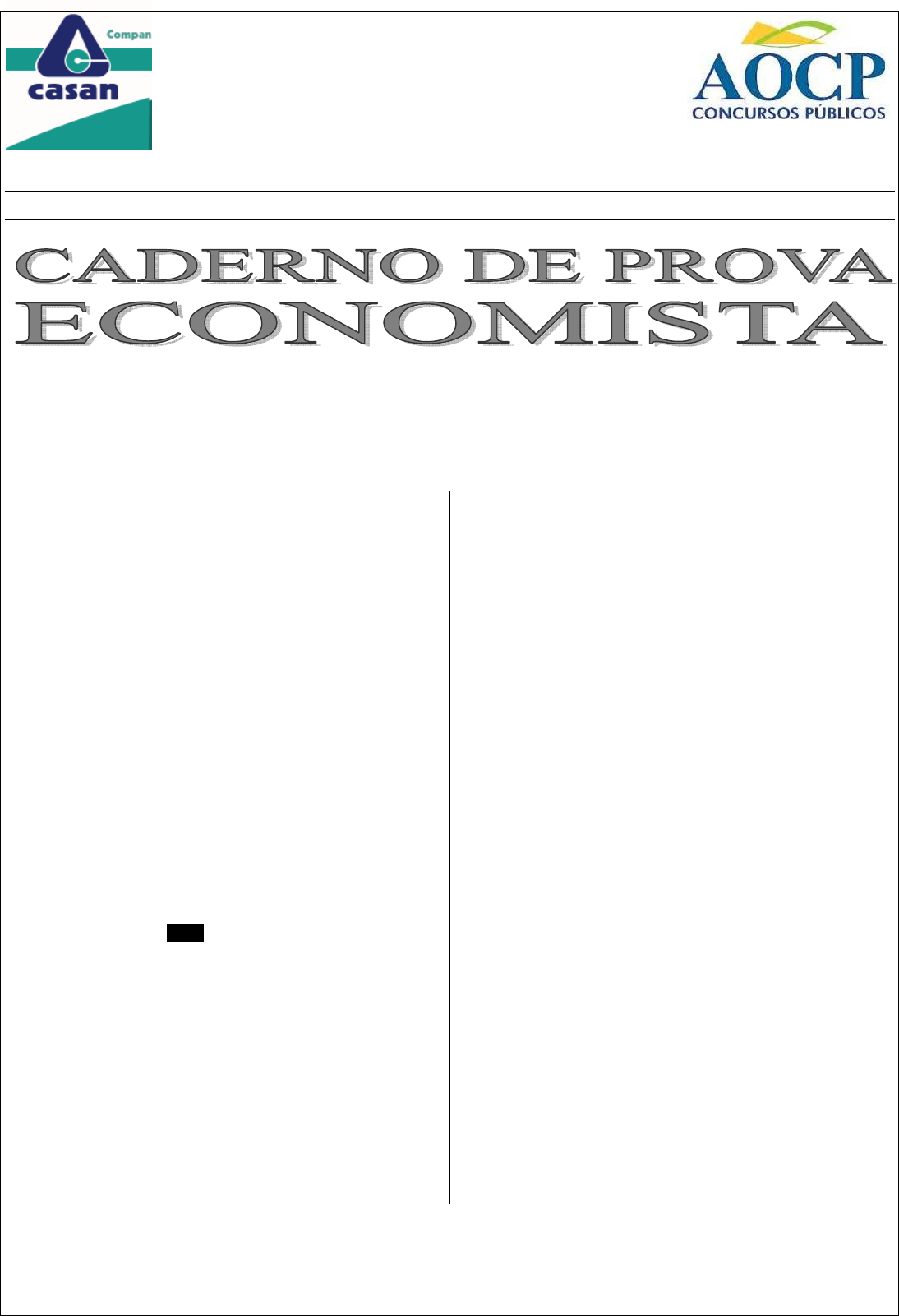 REALIZAÇÃO COMPANHIA CATARINENSE DE ÁGUAS E SANEAMENTO - CASAN . R E F . E D I T A L N º 0 0 1 / 2 0 0 9 - C O N C U R S O P Ú B L I C O INSTRUÇÕES � Você está recebendo do fiscal um Caderno de Prova com 40 (quarenta) questões numeradas sequencialmente que compõem a prova objetiva. � Você receberá, também, a Folha de Respostas personalizada para transcrever as respostas das questões da prova objetiva. ATENÇÃO 1- É proibido folhear o Caderno de Prova antes da autorização do fiscal. 2- Após autorização, verifique se o Caderno de Prova está completo, sem falhas de impressão e se a numeração está correta. Confira também se sua prova corresponde ao cargo para o qual você se inscreveu. Caso haja qualquer divergência, comunique o fato ao fiscal imediatamente. 3- Confira seu nome completo, o número de seu documento e o número de sua inscrição na Folha de Respostas. Caso encontre alguma divergência, comunique o fato ao fiscal para as devidas providências. 4- Você deverá transcrever as respostas das questões objetivas para a Folha de Respostas, que será o único documento válido para a correção das provas. O preenchimento da Folha de Respostas é de inteira responsabilidade do candidato. 5- Para realização da prova o candidato deverá utilizar caneta esferográfica transparente, com tinta de cor azul ou preta. 6- Leia atentamente cada questão da prova e assinale, na Folha de Respostas, a opção que a responda corretamente. Exemplo correto da marcação da Folha de Resposta: 7- A Folha de Respostas não poderá ser dobrada, amassada, rasurada ou conter qualquer marcação fora dos campos destinados às respostas. 8- Na correção da Folha de Respostas, será atribuída nota 0 (zero) às questões não assinaladas, que contiverem mais de uma alternativa assinalada, emenda ou rasura, ainda que legível. 9- Você dispõe de 4h (quatro horas) para fazer a prova, incluindo a marcação da Folha de Respostas. Faça-a com tranquilidade, mas controle seu tempo. 10- Você somente poderá deixar definitivamente a sala de prova após 60(sessenta) minutos de seu início. Caso queira levar o caderno de prova, só poderá sair da sala quando faltar 15 (quinze minutos) para o término do tempo previsto para realização da prova, devendo, obrigatoriamente, devolver ao fiscal a Folha de Respostas devidamente assinada. As provas estarão disponibilizadas no site da AOCP (www.aocp.com.br) a partir da divulgação do Gabarito Preliminar que será dia 01/12/2009. 11- Os 03 (três) últimos candidatos da sala só poderão sair juntos, após a conferência de todos os documentos da sala e assinatura da ata. 12- Durante a prova, não será permitida qualquer espécie de consulta ou comunicação entre os candidatos, nem a utilização de livros, códigos, manuais, impressos ou anotações, calculadoras, relógios, agendas eletrônicas, pagers, telefones celulares, BIP, Walkman, gravador ou qualquer outro equipamento eletrônico. A utilização desses objetos causará eliminação imediata do candidato. 13- Os objetos de uso pessoal, incluindo telefones celulares, deverão ser desligados e mantidos dessa forma até o término da prova e entrega da Folha de Respostas ao fiscal. 14- Também não são permitidos alimentos, bebidas e fumo no local da prova, bem como o uso de chapéus, bonés ou qualquer outra cobertura e o uso de óculos escuros e ou espelhados (salvo por indicação médica que deverá ser apresentada pelo candidato). 15- O candidato que for surpreendido de posse de objetos ou equipamentos cuja entrega é determinada após o início da prova objetiva, será eliminado do concurso, sendo considerados sem efeito todos os atos por ele praticados, inclusive respostas já indicadas na Folha de Resposta. 16- Qualquer tentativa de fraude, se descoberta, implicará em imediata denúncia à autoridade competente, que tomará as medidas cabíveis, inclusive com prisão em flagrante dos envolvidos. ED/25 FOLHA PARA ANOTAÇÃO DAS RESPOSTAS DO CANDIDATO QUESTÃO 1 2 3 4 5 6 7 8 9 10 11 12 13 14 15 16 17 18 19 20 RESP. QUESTÃO 21 22 23 24 25 26 27 28 29 30 31 32 33 34 35 36 37 38 39 40 RESP. ECONOMISTA 3 CONHECIMENTOS GERAIS O ovo da serpente I. A violência no Rio é muito debatida quando há grandes fatos, crimes revoltantes. No entanto, muitas coisas acontecem numa quase surdina, e elas são o indício de que os tempos podem ser piores. II. Há alguns meses, o site do jornal "O Dia" divulgou um vídeo da comemoração do aniversário de um traficante no Complexo do Alemão. Havia uma tal concentração de armas nas mãos dos participantes da festa que pareciam preparados para dominar uma boa parte da cidade. III. Fuzis pendurados no peito, o aniversário parecia um momento de descanso de um exército tropical e descamisado. IV. Aquilo passou. Afinal é preciso tocar as obras do PAC. Agora, no auge da crise do helicóptero abatido, surgiu uma outra despretensiosa notícia no jornal da rádio Bandeirantes: um potencial candidato a deputado foi assassinado em Rio das Pedras, região dominada pelas milícias. O corpo foi encontrado na Cidade de Deus, com perfurações de bala e sinais de tortura. V. Às vezes, quando se dá a crise, a sensação que temos é que tudo vai mudar. O governo anuncia medidas, Brasília envia mais dinheiro e todos tentam dormir tranquilos. VI. O processo não para. Enquanto se discute se a pré- campanha presidencial está nos limites da lei, uma outra pré-campanha está em curso. Ela começa com a eliminação física de adversários. Tanto no Complexo do Alemão como em Rio das Pedras, os vínculos entre política e crime passam ao largo e, quando surgem acontecimentos espetaculares, parecem relâmpago em céu azul. VII. Todos esses fuzis e metralhadoras estarão diante de nós na campanha de 2010. Não é difícil saber a quem servem. O foco atual é o comércio de drogas. Mas, durante o período não eleitoral, esquecemos do comércio de 