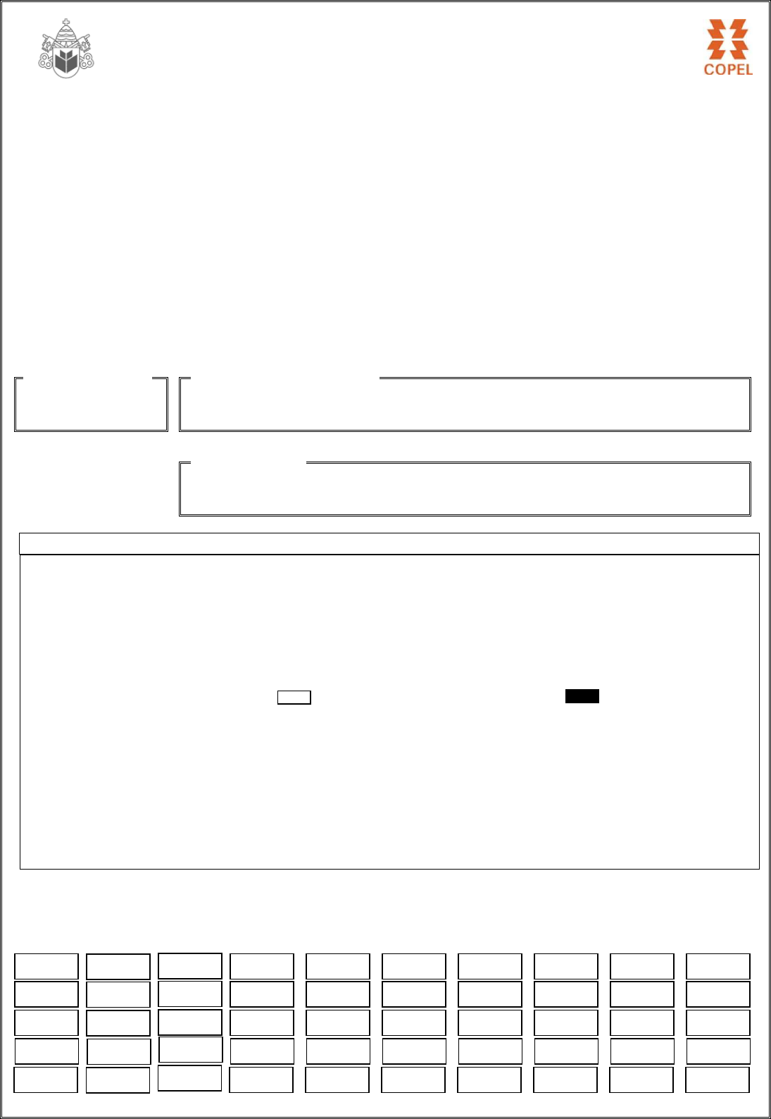 Pontifícia Universidade Católica do Paraná Concurso Público da Companhia Paranaense de Energia - COPEL 24 de Janeiro de 2010 CARGO Nº 145 ASSISTENTE TÉCNICO II Atuação: Desenhista I (Desenho Técnico – cadista) INFORMAÇÕES / INSTRUÇÕES: 1. Verifique se a prova está completa: questões de números 1 a 50. 2. A compreensão e a interpretação das questões constituem parte integrante da prova, razão pela qual os fiscais não poderão interferir. 3. Preenchimento do Cartão-Resposta : - Preencher para cada questão apenas uma resposta - Preencher totalmente o espaço correspondente, conforme o modelo: - Usar caneta esferográfica, escrita normal, tinta azul ou preta - Para qualquer outra forma de preenchimento, a leitora anulará a questão O CARTÃO-RESPOSTA É PERSONALIZADO. NÃO PODE SER SUBSTITUÍDO, NEM CONTER RASURAS. Duração total da prova: 4 horas e 30 minutos � - - - - - - - - - - - - - - - - - - - - - - - - - - - - - - - - - - - - - - - - - - - - - - - - - - - - - - - - - - - - - - - - - - - - - - - - Anote o seu gabarito. N.º DO CARTÃO NOME (LETRA DE FORMA) ASSINATURA 1. 2. 3. 4. 5. 6. 7. 8. 9. 10. 31. 32. 33. 34. 35. 36. 37. 38. 39. 40. 11. 12. 13. 14. 15. 16. 17. 18. 19. 20. 21. 22. 23. 24. 25. 26. 27. 28. 29. 30. 41. 42. 43. 44. 45. 46. 47. 48. 49. 50. Pontifícia Universidade Católica do Paraná – Concurso Público COPEL/2010 Pág. 1 Pontifícia Universidade Católica do Paraná – Concurso Público COPEL/2010 Pág. 2 CCOONNHHEECCIIMMEENNTTOOSS EESSPPEECCÍÍFFIICCOOSS 1. Observe as informações presentes na planilha abaixo digitada no Excel 2003: Após a realização dos seguintes passos: - copiar a célula A3 - colar em B3, C3 e D3 - digitar na célula A4 a fórmula =MÉDIA(A3:D3) Que valor será mostrado em A4? A) 3. B) 1,2. C) 0,3. D) 30. E) 12. 2. A planilha abaixo, criada no Excel 2003, apresenta na guia Atendimentos a quantidade de ocorrências atendidas pelos funcionários de uma empresa em cada um dos dias da semana mencionados: Os funcionários têm como meta atender 10 ou mais ocorrências por dia. Para verificar a situação de cada funcionário foi criada a guia Resumo: Qual fórmula deve ser digitada na célula B3 da guia Resumo para se calcular a quantidade de dias em que Beltrano atingiu sua meta? A) =CONT.SE(Atendimentos!C10:C14; ">= 10") B) =CONTAR(Atendimentos!C10:C14; ">= 10") C) =CONT.SE(Atendimentos!B10:B14; ">= 10") D) =CONT(Atendimentos!C10:C14; >= 10) E) =CONT.SE(Atendimentos!;" C10:C14>= 10") 3. Assinale a alternativa CORRETA em relação às assertivas abaixo, considerando o Microsoft Word 2003 em sua configuração padrão: I. O AutoResumo identifica os pontos principais de um documento. Funciona melhor em documentos bem estruturados. II. A AutoApresentação cria automaticamente uma apresentação (no formato PPT), usando um modelo do ClipArt, e identificando automaticamente as palavras-chave. III. A AutoFormatação serve para aplicar rapidamente formatação ao texto como, por exemplo, títulos, listas numeradas, bordas e símbolos. IV. O AutoTexto serve para armazenar e inserir com rapidez texto, elementos gráficos e outros itens usados com frequência. A) Todas as assertivas estão corretas. B) Apenas a assertiva I está incorreta. C) Apenas as assertivas I e II estão incorretas. D) Apenas a assertiva IV está correta. E) Apenas a assertiva II está incorreta. 4. Assinale a opção CORRETA, em relação às assertivas abaixo, considerando o Microsoft Word 2003 em sua configuração padrão: I. É possível alterar o idioma do documento usando o menu Formatar, Idioma, Definir Idioma. II. É possível consultar a quantidade de caracteres, palavras e linhas de um documento usando o menu Arquivo, Propriedades, Estatísticas. III. É possível Localizar e Substituir textos usando o menu Editar, Substituir. IV. É possível exportar uma cópia do documento usando o menu Ferramentas, Modelos e Suplementos, Exportar para Acrobat PDF. A) Apenas as assertivas I e II estão incorretas. B) Apenas a assertiva II está correta. C) Todas as assertivas estão corretas. D) Apenas as assertivas I e IV estão incorretas. E) Apenas a assertiva IV está incorreta. Pontifícia Universidade Católica do Paraná – Concurso Público COPEL/2010 Pág. 3 5. Assinale a alternativa CORRETA em relação às assertivas abaixo, considerando o Microsoft PowerPoint 2003 em sua configuração padrão. I. Um arquivo com extensão .pot é a opção ideal para enviar uma apresentação por correio eletrônico (incluirá animações e será executada automaticamente). II. Um Modelo de Layout armazena informações sobre o design, inclusive os estilos de fontes, tamanhos e posições de espaços reservados, design do plano de fundo e esquemas de cores. III. O Assistente de AutoConteúdo procura na Internet textos interessantes para incluir na apresentação, usando como base as palavras- chaves escolhidas pelo usuário. IV. A opção Salvar como Página da Web, disponível no menu Arquivo, cria uma pasta que contém um arquivo .htm file e todos os arquivos de suporte, como imagens, arquivos de som, folhas de estilos em cascata, scripts e outros. A) Apenas a assertiva III está incorreta. B) Apenas as assertivas II e IV estão corretas. C) Apenas a assertiva IV está correta. D) Apenas a assertiva II está correta. E) Todas as assertivas estão incorretas. 6. No Microsoft Access 2003 as tabelas servem para armazenar dados em linhas e colunas, sendo que um banco de dados deve ter uma ou mais tabelas. Escolha a alternativa que associa corretamente as definições abaixo com os respectivos nomes: 1- são as colunas de uma tabela. 2- são as linhas de uma tabela. 3-campo ou um conjunto de campos que diferencia cada registro de todos os outros. A) 1- Registros, 2 - campos, 3 - chave primária. B) 1 - Campos, 2 - registros, 3 - chave primária. C) 1 - Campos, 2 - atributos,3 - propriedade. D) 1 - Campos, 2 - relacionamentos, 3 - trigger. E) 1 - Chaves, 2 - re