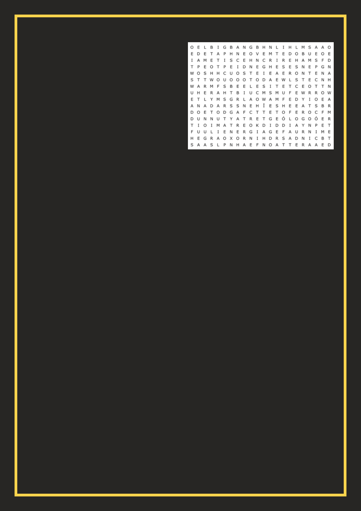 10 Caça Palavras: Universo As palavras deste caça palavras estão escondidas na horizontal, vertical e diagonal, sem palavras ao contrário. DICAS: 1. Teoria mais aceita sobre a formação do universo? 2. Padre conhecido por postular a teoria da pergunta acima. 3. Astrônomo que realizou os estudos que levaram em partes a essa teoria? 4. Parte do universo contida nas Galáxias? 5. Outra parte do Universo que por uma equação de Einstein se equivale a anterior 6. O que existe na maior parte do Universo (Obs: há controvérsias)? 7. Nome do sistema da nossa Galáxia em que está o nosso planeta? 8. Nome do Planeta habitado conhecido? 9. O Sol na verdade é uma: 10. Tipo de Corpo celeste conhecido por ter um que é visível na Terra a cada 75-76 anos. 11. Nome “científico” das estrelas cadentes? 12. Nome que damos há uma rocha cósmica encontrada na Terra? 13. Satélite natural do planeta habitado pelos dinossauros no período Mesozoico? 14. Melhor profissão? Caça palavras gerado em https://www.geniol.com.br/palavras/caca-palavras/criador 15. Tipo de observação que ajuda a identificar a composição de corpos distantes?