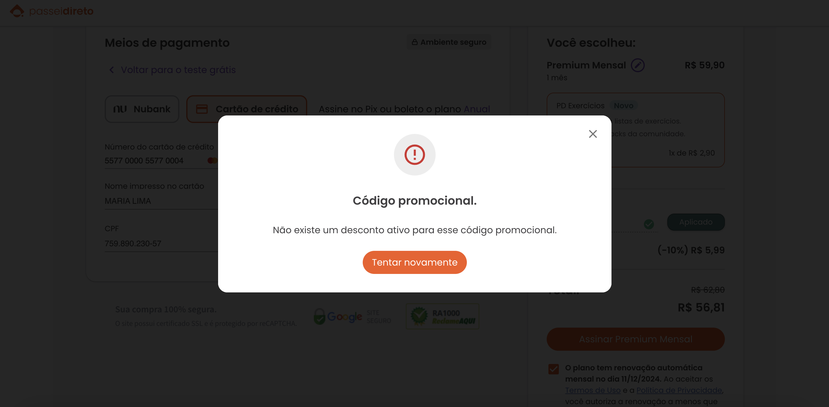 passeidireto Meios de pagamento Ambiente seguro Você escolheu: Premium Mensal R$
