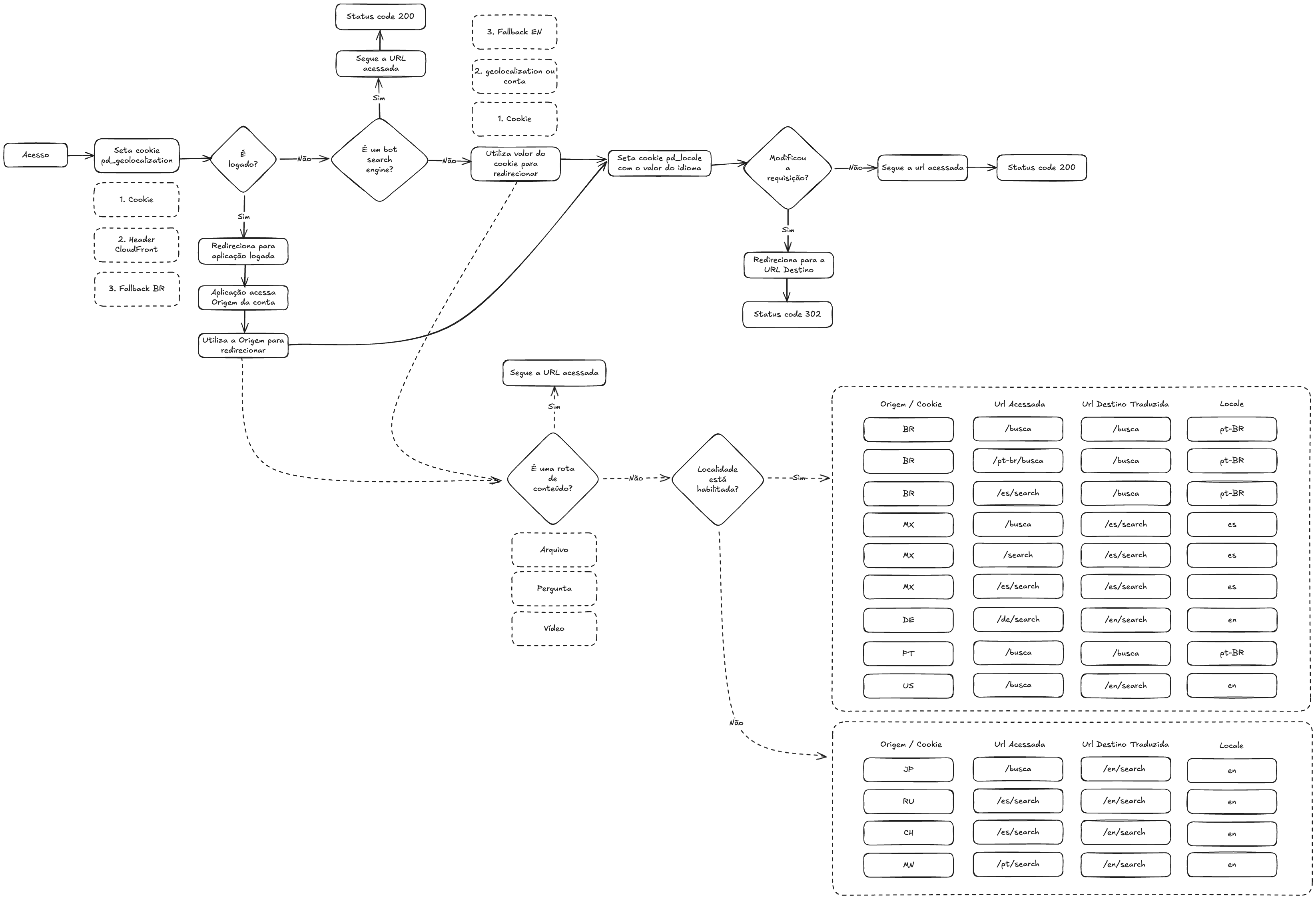 Status code 200 3. Fallback EN Segue URL acessada 2. geolocalization conta Sim 1. Seta cookie É um bot Acesso É Utiliza valor do pd_geolocalization Não search Não Seta cookie pd_locale Modificou logado? cookie para engine? com valor do idioma Não Segue a url acessada Status code 200 redirecionar requisição? 1. Cookie Sim Sim 2. Header Redireciona para aplicação logada Redireciona para a URL Destino 3. Fallback BR Aplicação acessa Origem da conta Status code 302 Utiliza Origem para redirecionar Segue a URL acessada Sim Origem / Cookie Url Acessada Url Destino Traduzida Locale BR /busca /busca pt-BR BR /pt-br/busca /busca pt-BR É uma rota Localidade de Não habilitada? BR /busca pt-BR MX /busca es Arquivo MX /search es Pergunta MX /es/search es DE /de/search /en/search en Video PT /busca /busca pt-BR /busca /en/search en Não Origem / Cookie Url Acessada Url Destino Traduzida Locale JP /busca /en/search en RU /en/search en CH /en/search en MN /pt/search /en/search en