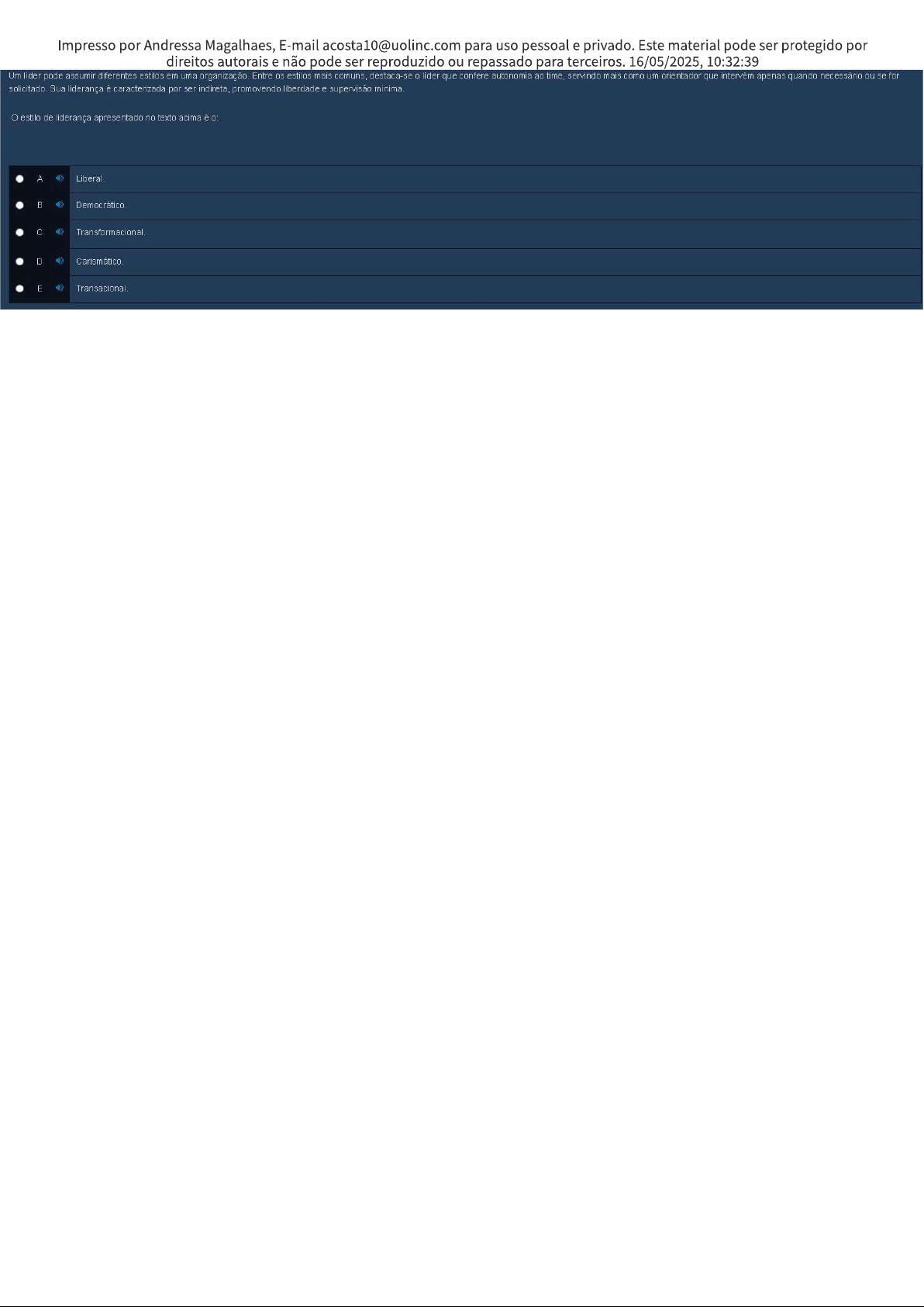 Impresso por Andressa Magalhaes, E-mail acosta10@uolinc.com para uso pessoal e privado. Este material pode ser protegido por direitos autorais e não pode ser reproduzido ou repassado para terceiros. 16/05/2025, 10:32:39 Um líder pode assumir diferentes estilos em uma Entre os estilos mais comuns, destaca-se líder que confere autonomia ao time, servindo mais como um orientador que intervém apenas quando necessário ou se for solicitado Sua liderança é caracterizada por ser indireta, promovendo liberdade e supervisão estilo de liderança apresentado no texto acima é A Liberal C D Carismático