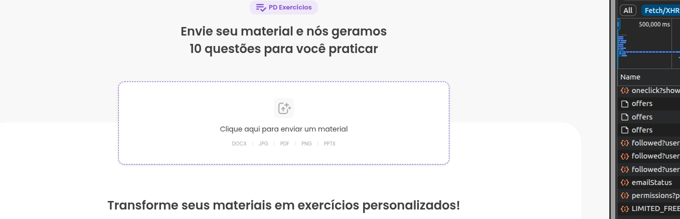 PD Exercícios All Fetch/XHR 500,000 ms Envie seu material e nós geramos 10 questões para você praticar Name oneclick?show offers offers Clique aqui para enviar um material offers DOCX JPG PDF PNG PPTX followed?user followed?user followed?user emailStatus permissions?p Transforme seus em exercícios personalizados! LIMITED_FREE