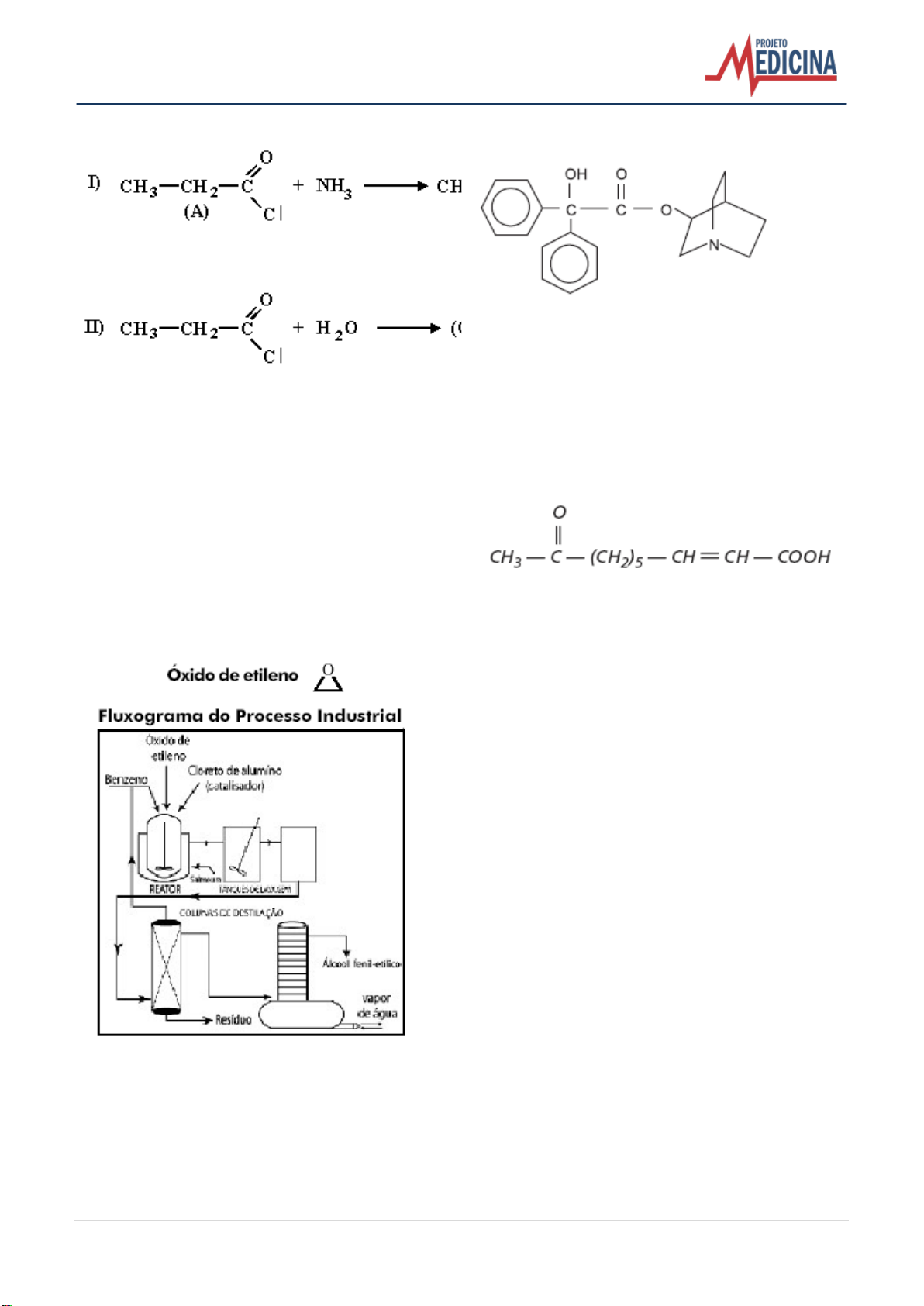 11 | Projeto Medicina – www.projetomedicina.com.br 48) (UFRJ-1998) As reações a seguir são exemplos de reações de substituição em derivados de ácidos carboxílicos: a) Identifique, na reação I, as funções orgânicas dos compostos (A) e (B). b) Escreva o nome do composto (C) da reação II. 49) (UFRJ-2003) Um dos isômeros do álcool fenil-etílico é um álcool primário muito empregado em formulações de perfumes. Esse composto possui aroma de rosas, ocorrendo nos óleos voláteis da rosa, da flor de laranjeira e de outras flores. Industrialmente, pode ser obtido a partir do óxido de etileno, como esquematizado no fluxograma a seguir. Escreva a fórmula em bastão e nomenclatura do isômero do óxido de etileno que apresenta grupamento carbonila. 50) (FGV-2005) A figura representa a fórmula estrutural da substância éster benzílico do quinuclidinol, conhecida como BZ, utilizada como arma química. Esta substância é um sólido que pode ser disperso na forma de um aerossol, produzindo alucinações, vertigem, perda de orientação e amnésia. Duas das funções orgânicas existentes na estrutura dessa substância são a) éter e amida. b) álcool e amina. c) fenol e éter. d) fenol e amida. e) cetona e amina. 51) (Vunesp-2005) As abelhas rainhas produzem um feromônio cuja fórmula é apresentada a seguir. a) Forneça o nome de duas funções orgânicas presentes na molécula deste feromônio. b) Sabe-se que um dos compostos responsáveis pelo poder regulador que a abelha rainha exerce sobre as demais abelhas é o isômero trans deste feromônio. Forneça as fórmulas estruturais dos isômeros cis e trans e identifique- os. 52) (Mack-2005) Um hábito comum é enrolar pencas de bananas e mamões verdes em jornal para que amadureçam mais rápidamente. Durante o amadurecimento das frutas, há a liberação de gás eteno, que também é responsável pela aceleração do processo. A respeito do gás eteno, é correto afirmar que Dado: massa molar (g/mol) H = 1, C = 12 a) é um hidrocarboneto aromático. b) é um alcano. c) tem massa molar 30,0g/mol. d) apresenta fórmula molecular C2H4 e é mais conhecido como gás etileno. e) tem fórmula estrutural H3C — CH3. 53) (FMTM-2005) O esteviosídeo, fórmula estrutural representada na figura, é um edulcorante natural extraído das folhas da stévia, uma planta latino-americana. 12 | Projeto Medicina – www.projetomedicina.com.br As funções orgânicas existentes na estrutura dessa substância são: (A) álcool, aldeído e cetona. (B) álcool, aldeído e éter. (C) álcool, éter e éster. (D) aldeído, éster e cetona. (E) éter, éster e cetona. 54) (FMTM-2005) O metanol pode ser obtido a partir da destilação da madeira, na ausência de ar, a 400oC, e o etanol, a partir da fermentação do açúcar da cana. Ambos os álcoois podem ser utilizados como combustível, principalmente o etanol. A oxidação do metanol e do etanol com dicromato de potássio, em meio ácido, pode resultar em compostos orgânicos que contenham as funções orgânicas (A) aldeído e ácido carboxílico. (B) aldeído e cetona. (C) cetona e ácido carboxílico. (D) éter e aldeído. (E) éter e ácido carboxílico. 55) (Mack-2005) De um silicone de fórmula ,fazem-se as afirmações I. É um polímero. II. Possui cadeia carbônica ramificada. III. É um produto intermediário entre a química orgânica e a química inorgânica. IV. Possui radicais metil ligados a átomos de silício. Estão corretas: a) I, III e IV, somente. b) I e IV, somente. c) II e III, somente. d) I, II, III e IV. e) I e III, somente. 56) (UFMG-2006) Observe este quadro, em que estão representadas quatro substâncias orgânicas . numeradas de I a IV . e os aromas a elas associados: Essas substâncias são usadas na indústria como aromatizantes sintéticos, no lugar de extratos das frutas correspondentes. Considerando-se as estruturas de cada uma dessas substâncias, é INCORRETO afirmar que A) III é um éster. B) I apresenta cadeia ramificada. C) IV é a mais volátil. D) II tem um grupo funcional aromático. 57) (UERJ-2006) O ácido barbitúrico e seus derivados são indicados como tranqüilizantes para reduzir a ansiedade e induzir o sono. A síntese desse ácido pode ser resumida pela seguinte equação: A) Identifique a função orgânica presente no ácido barbitúrico e apresente a estrutura em bastão do ácido carboxílico derivado do malonato de etila. B) Com base nos valores de eletronegatividade indicados na tabela de classificação periódica, determine os números de oxidação dos átomos de carbono indicados por 1 e 2 na molécula do ácido barbitúrico. 58) (UFPB-2006) O amido, a celulose e as proteínas são exemplos de polímeros naturais. Nos últimos 60 anos, os químicos têm produzido polímeros sintéticos, a exemplo dos compostos, abaixo representados.