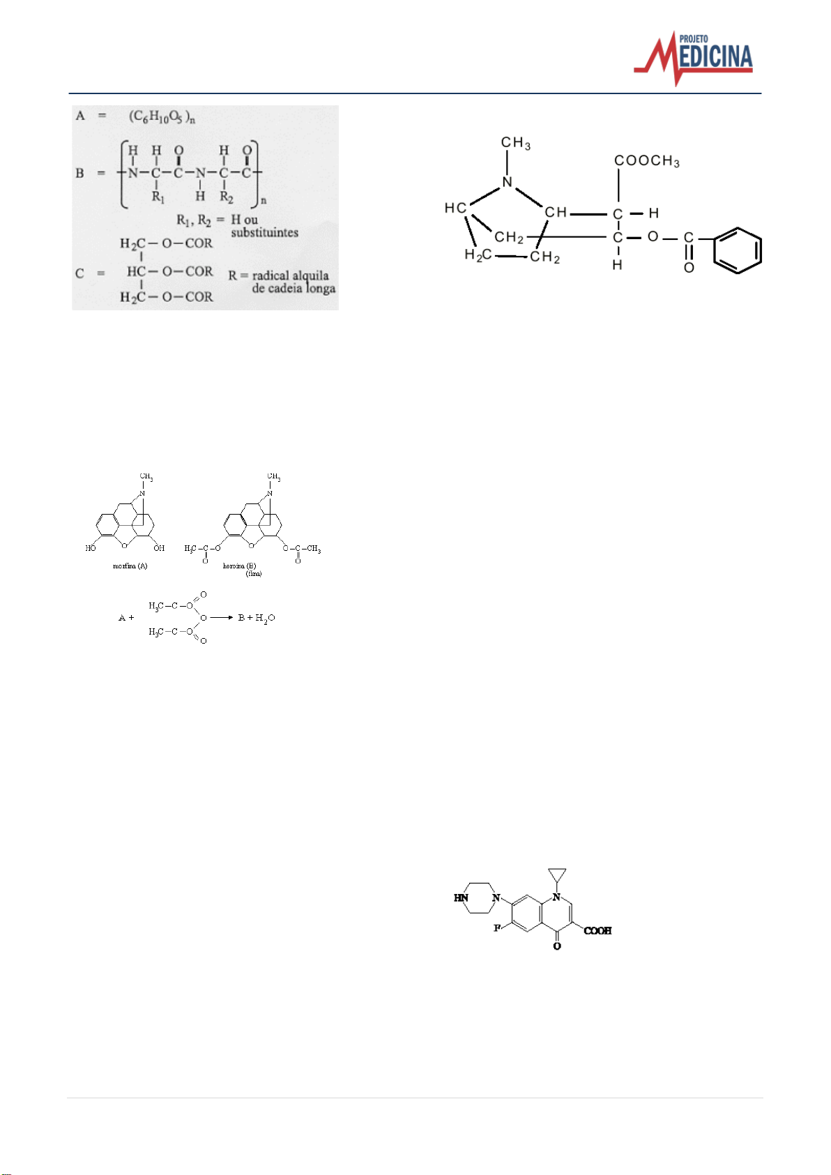 2 | Projeto Medicina – www.projetomedicina.com.br A, B e C são os constituintes nutricionais principais, respectivamente, dos alimentos: a) batata, óleo de cozinha e farinha de trigo. b) farinha de trigo, gelatina e manteiga. c) farinha de trigo, batata e manteiga. d) óleo de cozinha, manteiga e gelatina. e) óleo de cozinha, gelatina e batata. 7) (Fuvest-1999) A heroína (B) pode ser obtida a partir da morfina (A) por reação de esterilização: Com relação a essa reação, considere as seguintes afirmações: I) É preservado o anel aromático. II) É preservada a função amina. III) Reagem tanto os grupos -OH alcoólico quanto o -OH fenó1ico. Dessas afirmações: a) apenas a I é correta. b) apenas a II é correta. c) apenas a III é correta. d) apenas a I e a II são corretas. e) a I, a II e a III são corretas. 8) (Unirio-1999) Em 1886, um farmacêutico americano começou a comercializar uma bebida preparada com extratos de duas plantas, Cola acuminata e Erythroxylon coca. Por sugestão de seu sócio, a bebida foi denominada Coca-Cola. Em 1902, o uso do extrato de E. coca, nesta bebida, foi proibido por conter cocaína, substância utilizada na época como anestésico local e atualmente de uso ilícito, por causar dependência. Na estrutura da cocaína apresentada acima estão presentes os grupos funcionais: A) amina e álcool. B) amina e éster. C) amida e éster. D) cetona e fenol. E) ácido e amida. 9) (Unirio-1999) "Quanto mais se investiga mais assustador fica o escândalo dos remédios falsificados. (...) A empresa é acusada de ter produzido quase 1milhão de comprimidos de farinha como sendo o medicamento Androcur, usado no tratamento de câncer de próstata." Revista Veja, setembro de 1998. O principal componente químico da farinha é o amido, que é um: A) lipídio. B) poliéter. C) peptídeo. D) poliéster. E) polissacarídio. 10) (Fuvest-2002) Para combater o carbúnculo, também chamado antraz, é usado o antibacteriano ciprofloxacina, cuja fórmula estrutural é: Na molécula desse composto, há a) ligação peptídica e halogênio. b) grupo ciclopropila e ligação peptídica. c) anel aromático e grupo nitro. d) anel aromático e ligação peptídica. e) anel aromático e grupo carboxila. 3 | Projeto Medicina – www.projetomedicina.com.br 11) (Mack-2002) Dos compostos I e II acima, é INCORRETO afirmar que: a) I é umaldeído. b) II é uma cetona. c) I e II são isômeros de cadeia. d) I e II são isômeros de função. e) o nome comercial de II é acetona. 12) (PUC - RS/1-2000) 9) Considerando a estrutura do ácido salicílico, usado na preparação do salicilato de sódio, analgésico e antipirético, selecione a alternativa que apresenta as palavras que completam corretamente as lacunas no texto a seguir. O ácido salicílico pode ser considerado uma molécula de ________ com um grupo ________. A) aldeído fenólico B) cetona carbonila C) fenol carboxila D) álcool E) éster 13) (UFMG-1998) Considere as estruturas moleculares do naftaleno e da decalina, representadas pelas fórmulas abaixo. Substituindo, em ambas as moléculas, um átomo de hidrogênio por um grupo hidroxila (OH), obtêm-se dois compostos que pertencem, respectivamente, às funções A) fenol e fenol. B) álcool e ácool. C) fenol e álcool. D) álcool e fenol 14) (Uniube-2001) A capsaicina, cuja fórmula estrutural simplificada está mostrada abaixo, é uma das responsáveis pela sensação picante provocada pelos frutos e sementes da pimenta-malagueta (Capsicum sp.). Na estrutura da capsaicina, encontram-se as seguintes funções orgânicas: A) amina, cetona e éter. B) amida, fenol e éter. C) amida, álcool e éster. D) amina, fenol e éster. 15) (PUC-MG-2001) A adrenalina de fórmula é nome da epinefrina, hormônio das supra-renais que acelera os batimentos cardíacos, com aumento da pressão arterial. É usada na medicina para deter crises asmáticas e alérgicas. Na sua estrutura, observam-se as funções: a) fenol, éter e amina b) álcool, éster e amina c) fenol, álcool e amida d) fenol, álcool e amina 16) (UFRJ-2002) O olfato dos seres humanos e de outros animais depende da existência de receptores sensoriais que respondam à presença de moléculas de substâncias odorantes no ar respirado. Os receptores olfativos (RO) estão localizados na cavidade nasal em um tecido denominado epitélio olfativo. A tabela a seguir apresenta alguns resultados obtidos de estudos realizados com uma seção do epitélio olfativo de ratos para três famílias de compostos orgânicos. Na tabela, as quadrículas assinaladas em vermelho indicam a existência de resposta positiva de um determinado RO a uma dada substância odorante. Dê os nomes IUPAC do álcool e do composto halogenado que apresentam os maiores números de respostas positivas dos RO. 4 | Projeto Medicina – www.projetomedicina.com.br 17) (Vunesp-2003) Muitos compostos orgânicos sintéticos fazem parte de nosso cotidiano, tendo as mais diversas aplicações. Por exemplo, a aspirina, que é muito utilizada como analgésico e antitérmico. a) Escreva o nome de um grupo funcional presente na molécula da aspirina. b) A hidrólise da aspirina leva à formação de ácido salicílico (ácido 2-hidroxibenzóico) e de um outro ácido. Escreva a fórmula e o nome deste ácido. 18) (UFSCar-2003) O aspartame, estrutura representada a seguir, é uma substância que tem sabor doce ao paladar. Pequenas quantidades dessa substância são suficientes para causar a doçura aos alimentos preparados, já que esta é cerca de duzentas vezes mais doce do que a sacarose. As funções orgânicas presentes na molécula desse adoçante são, apenas, a) éter, amida, amina e cetona. b) éter, amida, amina e ácido carboxílico. c) aldeído, amida, amina e ácido carboxílico. d) éster, amida, amina e cetona. e) éster, amida, amina e ácido carboxílico. 19) (UFSCar-2002) A epinefrina (adrenalina), fórmula estrutural representada na figura, é uma