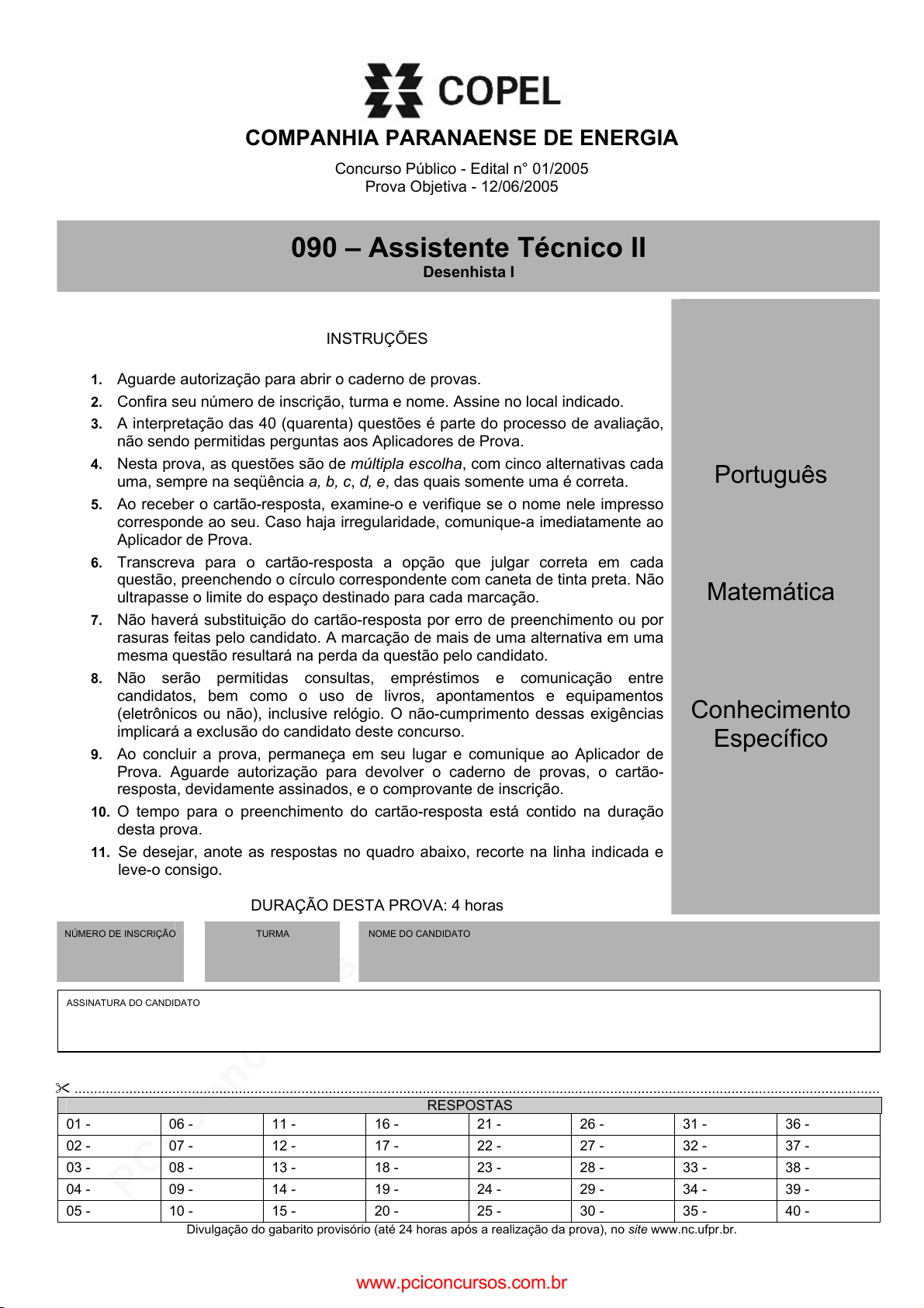 pcimarkpci MjgwNDowN2YxOmUyMjQ6MmY0ZjowZDRmOmZhNmM6NzUwODoyN2Ex:VHVlLCAzMCBTZXAgMjAyNSAxMToyMDoxNSAtMDMwMA== www.pciconcursos.com.br COMPANHIA PARANAENSE DE ENERGIA Concurso Público - Edital n° 01/2005 Prova Objetiva - 12/06/2005 090 – Assistente Técnico II Desenhista I INSTRUÇÕES 1. Aguarde autorização para abrir o caderno de provas. 2. Confira seu número de inscrição, turma e nome. Assine no local indicado. 3. A interpretação das 40 (quarenta) questões é parte do processo de avaliação, não sendo permitidas perguntas aos Aplicadores de Prova. 4. Nesta prova, as questões são de múltipla escolha, com cinco alternativas cada uma, sempre na seqüência a, b, c, d, e, das quais somente uma é correta. 5. Ao receber o cartão-resposta, examine-o e verifique se o nome nele impresso corresponde ao seu. Caso haja irregularidade, comunique-a imediatamente ao Aplicador de Prova. 6. Transcreva para o cartão-resposta a opção que julgar correta em cada questão, preenchendo o círculo correspondente com caneta de tinta preta. Não ultrapasse o limite do espaço destinado para cada marcação. 7. Não haverá substituição do cartão-resposta por erro de preenchimento ou por rasuras feitas pelo candidato. A marcação de mais de uma alternativa em uma mesma questão resultará na perda da questão pelo candidato. 8. Não serão permitidas consultas, empréstimos e comunicação entre candidatos, bem como o uso de livros, apontamentos e equipamentos (eletrônicos ou não), inclusive relógio. O não-cumprimento dessas exigências implicará a exclusão do candidato deste concurso. 9. Ao concluir a prova, permaneça em seu lugar e comunique ao Aplicador de Prova. Aguarde autorização para devolver o caderno de provas, o cartão- resposta, devidamente assinados, e o comprovante de inscrição. 10. O tempo para o preenchimento do cartão-resposta está contido na duração desta prova. 11. Se desejar, anote as respostas no quadro abaixo, recorte na linha indicada e leve-o consigo. DURAÇÃO DESTA PROVA: 4 horas Português Matemática Conhecimento Específico NÚMERO DE INSCRIÇÃO TURMA NOME DO CANDIDATO ASSINATURA DO CANDIDATO .............................................................................................................................................................................................................. RESPOSTAS 01 - 06 - 11 - 16 - 21 - 26 - 31 - 36 - 02 - 07 - 12 - 17 - 22 - 27 - 32 - 37 - 03 - 08 - 13 - 18 - 23 - 28 - 33 - 38 - 04 - 09 - 14 - 19 - 24 - 29 - 34 - 39 - 05 - 10 - 15 - 20 - 25 - 30 - 35 - 40 - Divulgação do gabarito provisório (até 24 horas após a realização da prova), no site www.nc.ufpr.br. www.pciconcursos.com.br pcimarkpci MjgwNDowN2YxOmUyMjQ6MmY0ZjowZDRmOmZhNmM6NzUwODoyN2Ex:VHVlLCAzMCBTZXAgMjAyNSAxMToyMDoxNSAtMDMwMA== www.pciconcursos.com.brwww.pciconcursos.com.br pcimarkpci MjgwNDowN2YxOmUyMjQ6MmY0ZjowZDRmOmZhNmM6NzUwODoyN2Ex:VHVlLCAzMCBTZXAgMjAyNSAxMToyMDoxNSAtMDMwMA== www.pciconcursos.com.br 3 PORTUGUÊS O texto a seguir é referência para as questões 01 e 02. Quem não tem e-mail é sub-cidadão Pesquisa Datafolha informa que, neste ano, cerca de 25 milhões de brasileiros acima de 16 anos já acessam a internet. Não é pouca coisa, levando em conta que a população brasileira é de 180 milhões de habitantes, dos quais uma expressiva parcela é de pobres, analfabetos ou semi-analfabetos. A linha da exclusão social pode ser medida também pelos com ou sem-mail. Isso porque ter ou não acesso à Internet define a capacidade de o indivíduo protestar ou se posicionar diretamente com o poder público e privado. É um jeito de chegar direto, sem intermediários, ao deputado ou senador, por exemplo. Por isso, um dos atentados contra a cidadania brasileira é, até agora, não terem usado um único dos R$ 4 bilhões arrecadados dos usuários das telecomunicações para promover inclusão digital. É um absurdo nos mais diferentes sentidos. Abuso pela mentira pública (pegar um dinheiro e não usar); abuso porque educação deveria ser a prioridade das prioridades no país. (Gilberto Dimenstein, Folha Online, 27 abr. 2005.) 01 - Dimenstein justifica a importância de um maior número de pessoas ter acesso à Internet e, conseqüentemente, ao e- mail, assentado no fato de que esse acesso: a) aumenta o percentual de usuários e essa estatística define o progresso de uma nação. b) diminui o percentual de analfabetos e semi-analfabetos. c) estimula as empresas de telecomunicações a cobrar menos impostos. d) possibilita um exercício mais efetivo da cidadania. e) melhora as condições de aprendizagem em sala de aula. 02 - No título, o autor usa a palavra sub-cidadão. Tendo como fonte o dicionário Aurélio, apresentamos o princípio geral do emprego do hífen e, em seguida, a norma que rege o uso desse sinal gráfico com o prefixo sub-. Princípio geral: Só se ligam por hífen os elementos das palavras compostas em que se mantém a noção de composição, isto é, os elementos das palavras compostas que mantêm a sua independência fonética, conservando cada um a sua própria acentuação, porém formando o conjunto perfeita unidade de sentido. Ab, ad, ob, sob e sub, quando seguidos de elementos iniciados por r: ab-rogar, ad-renal, ob-reptício, sob-roda, sub-reino, etc. Tendo em vista que se deve observar primeiro o princípio geral para depois aplicar a regra, a composição de sub+cidadão, segundo as normas, deve ser feita sem hífen, porque: a) na palavra sub+cidadão, o segundo elemento da composição não mantém independência fonética. b) a composição de sub+cidadão obedece às exigências do princípio geral, mas o segundo elemento não começa por r. c) o segundo elemento de sub+cidadão não conserva a acentuação própria. d) a palavra sub+cidadão não consta da relação de exemplos que se grafam com hífen. e) o composto não forma uma unidade de sentido. 03 - Em que alternativa a substituiçã