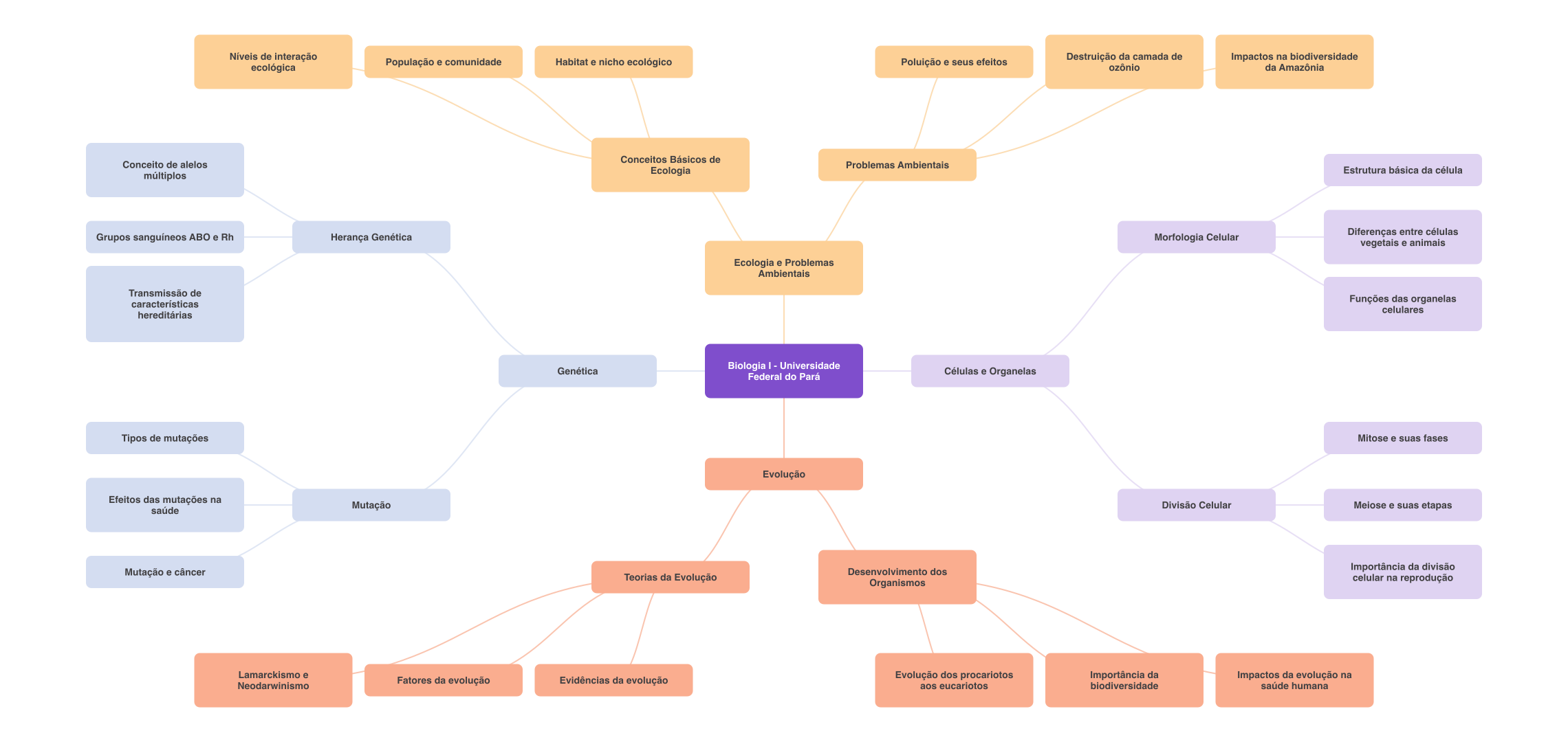Níveis de interação População e comunidade Habitat e nicho ecológico Poluição e seus efeitos Destruição da camada de Impactos na biodiversidade ecológica ozônio da Amazônia Conceitos Básicos de Conceito de alelos Problemas Ambientais Ecologia Estrutura básica da célula múltiplos Diferenças entre células Grupos sanguíneos ABO e Rh Herança Genética Morfologia Celular vegetais e animais Ecologia e Problemas Ambientais Transmissão de características Funções das organelas celulares hereditárias Genética Biologia Universidade Federal do Pará Células e Organelas Tipos de mutações Mitose e suas fases Evolução Efeitos das mutações na Mutação Divisão Celular saúde Meiose e suas etapas Mutação câncer Desenvolvimento dos Importância da divisão Teorias da Evolução Organismos celular na reprodução Lamarckismo e Fatores da evolução Evidências da evolução Evolução dos procariotos Importância da Impactos da evolução na Neodarwinismo aos eucariotos biodiversidade saúde humana