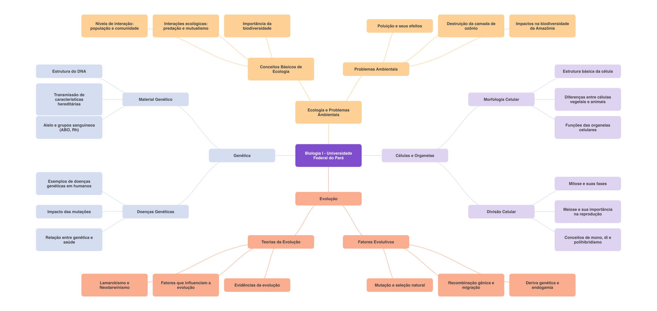 Níveis de interação: Interações ecológicas: Importância da Poluição e seus efeitos Destruição da camada de Impactos na biodiversidade população e comunidade predação e mutualismo biodiversidade ozônio da Amazônia Conceitos Básicos de Problemas Ambientais Estrutura do DNA Ecologia Estrutura básica da célula Transmissão de Material Genético Diferenças entre células características Morfologia Celular hereditárias vegetais e animais Ecologia e Problemas Ambientais Alelo e grupos sanguíneos Funções das organelas (ABO, Rh) celulares Genética Biologia Universidade Federal do Pará Células e Organelas Exemplos de doenças Mitose e suas fases genéticas em humanos Evolução Impacto das mutações Doenças Genéticas Divisão Celular Meiose e sua importância na reprodução Relação entre genética e Conceitos de mono, di e saúde Teorias da Evolução Fatores Evolutivos polihibridismo Lamarckismo e Fatores que influenciam a Evidências da evolução Recombinação gênica e Mutação e seleção natural Deriva genética e Neodarwinismo evolução migração endogamia