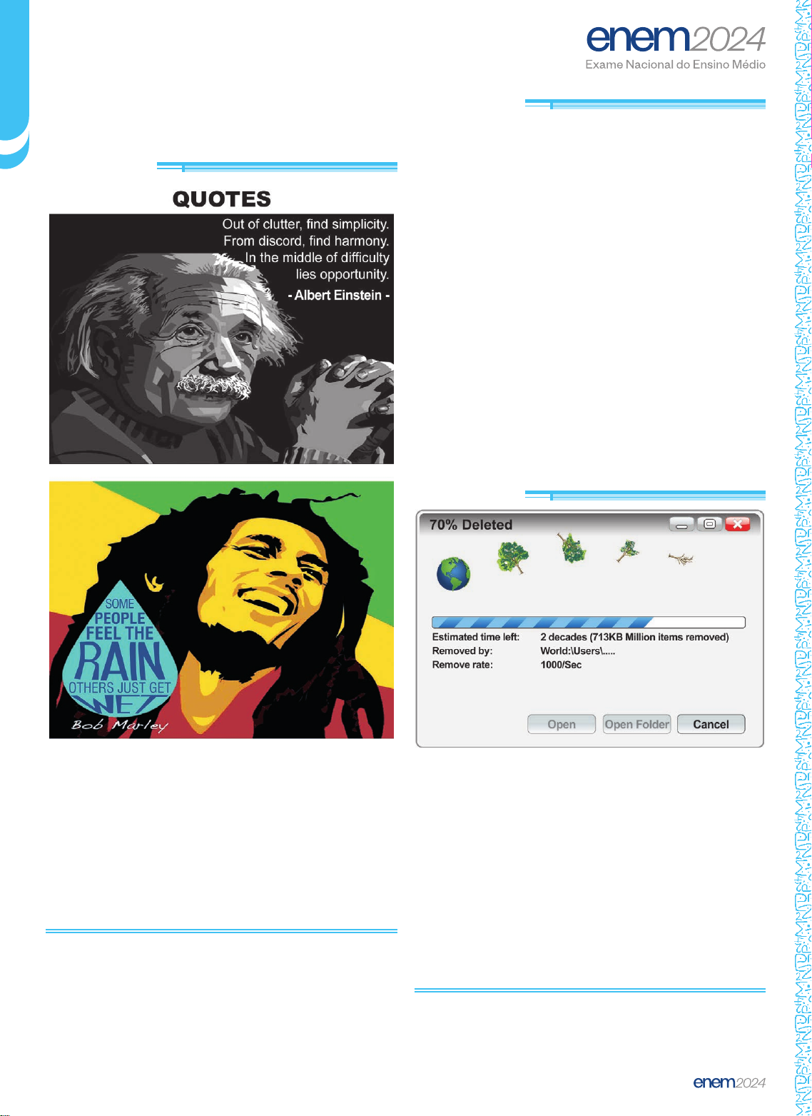 LINGUAGENS, CÓDIGOS E SUAS TECNOLOGIAS Questões de 01 a 45 Questões de 01 a 05 (opção inglês) QUESTÃO 01 Disponível em: http://thumbpress.com. Acesso em: 28 out. 2013. A relação entre as citações atribuídas ao físico Albert Einstein e ao cantor e compositor Bob Marley reside na crença de que é necessário A dar oportunidade a pessoas que parecem necessitadas. B identificar contextos que podem representar perigo. C tirar proveito de situações que podem ser adversas. D evitar dificuldades que parecem ser intransponíveis. E contestar circunstâncias que parecem ser harmônicas. QUESTÃO 02 Holy War Oh, so we can hate each other and fear each other We can build these walls between each other Baby, blow by blow and brick by brick Keep yourself locked in, yourself locked in […] Oh, maybe we should love somebody Oh, maybe we could care a little more So maybe we should love somebody Instead of polishing the bombs of holy war KEYS, A. Here. Estados Unidos: RCA Records, 2016. Nessa letra de canção, que aborda um contexto de ódio e intolerância, o marcador “instead of ” introduz a ideia de A mudança de comportamento. B panorama de conflitos. C rotina de isolamento. D perspectiva bélica. E cenário religioso. QUESTÃO 03 Disponível em: www.hongkiat.com. Acesso em: 18 ago. 2017 (adaptado). O texto estabelece uma relação entre elementos da natureza e comandos de um programa de computador para A alertar as pessoas sobre a rápida destruição da natureza. B conscientizar os indivíduos sobre a passagem acelerada do tempo. C apresentar aos leitores os avanços tecnológicos na área da agricultura. D orientar os usuários sobre o emprego sustentável das novas tecnologias. E informar os interessados sobre o tempo de crescimento de novas árvores. *010175AZ2* ENEM2024ENEM2024ENEM2024ENEM2024ENEM2024ENEM2024ENEM2024ENEM2024ENEM2024ENEM2024ENEM2024ENEM2024ENEM2024ENEM2024ENEM2024ENEM2024ENEM2024ENEM2024ENEM2024ENEM2024ENEM2024ENEM2024ENEM2024ENEM2024ENEM2024ENEM2024ENEM20E4ENEM2024ENEM2024ENEM2024ENEM2024ENEM2024ENEM2024ENEM2024ENEM2024ENEM2024ENEM2024ENEM2024ENEM2024ENEM2024ENEM2024ENEM2024ENEM2024ENEM2024ENEM2024ENEM2024ENEM2024ENEM2024ENEM2024ENEM2024ENEM2024ENEM2024ENEM2024ENEM2024 ENEM2024ENEM2024ENEM2024ENEM2024ENEM2024ENEM2024ENEM2024ENEM2024ENEM2024ENEM2024ENEM2024ENEM2024ENEM2024ENEM2024ENEM2024ENEM2024ENEM2024ENEM2024ENEM2024ENEM2024ENEM2024ENEM2024ENEM2024ENEM2024ENEM2024ENEM2024ENEM20E4ENEM2024ENEM2024ENEM2024ENEM2024ENEM2024ENEM2024ENEM2024ENEM2024ENEM2024ENEM2024ENEM2024ENEM2024ENEM2024ENEM2024ENEM2024ENEM2024ENEM2024ENEM2024ENEM2024ENEM2024ENEM2024ENEM2024ENEM2024ENEM2024ENEM2024ENEM2024ENEM2024 EN EM 20 24 EN EM 20 24 EN EM 20 24 EN EM 20 24 EN EM 20 24 EN EM 20 24 EN EM 20 24 EN EM 20 24 EN EM 20 24 EN EM 20 24 EN EM 20 24 EN EM 20 24 EN EM 20 24 EN EM 20 24 EN EM 20 24 EN EM 20 24 EN EM 20 24 EN EM 20 24 EN EM 20 24 EN EM 20 24 EN EM 20 24 EN EM 20 24 EN EM 20 24 EN EM 20 24 EN EM 20 24 EN EM 20 24 EN EM 20 24 EN EM 20 24 EN EM 20 24 EN EM 20 24 EN EM 20 24 EN EM 20 24 EN EM 20 24 EN EM 20 24 EN EM 20 24 EN EM 20 24 EN EM 20 24 EN EM 20 24 EN EM 20 24 EN EM 20 24 EN EM 20 24 EN EM 20 24 EN EM 20 24 EN EM 20 24 EN EM 20 24 EN EM 20 24 EN EM 20 24 EN EM 20 24 EN EM 20 24 EN EM 20 24 EN EM 20 24 EN EM 20 24 EN EM 20 24 EN EM 20 24 EN EM 20 24 EN EM 20 24 EN EM 20 24 EN EM 20 24 EN EM 20 24 EN EM 20 24 EN EM 20 24 EN EM 20 24 EN EM 20 24 EN EM 20 24 EN EM 20 24 EN EM 20 24 EN EM 20 24 EN EM 20 24 EN EM 20 24 EN EM 20 24 EN EM 20 24 EN EM 20 24 EN EM 20 24 EN EM 20 24 EN EM 20 24 LINGUAGENS, CÓDIGOS E SUAS TECNOLOGIAS E REDAÇÃO • 1º DIA • CADERNO 1 • AZUL •2 010175AZ.indb 2010175AZ.indb 2 23/08/2024 16:46:4323/08/2024 16:46:43