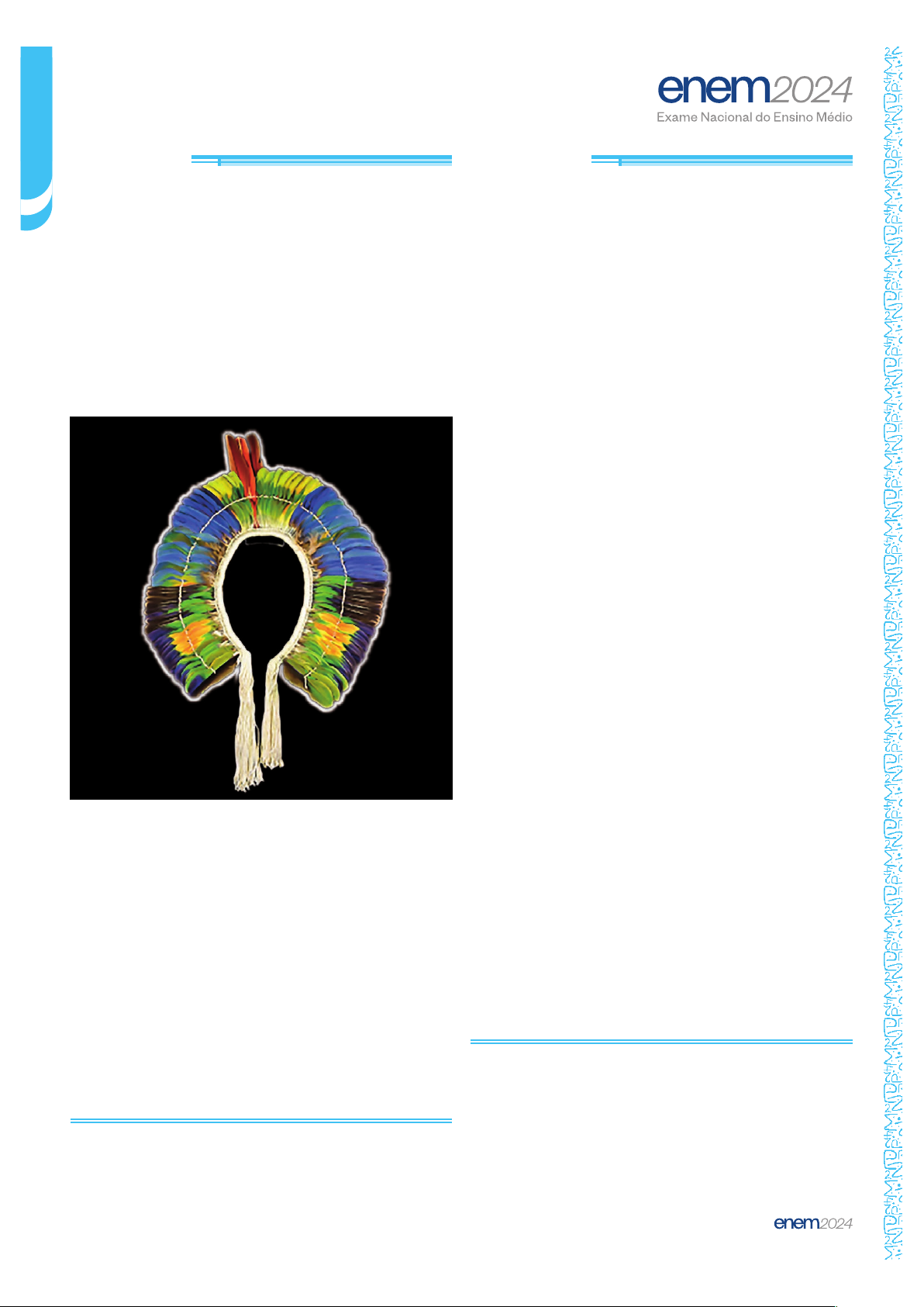 QUESTÃO 21 TEXTO I A linguagem visual dos adornos transmite informações sobre prestígio e transgressão, direito e dever, pois só é permitido ao indivíduo o uso de adornos de sua linhagem. Quando diretamente vinculadas aos conceitos cosmológicos, as artes indígenas convertem-se antes em prismas que refletem as concepções acerca da composição do universo e dos componentes que o povoam. AGUILAR, N. (Org.); DIAS, J. A. B. F.; VELTHEN, L. H. V. Mostra do redescobrimento: artes indígenas. São Paulo: Fundação Bienal de São Paulo-Associação Brasil 500 anos, 2000 (adaptado). TEXTO II Diadema (etnia Kayapó). Estados do Mato Grosso e Pará. Museu de Arte Indígena, s.d. Disponível em: www.maimuseu.com.br. Acesso em: 11 jul. 2024. Pela leitura desses textos, infere-se que a compreensão da arte plumária indígena requer a consideração da A indistinção hierárquica entre os membros de um mesmo grupo social. B prevalência dos elementos do mundo natural sobre as relações humanas. C reconfiguração constante das representações coletivas acerca do universo. D indeterminação entre as noções de identidade individual e de identidade cultural. E indissociabilidade entre objetos ritualísticos e os papéis dos indivíduos na comunidade. QUESTÃO 22 TEXTO I Capítulo 4, versículo 3 Minha palavra vale um tiro, eu tenho muita munição Na queda ou na ascensão, minha atitude vai além E tem disposição pro mal e pro bem Talvez eu seja um sádico ou um anjo, um mágico Ou juiz, ou réu, o bandido do céu Malandro ou otário, quase sanguinário Franco atirador se for necessário Revolucionário, insano, ou marginal Antigo e moderno, imortal Fronteira do céu com o inferno Astral imprevisível, como um ataque cardíaco do verso. RACIONAIS MCs. Sobrevivendo ao inferno. São Paulo: Cosa Nostra, 1997 (fragmento). TEXTO II Pode-se dizer que as várias experiências narradas nos discos do Racionais tratam no fundo de um só tema: a violência que estrutura a nossa sociedade. O grupo canta a violência que estrutura as relações entre os familiares, os amigos, o homem e a mulher, o traficante e o viciado. Canta a violência do crime. A violência causada por inveja ou por vaidade. Também canta que a relação entre as classes sociais é sempre violenta: o racismo, a miséria, os baixos salários, a concentração de renda, a esmola, a publicidade, o alcoolismo, o jornalismo, o poder policial, a justiça, o sistema penitenciário, o governo existem por meio da violência. GARCIA, W. Ouvindo Racionais MCs. Teresa: revista de literatura brasileira, n. 5, 2004 (adaptado). Na letra da canção, a tematização da violência mencionada no Texto II manifesta-se A como metáfora da desigualdade, que associa a ideia de justiça a valores históricos negativos. B na referência a termos bélicos, que sinaliza uma crítica social à opressão da população das periferias. C como procedimento metalinguístico, que concebe a palavra como uma forma de combate e insubordinação. D nas definições ambíguas do enunciador, que inverte e relativiza as representações da maldade e da bondade. E na menção à imortalidade, que sugere a possibilidade de resistência para além da dicotomia entre vida e morte. *010175AZ10* ENEM2024ENEM2024ENEM2024ENEM2024ENEM2024ENEM2024ENEM2024ENEM2024ENEM2024ENEM2024ENEM2024ENEM2024ENEM2024ENEM2024ENEM2024ENEM2024ENEM2024ENEM2024ENEM2024ENEM2024ENEM2024ENEM2024ENEM2024ENEM2024ENEM2024ENEM2024ENEM20E4ENEM2024ENEM2024ENEM2024ENEM2024ENEM2024ENEM2024ENEM2024ENEM2024ENEM2024ENEM2024ENEM2024ENEM2024ENEM2024ENEM2024ENEM2024ENEM2024ENEM2024ENEM2024ENEM2024ENEM2024ENEM2024ENEM2024ENEM2024ENEM2024ENEM2024ENEM2024ENEM2024 ENEM2024ENEM2024ENEM2024ENEM2024ENEM2024ENEM2024ENEM2024ENEM2024ENEM2024ENEM2024ENEM2024ENEM2024ENEM2024ENEM2024ENEM2024ENEM2024ENEM2024ENEM2024ENEM2024ENEM2024ENEM2024ENEM2024ENEM2024ENEM2024ENEM2024ENEM2024ENEM20E4ENEM2024ENEM2024ENEM2024ENEM2024ENEM2024ENEM2024ENEM2024ENEM2024ENEM2024ENEM2024ENEM2024ENEM2024ENEM2024ENEM2024ENEM2024ENEM2024ENEM2024ENEM2024ENEM2024ENEM2024ENEM2024ENEM2024ENEM2024ENEM2024ENEM2024ENEM2024ENEM2024 E N E M 20 24 E N E M 20 24 E N E M 20 24 E N E M 20 24 E N E M 20 24 E N E M 20 24 E N E M 20 24 E N E M 20 24 E N E M 20 24 E N E M 20 24 E N E M 20 24 E N E M 20 24 E N E M 20 24 E N E M 20 24 E N E M 20 24 E N E M 20 24 E N E M 20 24 E N E M 20 24 E N E M 20 24 E N E M 20 24 E N E M 20 24 E N E M 20 24 E N E M 20 24 E N E M 20 24 E N E M 20 24 E N E M 20 24 E N E M 20 24 E N E M 20 24 E N E M 20 24 E N E M 20 24 E N E M 20 24 E N E M 20 24 E N E M 20 24 E N E M 20 24 E N E M 20 24 E N E M 20 24 E N E M 20 24 E N E M 20 24 E N E M 20 24 E N E M 20 24 E N E M 20 24 E N E M 20 24 E N E M 20 24 E N E M 20 24 E N E M 20 24 E N E M 20 24 E N E M 20 24 E N E M 20 24 E N E M 20 24 E N E M 20 24 E N E M 20 24 E N E M 20 24 E N E M 20 24 E N E M 20 24 E N E M 20 24 E N E M 20 24 E N E M 20 24 E N E M 20 24 E N E M 20 24 E N E M 20 24 E N E M 20 24 E N E M 20 24 E N E M 20 24 E N E M 20 24 E N E M 20 24 E N E M 20 24 E N E M 20 24 E N E M 20 24 E N E M 20 24 E N E M 20 24 E N E M 20 24 E N E M 20 24 E N E M 20 24 E N E M 20 24 E N E M 20 24 LINGUAGENS, CÓDIGOS E SUAS TECNOLOGIAS E REDAÇÃO • 1º DIA • CADERNO 1 • AZUL •10 QUESTÃO 23 As reações à sétima temporada foram o ápice do último estágio em Game of Thrones. De forma alguma, este que vos fala seria capaz de argumentar que a série é perfeita, mas os defeitos que existem aqui sempre existiram, de uma forma ou de outra, durante os sete anos em que ela esteve no ar. Os dois roteiristas foram brilhantes em traduzir os personagens intrincados e conflituosos da obra de George R. R. Martin, mas nunca souberam exatamente como fazer jus a eles (e especialmente a elas, as mulheres da trama). A verdade é que, com tudo isso e mais Ramin Djawadi evocando sentimentos e ambientes improváveis com sua trilha sonora magistral, a série não conseguiria ser ruim nem se tentasse,