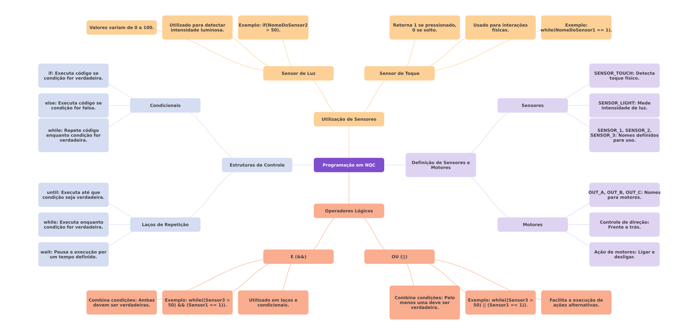 Valores variam de 0 a 100. Utilizado para detectar Exemplo: if(NomeDoSensor2 Retorna 1 se pressionado, Usado para interações Exemplo: intensidade luminosa. > 50). 0 se solto. físicas. while(NomeDoSensor1 == 1) if: Executa código se Sensor de Luz Sensor de Toque SENSOR TOUCH: Detecta condição for verdadeira. toque físico. else: Executa código se SENSOR LIGHT: Mede Condicionais Sensores condição for falsa. intensidade de luz. Utilização de Sensores while: Repete código SENSOR_1, SENSOR 2, enquanto condição for SENSOR_ 3: Nomes definidos verdadeira. para uso. Estruturas de Controle Programação em NQC Definição de Sensores e Motores until: Executa até que OUT_A, OUT_B, OUT_C: Nomes condição seja verdadeira. para motores. Operadores Lógicos while: Executa enquanto Laços de Repetição Motores Controle de direção: condição for verdadeira. Frente e trás. wait: Pausa a execução por Ação de motores: Ligar e um tempo definido. E (&&) OU (||) desligar. Combina condições: Ambas Exemplo: while((Sensor3 > Utilizado em laços e Combina condições: Pelo menos uma deve ser Exemplo: while((Sensor3 > Facilita a execução de devem ser verdadeiras. 50) && (Sensor1 == 1)). condicionais. verdadeira. 50) II (Sensor1 == 1)). ações alternativas.