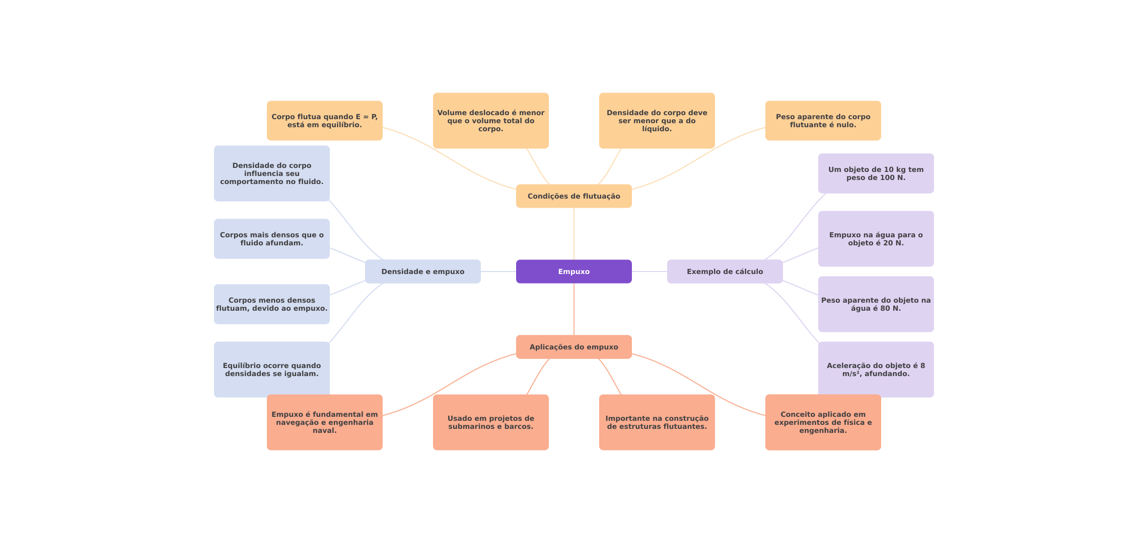 Volume deslocado é menor Corpo flutua quando E = P, Densidade do corpo deve está em equilíbrio. que volume total do ser menor que a do Peso aparente do corpo flutuante é nulo. corpo. líquido. Densidade do corpo influencia seu Um objeto de 10 kg tem comportamento no fluido. peso de 100 N. Condições de flutuação Corpos mais densos que Empuxo na água para fluido afundam. objeto é 20 N. Densidade e empuxo Empuxo Exemplo de cálculo Corpos menos densos Peso aparente do objeto na flutuam, devido ao empuxo. água é 80 N. Aplicações do empuxo Equilíbrio ocorre quando Aceleração do objeto é 8 densidades se igualam. afundando. Empuxo é fundamental em navegação e engenharia Usado em projetos de Importante na construção Conceito aplicado em submarinos e barcos. de estruturas flutuantes. experimentos de física e naval. engenharia.