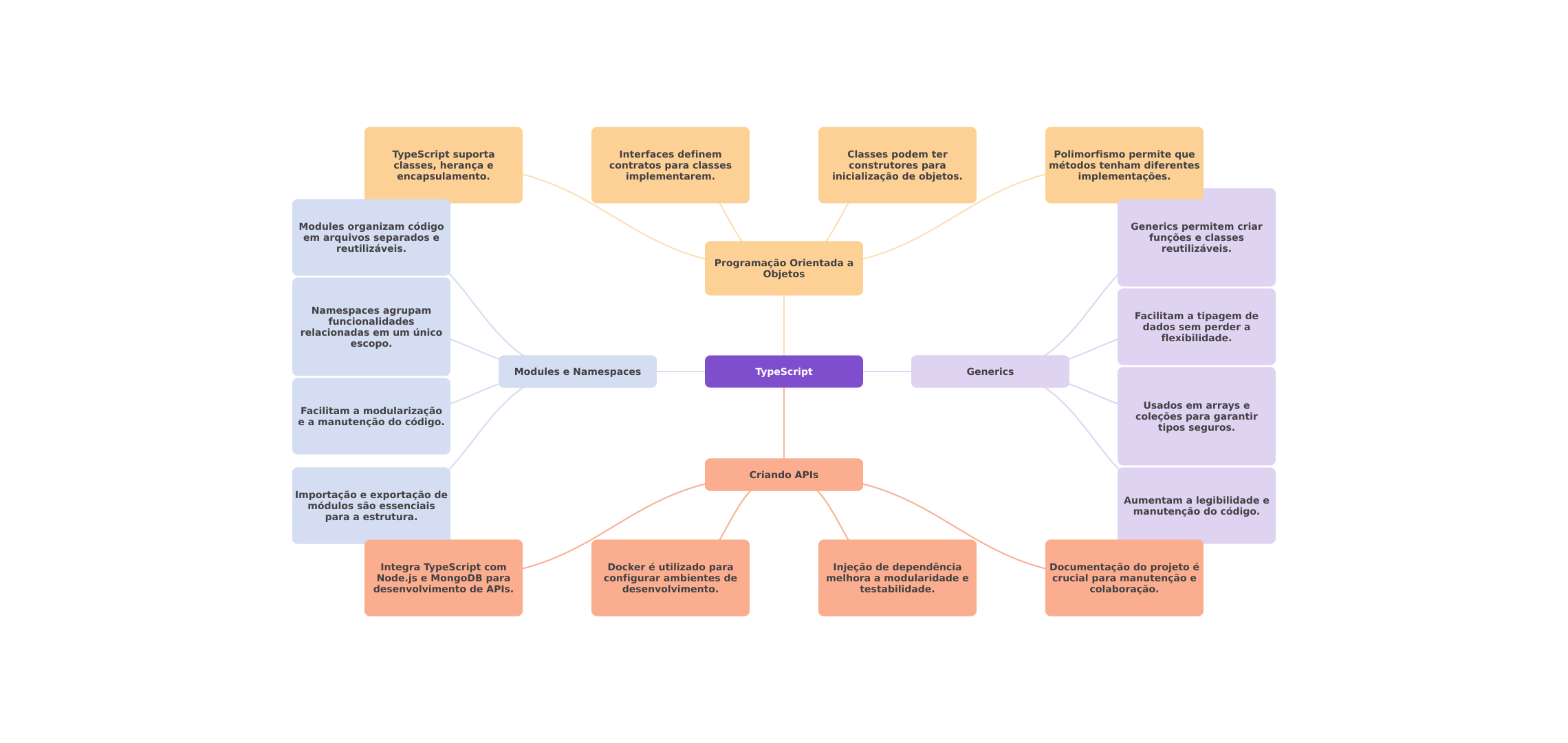 TypeScript suporta Interfaces definem Classes podem ter Polimorfismo permite que classes, herança e contratos para classes construtores para métodos tenham diferentes encapsulamento. implementarem. inicialização de objetos. implementações. Modules organizam código Generics permitem criar em arquivos separados e funções e classes reutilizáveis. reutilizáveis. Programação Orientada a Objetos Namespaces agrupam funcionalidades Facilitam a tipagem de relacionadas em um único dados sem perder a flexibilidade. escopo. Modules e Namespaces TypeScript Generics Facilitam a modularização Usados em arrays e e a manutenção do código. coleções para garantir tipos seguros. Criando APIs Importação e exportação de módulos são essenciais Aumentam a legibilidade e manutenção do código. para a estrutura. Integra TypeScript com Docker é utilizado para Injeção de dependência Documentação do projeto é Node.js e MongoDB para configurar ambientes de melhora a modularidade e crucial para manutenção e desenvolvimento de APIs. desenvolvimento. testabilidade. colaboração.