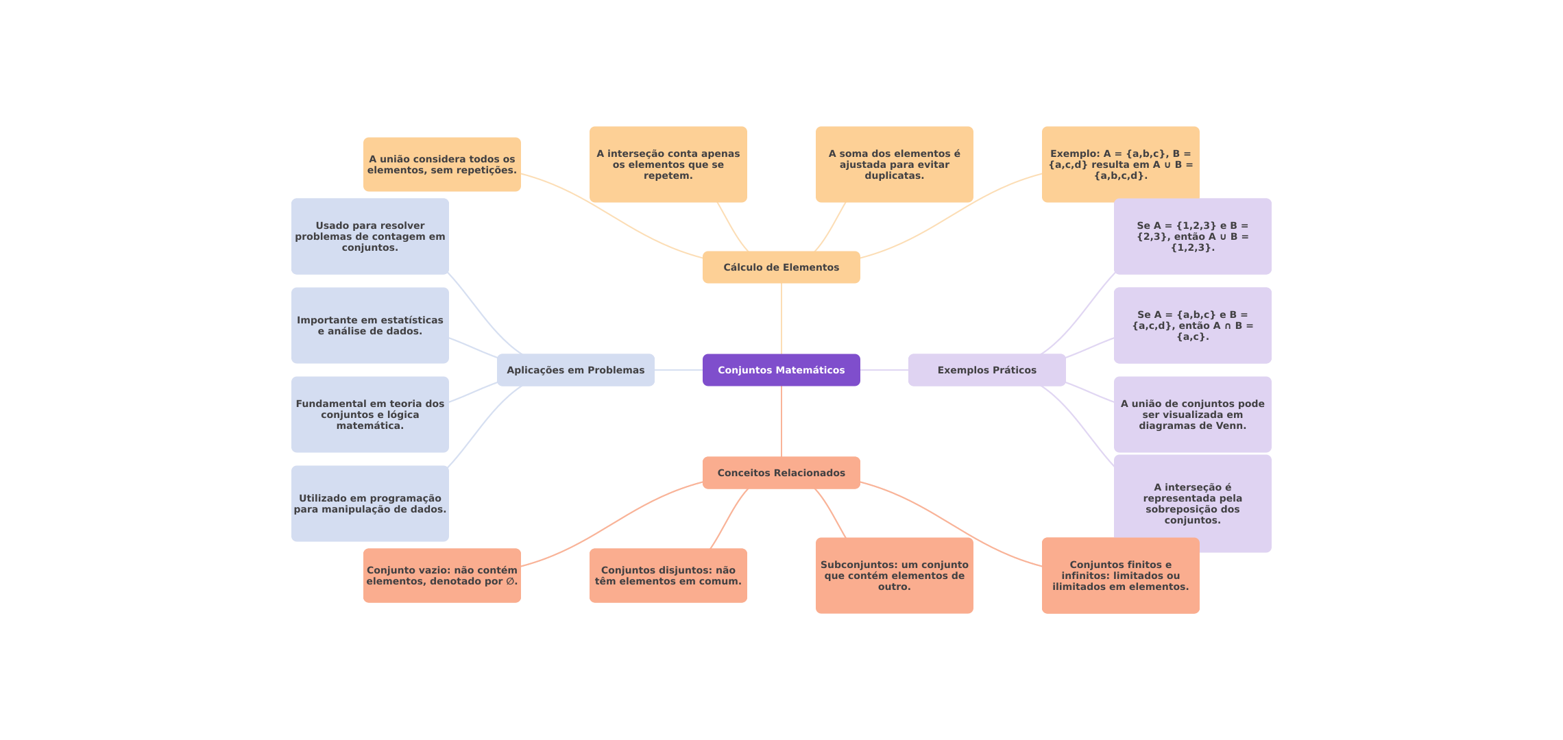 A interseção conta apenas A soma dos elementos é A união considera todos os Exemplo: A = {a,b,c}, = elementos, sem repetições. os elementos que se ajustada para evitar {a,c,d} resulta em A U B = repetem. duplicatas. {a,b,c,d}. Usado para resolver Se A = {1,2,3} e B = problemas de contagem em {2,3}, então = conjuntos. {1,2,3}. Cálculo de Elementos Se A = {a,b,c} e B = Importante em estatísticas e análise de dados. {a,c,d}, então A n = {a,c}. Aplicações em Problemas Conjuntos Matemáticos Exemplos Práticos Fundamental em teoria dos A união de conjuntos pode conjuntos e lógica ser visualizada em matemática. diagramas de Venn. Conceitos Relacionados A interseção é Utilizado em programação representada pela para manipulação de dados. sobreposição dos conjuntos. Conjunto vazio: não contém Conjuntos disjuntos: não Subconjuntos: um conjunto Conjuntos finitos e elementos, denotado por têm elementos em comum. que contém elementos de infinitos: limitados ou outro. ilimitados em elementos.