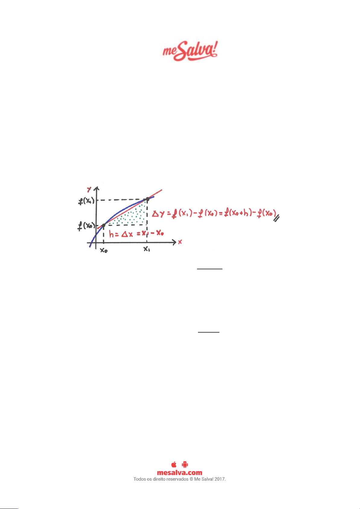 RESUMO DERIVADAS DEFINIÇÃO A derivada nada mais é do que a inclinação da reta tangente a y=f(x) ou a taxa de variação instantânea de y em relação a x. x0 (x ) f ′ 0 = limh→0 h f (x +h)−f (x )0 0 DIFERENCIABILIDADE Para a função f(x) ser diferenciável – derivável – em x deverá existir o limite: (x) f ′ = limh→0 h f (x+h)−f (x) E não esquecer que os limites laterais também devem existir e que devem ser iguais! Podemos ter casos em que a função f(x) é contínua em x0, porém não é derivável em x0. Os dois casos mais comuns são o ponto de bico e o ponto de tangência vertical. TÉCNICAS DE DERIVAÇÃO Para facilitar o estudo, aí está uma tabela resumo das derivadas mais legais! (x ) xd dx n = n n−1 (sec x ) ec x tg x d dx = s (C)d dx = 0 (cotg x) − ossec xd dx = c 2 (a ) ln a )ad dx x = ( x (cossec x) − otg x cossec xd dx = c (e )d dx x = ex arc sen xd dx = 1 √1−x2 (log x ) d dx a = 1 xln a arc cos x −d dx = 1 √1−x2 (ln x )d dx = x 1 arc tg xd dx = 1 1+x2 (sen x) os x d dx = c arc cotg x −d dx = 1 1+x2 (cos x ) − en xd dx = s arc sec x /(|x| ) d dx = 1 √x2 − 1 (tg x) ec² x d dx = s arc cossec x −d dx = 1 |x|√x −12 REGRAS DE DERIVAÇÃO Aqui estão aquelas propriedades e regrinhas básicas das derivadas que não podemos esquecer! Somas e Subtrações [f (x)±g(x)] [f (x)]± [g(x)]d dx = d dx d dx Regra do Produto [f (x)g(x)] (x) [g(x)] (x) [f (x)]d dx = f d dx + g d dx Regra do Quociente [ ]d dx f (x) g(x) = [g(x)]² g(x) [f (x)]−f (x) [g(x)]d dx d dx REGRA DA CADEIA [f (g(x))] (g(x))g (x)d dx = f ′ ′ Essa regra já é um pouco mais complicada. Então, segue um exemplo para visualizar melhor como ela funciona. Há outra maneira de fazer a regra da cadeia. Primeiro, identifique quantas funções existem na composição, depois, derive de fora para dentro. Dá uma olhada nos exemplos a seguir e veja se não é mais fácil! DERIVADA IMPLÍCITA Usamos a derivação (diferenciação) implícita quando não conseguimos isolar as variáveis. Exemplo: TAXAS RELACIONADAS Problemas com taxas relacionadas podem ser resolvidos seguindo os seguintes passos. ✓ Passo 1: Detecte cada quantidade que varia com o tempo e outras que possam ser relevantes para a resolução do problema. ✓ Passo 2: Indique as taxas de variação que são conhecidas e a taxa de variação que deve ser encontrada. Analise cada taxa como uma derivada. ✓ Passo 3: Encontre uma relação entre essas variáveis e equacione elas. Para tal, geralmente usamos geometria. ✓ Passo 4: Derive, através da derivação implícita, ambos os lados da equação em relação ao tempo para obter uma relação entre as taxas conhecidas e a taxa desconhecida. ✓ Passo 5: Após o passo 4, substitua os valores conhecidos das taxas e das variáveis e resolva a equação encontrada para a taxa de variação desconhecida. DERIVADA PRIMEIRA E SEGUNDA + − 0 ∄ (x) f Acima do eixo x Abaixo do eixo x Sobre o eixo x Raízes Fora do domínio (x) f ′ Crescente Decrescente Ponto crítico Máximos/Mínimos Não diferenciável Bico/Ponto de tangência vertical (x) f ′′ Concavidade positiva Concavidade negativa Suspeito de ser um ponto de inflexão Suspeito de ser um ponto de inflexão Obs.: O ponto de inflexão ocorre quando a derivada segunda muda de sinal! ESBOÇO DE GRÁFICOS ✓ Passo 1: Encontrar pontos de interesse de f(x), se possível, como o valor da função quando x=0 e as raízes da função. Podem ser difíceis de encontrar, mas não se atenha, vá para o passo 2! ✓ Passo 2: Encontrar as assíntotas horizontais. Lembrando que para achar as assíntotas horizontais, temos que: f (x) (constante) limx→±∞ = K ✓ Passo 3: Procurar as assíntotas verticais. Encontramos as nossas assíntotas verticais quando nossa função não existe, por exemplo, divisão por zero e raízes de números negativos. ✓ Passo 4: Buscar pelos máximos e mínimos. Para isso, derivamos a f(x), igualamos a zero e encontramos os pontos críticos, e se analisa o sinal. ✓ Passo 5: Analisar a concavidade. Para tanto, deriva-se duas vezes, encontrando a derivada segunda f’’(x), iguala-se a zero para obter os suspeitos de inflexão e se analisa o sinal. ✓ Passo 6: Traçar o esboço. Para facilitar o teu trabalho, desenhe, abaixo do eixo x, duas linhas, uma para f’(x) e outra para f’’(x), colocando, respectivamente, os pontos críticos e pontos de inflexão, juntamente com as análises de sinais. Dê uma olhada no desenho abaixo! TEOREMA DO VALOR MÉDIO O teorema diz que, entre dois pontos [a, b] de uma função diferenciável f, há um ponto c no qual a sua derivada f’(c) é a inclinação da reta tangente paralela à reta secante que passa pelos pontos [a, b]. (c)f ′ = b−a f (b)−f (a) REGRA DE L’HÔPITAL LIMX→A G(X) F (X) = LIMX→A G (X)′ F (X)′ Aplicamos a regra de L’Hôpital quando o resultar em uma limx→a g(x) f (x) indeterminação do tipo ou . Dessa forma, devemos derivar as funções. 0 0 ± ∞ ∞ Caso ainda resulte em uma indeterminação, deve-se continuar derivando. MÉTODO DE NEWTON Utilizamos este método quando queremos achar um valor aproximado da nossa raiz de uma função f(x). Lembrando que quanto maior o número de interações, mais preciso vai ser o valor de r. , n , , ,xn+1 = xn − f (x )n f (x )′ n = 1 2 3 …