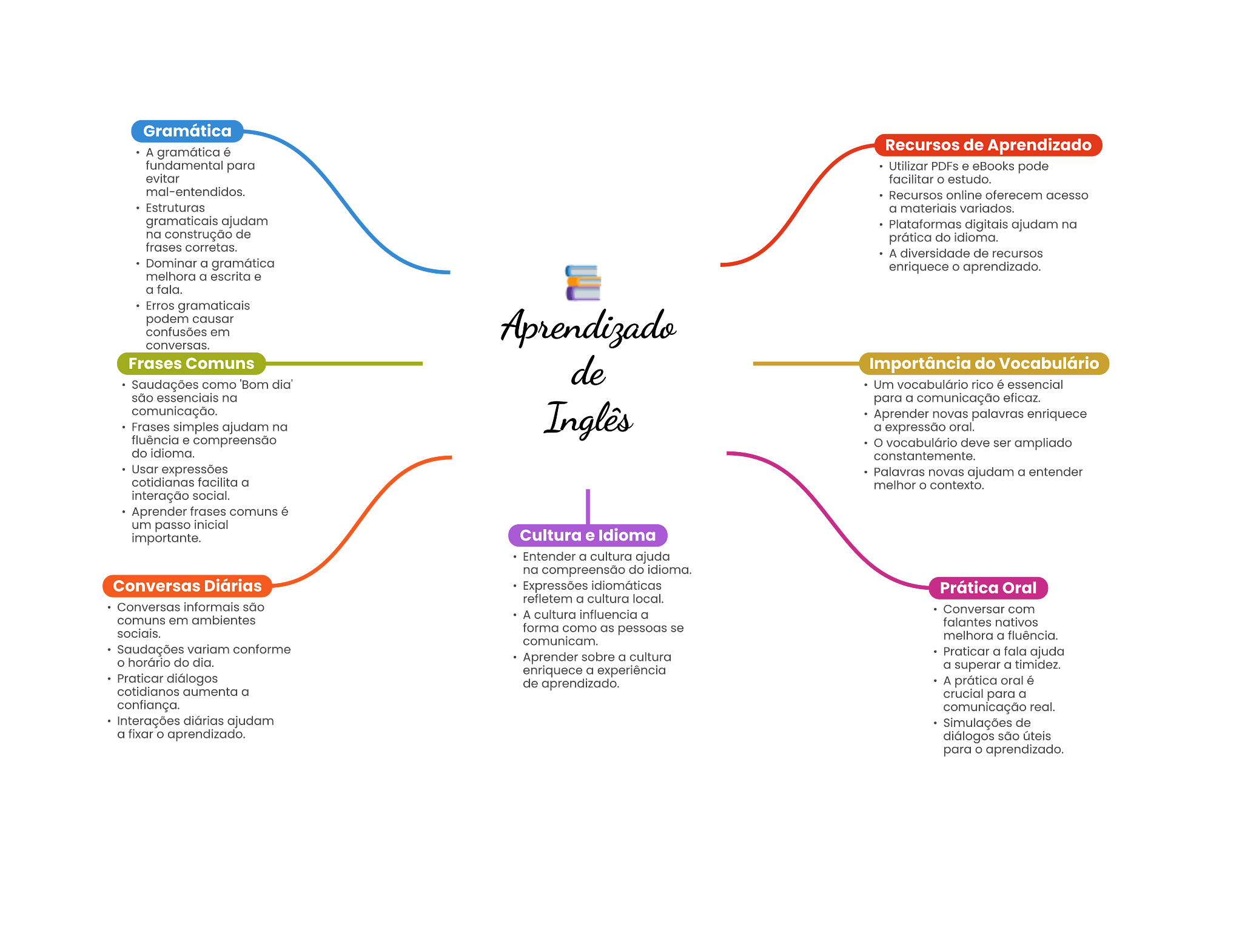Gramática A gramática é Recursos de Aprendizado fundamental para Utilizar PDFa . pode estudo. Recursos online oferecem acesso Estruturas a materials variados. gramaticals Plataformas digitals ajudam na na construção de prática do corretas. A diversidade de recursos Dominar a gramática enriquece o aprendizado. melhora a escrita a Erros gramaticals podem causar confusões em Frases Comuns Importância do Vocabulário Saudações como Um vocabulário rico essencial são na para a comunicação comunicação. Aprender palavras Frases simples ajudam na a expressão oral. fluência vocabulário deve ser ampliado do expressões Palavras novas ajudam a entender facilita a contexto. social. Aprender frases comune é um passo Cultura e Idioma Entender a cultura ajuda na do Conversas Diárias Expressões Prática Oral a cultura local. são em ambientes A cultura influencia a Conversor com socials. forma como as se nativos comunicam. melhora a fluência. Saudações variam conforme Aprender sobre a cultura Praticar a ajuda horário do dia. enriquece a experiência a superar a timidez. Praticar diálogos a de aprendizado. A prática oral para a comunicação real. ajudam Simulações de a aprendizado. para aprendizado.