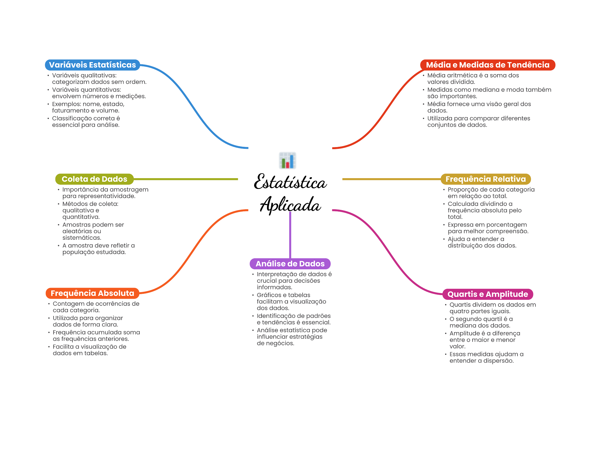Variáveis Estatísticas Média e Medidas de Tendência qualitativas: Média a soma dos categorizam dados sem valores dividida. quantitativas: como mediana moda também envolvem números medições. são importantes. Exemplos: nome, estado, uma visão geral dos faturamento . volume. dados. correta 6 Utilizada para comparar diferentes para conjuntos de dados. Coleta de Dados Frequência Relativa da amostragem Proporção de cada categoria para representatividade. em relação de Calculada dividindo a qualitativa frequência absoluta pelo quantitativa. total. Amostras podem ser em porcentagem aleatórias ou para Ajuda a entender a A amostra deve a distribuição dos dados. população estudada. Análise de Dados de dados crucial para decisões Frequência Absoluta Gráficos Quartis e Amplitude Contagem de ocorrências de facilitam a visualização oada dos dados. Quartis dividem dados em quatro partes Utilizada para organizar de padrões dados de forma tendências essencial. o segundo quartil é a mediana dos dados. Frequência acumulada soma pode a diferença as entre menor Facilita a de de negócios. valor. dados em tabelas. medidas ajudam a entender a