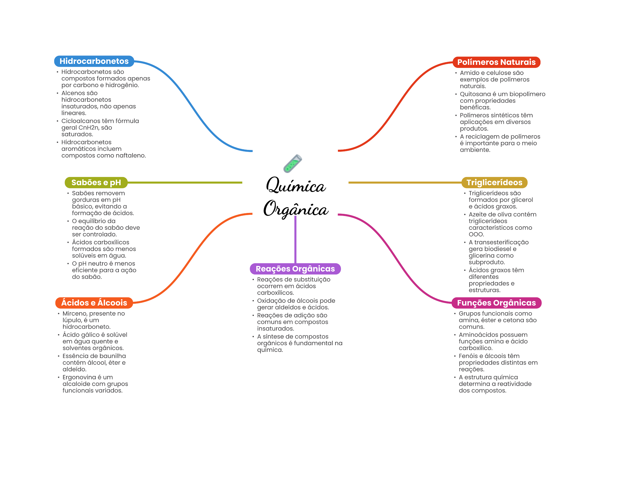 Hidrocarbonetos Polímeros Naturais são Amido são compostos formados apenas exemplos de por carbono Alcenos são Quitosana um hidrocarbonetos com propriedades não sintéticos têm fórmula aplicações em diversos geral CnH2n, produtos. saturados. A de é importante para aromáticos compostos como Sabões e pH Triglicerídeos Sabões removem gorduras em pH formados por evitando a formação de de oliva contém equilibrio da reação do sabão deve como ser controlado. A transesterificação formados menos gera e em água. glicerina como pH neutro é menos subproduto. eficiente para a ação Reações Orgânicas Ácidos do sabão. Reações de diferentes em ácidos propriedades Ácidos e Álcoois Oxidação de pode gerar Funções Orgânicas Mirceno, presente no . Reações de adição Grupos como um comune em compostos amina, éster cetona são Ácido gálico solúvel A de compostos poesuem em água quente orgânicos fundamental na funções amina ácido orgânicos. quimica. Essência de têm contém álcool, éter propriedades em reações. Ergonovina um A estrutura alcaloide com grupos determina a reatividade variados. dos compostos.