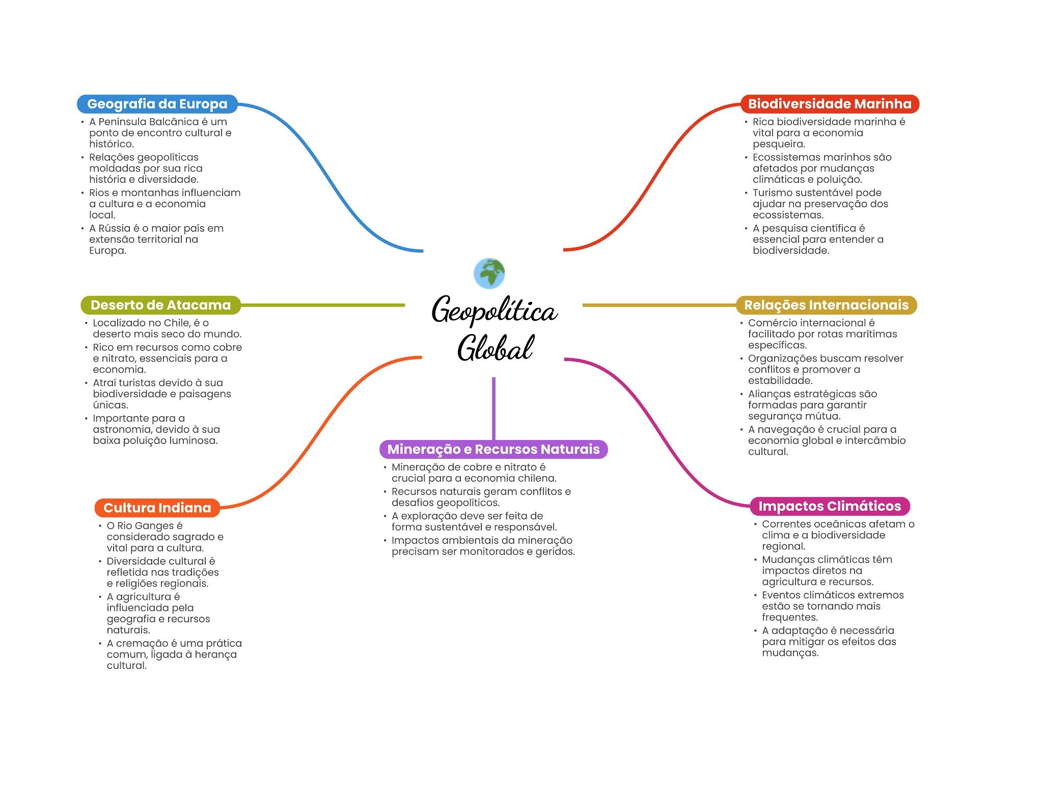 Geografia da Europa Biodiversidade Marinha A Balcânica um Rica biodiversidade marinha de encontro cultural vital para a economia histórico. pesqueira. Relações geopoliticas marinhos são moldadas por sua rica afetados por mudanças história . . poluição. montanhas pode a cultura a economia ajudar na preservação dos local. A o país em A pesquisa territorial na para entender a Europa. biodiversidade. Deserto de Atacama Relações Internacionais no Chile, é deserto mais do mundo. facilitado por rotas Rico em recursos como cobre nitrato, para a Organizações resolver economia. promover a Atraf turistas devido à biodiversidade palsagene Allanças estratégicas são formadas para garantir para a segurança mútua. astronomia, devido à A navegação é para a poluição luminosa. economia global Mineração e Recursos Naturais cultural. Mineração de cobre nitrato crucial para a economia chilena. Recursos naturale geram e Cultura Indiana geopoliticos. Impactos Climáticos A exploração deve ser feita de Rio Ganges forma sustentável Correntes oceânicas afetam considerado sagrado da mineração clima a vital para a cultura. ser monitorados . regional. Diversidade cultural é Mudanças climáticas nas tradições diretos na religiões regionals. agricultura recursos. A agricultura é Eventos climáticos extremos pela estão mais geografia recursos A adaptação é A cremação uma prática para mitigar efeitos das comum, ligada herança mudanças. cultural.