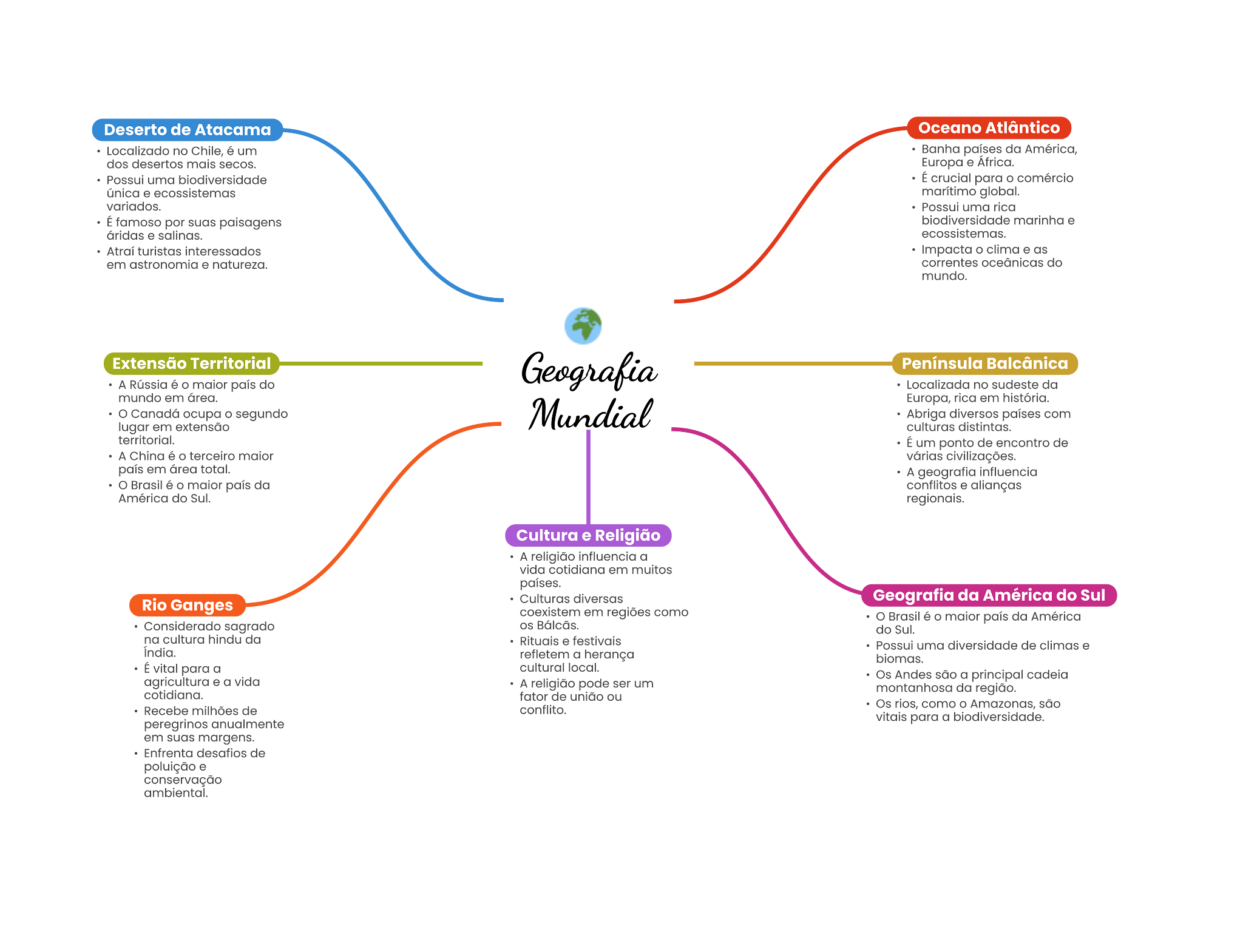 Deserto de Atacama Oceano Atlântico Localizado no Chile, é um Banha da América, dos desertos mais Europa uma É crucial para comércio única . global. variados. Possul uma rica É farnoso por marinha . Atraf o clima e as em astronomia . natureza. do mundo. Extensão Territorial Península Balcânica A Rússia é país do Localizada no sudeste da mundo em área. Europa, rica em história. Canadá ocupa segundo Abriga diversos países com lugar em extensão culturas territorial. É um ponto de encontro de A China país em área total. A geografia maior país da alianças do Sul. Cultura e Religião A influencia a vida cotidiana em multos Rio Ganges Culturas Geografia da América do Sul em regiões como é país da América Considerado sagrado do na cultura hindu da festivate uma diversidade de climas refletern a herança biomas. É vital para a cultural agricultura a vida Andes são a principal cadela A pode um cotidiana. montanhosa da regido. fator de ou Recebe milhões de conflito. Os rios, como Amazonas, são peregrinos para a em margene. Enfrenta de conservação ambiental.