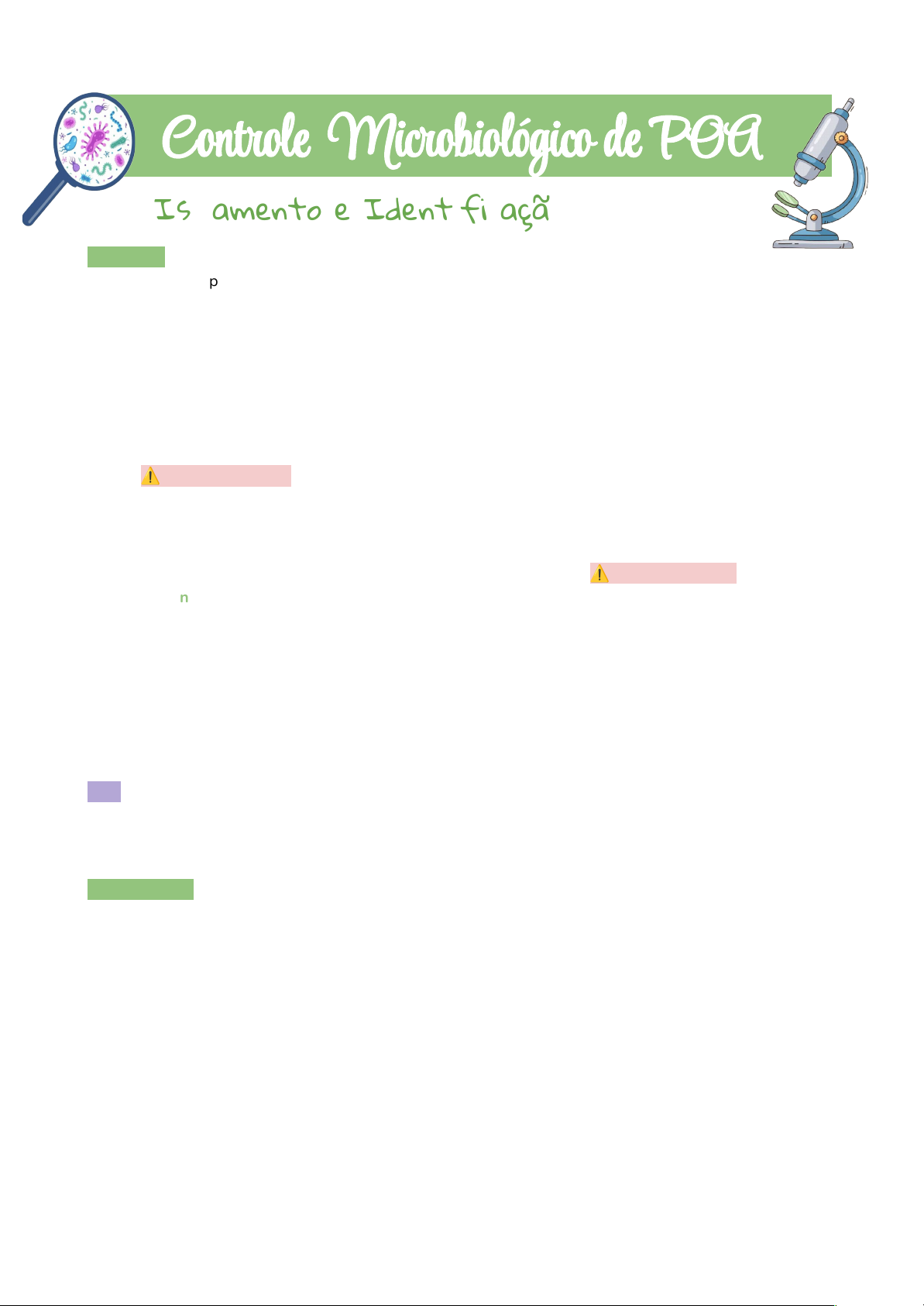 Controle Microbiológico de POA Isolamento e Identificação de Salmonella Introdução → Salmonella spp. é um dos microrganismos mais envolvidos em surtos de origem alimentar ( junto à E. coli e Staphylococcus), pois têm cepas muito patogênicas. Apesar de não ser formadora de esporos (cél. de resistência bacteriana), ela tem capacidade de formar uma célula viável e não cultivável (CNV), capaz de se manter viável em ambientes que não são favoráveis - microorganismo fastidioso de difícil isolamento → Microbiota autóctone é a acompanhante do alimento (que geralmente está numa concentração maior), já a Salmonella faz parte da microbiota contaminante, por isso costuma ser o microrganismo em menor quantidade, o que dificulta seu isolamento. Nas etapas de isolamento da Salmonella são feitos processos com o intuito de inibir o cresc da microbiota interferente/acompanhante para que a Salmonella possa crescer ⚠Questão de prova: se manter viável e não cultivável e ter microbiota autóctone → Habitat: trato gastro-intestinal de homens e animais. Os reservatórios de Salmonella são as aves (é o principal reservatório, presente em carne e ovos), homens, suínos, répteis, mamíferos domésticos e silvestres. O homem inclusive pode se tornar um portador assintomático (elimina mas não desenvolve a doença, virando uma fonte de contaminação dentro da cadeia produtiva) ⚠Questão de prova → A contaminação pode ser pelos poros da casca no momento da postura e na própria formação do ovo, ou do próprio trato intestinal no momento da evisceração - dentro da indústria pode causar danos para o consumidor final, por isso, é importante que a indústria tenha boas práticas de manipulação. Esse gênero está muito associado à questão da contaminação cruzada dentro da indústria ligada à falta de boas práticas ou na área de esfola, quando se tem o rompimento do TGI, contaminando a carcaça e o ambiente, logo, se não for feita limpeza adequada do ambiente e da faca utilizada, pode carrear o microrganismo. Um agravante é o fato de se ter portador assintomático, podendo estar na microbiota sem causar alterações no hospedeiro, facilitando a contaminação de alimentos Obs: Muito pessoas lavam o frango, espalhando Salmonella (se estiver presente) ou ao usarem a mesma faca que cortou o frango cru para cortar um frango pronto, legumes ou verduras. Outro problema é o uso de tábua de madeira ou colher de pau, que têm material poroso Características → Família Enterobacteriaceae, bastonetes Gram negativos, não esporulados, oxidase negativa (não sintetizam a enzima oxidase, que faz com que o oxigênio seja usado como último receptor da cadeia de elétrons no metabolismo do microrganismo), a maioria são móveis (flagelos peritríquios ao longo da célula, exceto S. Gallinarum e S. Pullorum, que são consideradas imóveis - motilidade se torna um fator de virulência), anaeróbios facultativos → Mesófilos: crescem em temperaturas de 7-49,5°C, e temperatura ótima de 35 a 37°C. São sensíveis a baixas temperaturas (ambientes hostis por exemplo), logo, é preciso colocar o Vi entre parênteses, indicando que a expressão antigênica pode estar constante ou não, mas a célula é capaz de produzir. Ou seja, se o sorotipo tiver (Vi), significa que ele é capaz de formar a cápsula, mas pode ou não expressar (geralmente, a célula vai expressar esse antígeno quando está em um momento de desconforto bacteriano) ★ Antígenos Flagelares (H): → Os antígenos flagelares conferem motilidade à célula bacteriana, a principal proteína é a flagelina (molécula que será sintetizada para dar origem ao flagelo), em que em sua formação sofre muitas alterações em termos de sequência de aminoácidos (mudança da ordem dos aminoácidos). Serão chamados de monofásicos quando são capazes de formar 1 flagelo (apresenta apenas uma fase) e bifásico quando são capazes de formar esse flagelo em fases diferentes (maioria das cepas tem variação de fases). São termolábeis (destruidos por calor) → Por existirem diversos tipos, o H é suprimido da fórmula, sendo representados por letras minúsculas e números. São identificados tanto por letra como número de acordo com a sequência de aminoácidos, pois existem microrganismos que vão ser capazes de formar flagelos em situações diferentes ● Fase 1: expresso por letras minúsculas (fase específico) - quando é monofásico ● Fase 2: expresso por números (fase grupo) - quando é bifásico (maioria das cepas de Salmonella) Obs: Parênteses indicam a constância da expressão do gen e não qual é maior (principal) ou menor (secundário). Quando não há formação de cápsula nada é indicado (lembrar que se Vi estiver fora de parênteses indica que a formação é constante). A separação dos antígenos ocorre pelas vírgulas e tudo que for após os dois pontos será correspondente aos antígenos flagelares ⚠Questão de prova: Provas bioquímicas → Oxidase e Lactose negativas, não produzem butilenoglicol (VP negativo), VM positivas, reduzem nitrato a nitrato. As principais provas para Salmonella: Fenilalanina desaminase negativas e Urease negativas - estudam a capacidade do MO em degradar a ureia e a fenilalanina, e a Salmonella não sintetiza a enzimas fenilalanina desaminase e urease, ambas as provas são negativas = durante a análise, é muito comum a Salmonella dar diagnóstico cruzado com o gênero Proteus, logo essas provas sã importantes pois permite a diferenciação (é positivo nas duas provas) ⚠Questão de prova: diferenciar Salmonella e Proteus Obs: O mais importante para se saber da bioquímica é que é Lac - e as principais provas (fenilalanina desaminase e urease) ⚠Questão de prova: Epidemiologia → Locais de detecção: fezes, água, alimentos (habitat é o TI homem e animais), alimentos processados → Salmoneloses de animais para humanos: Salmonella Enteritid