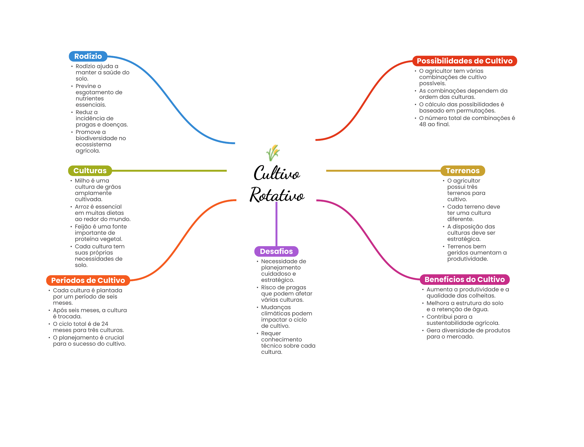 Rodízio Possibilidades de Cultivo ajuda a manter a do agricultor tern solo. combinações de cultivo Previne esgotamento de As combinações dependem da nutrientes culturas. essenciale. das possibilidades Reduz a baseado em permutações. de número total de combinações pragas 48 final. Promove a no Culturas Terrenos Milho é uma o agricultor cultura de possul três terrenos para cultivada. Arroz é essencial Cada terreno deve em ter uma cultura do mundo. Feijão é uma fonte A disposição das importante de culturas deve ser proteina vegetal. estratégica. Cada cultura tem bem sude Desafios a necessidades de Necessidade de produtividade. solo. . Períodos de Cultivo estratégico. Benefícios do Cultivo Cada cultura plantada Risco de pragas Aumenta a produtividade a por um de seis que podem qualidade dos culturas. Melhora a estrutura do solo Após a cultura . a retenção de água. trocada. podem ciclo para a total de 24 de para Requer Gera diversidade de produtos planejamento é crucial conhecimento para mercado. para sucesso do cuitivo. sobre cada cultura.