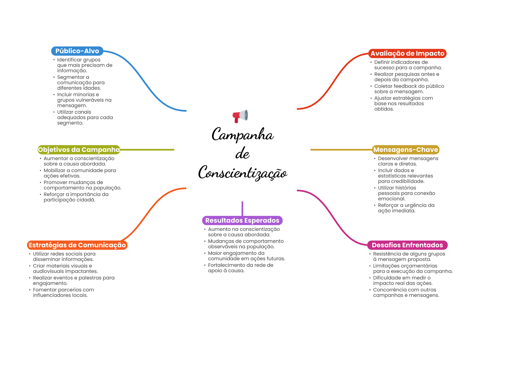Público-Alvo Avaliação de Impacto grupos Definir indicadores de que mais precisam de para a companha. Segmentar a antes comunicação para depois da campanha. diferentes do público minorias . sobre a mensagem. grupos na Ajustar com mensagem. base nos resultados Utilizar adequados para cada segmento. Objetivos da Campanha Mensagens-Chave a conscientização Desenvolver mensagens sobre a causa abordada. Mobilizar a comunidade para Incluir e ações relevantes Promover mudanças de para credibilidade. comportamento na população. Utilizar Reforçar a importância da para participação Reforçar urgência da ação Resultados Esperados Aumento na conscientização sobre a causa abordada. de comportamento Estratégias de Comunicação na população. Desafios Enfrentados Utilizar redes sociale para da Resistência de grupos disseminar comunidade em ações futuros. à proposta. Criar materials visuals da rede de Limitações orçamentárias impactantes. causa. para da Realizar eventos . para em medir engajamento. real das ações. parcerias com Concorrência com outras locals. . mensagens.