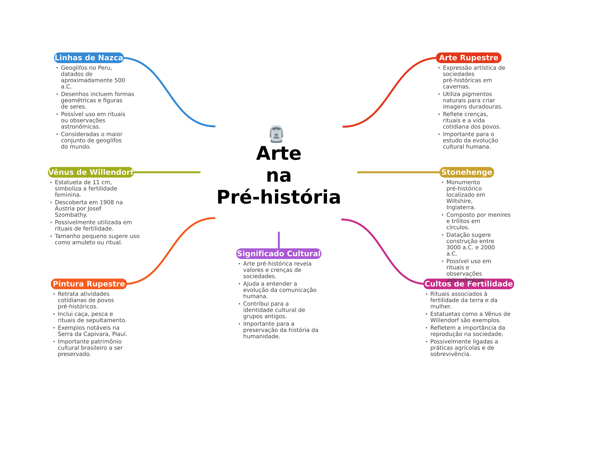 Linhas de Nazca Arte Rupestre Geoglifos no Peru, Expressão artística de datados de sociedades aproximadamente 500 pré-históricas em a.C. cavemas. Desenhos Incluem formas Utiliza geométricas figuras naturals para criar de seres. imagens duradouras. Possível uso em Reflete crenças, ou observações e a vida astronômicas. cotidiana dos povos. Consideradas malor Importante para conjunto de geoglifos estudo da evolução do mundo. cultural humana. Vênus de Willendorf Stonehenge Estatueta de 11 cm, Monumento simboliza a fertilidade pré-histórico feminina. localizado em Descoberta em 1908 na Wiltshire, por Josef Szombathy. Composto por menires utilizada em e em rituals de fertilidade. círculos. Tamanho pequeno sugere uso Datação sugare como amuleto ou ritual. construção entre 3000 a.C. 2000 Significado Cultural a.C. Arte pré-histórica revela Possível uso em valores e crenças de rituals e sociedades. observações Pintura Rupestre Ajuda a entander a Cultos de Fertilidade Retrata atividades evolução da comunicação Rituals associados à cotidianas de povos fertilidade da terra e da pré-históricos. pera a mulher. Identidade cultural de caça, pesca e grupos antigos. Estatuetas como a de rituais de Willendorf são exemplos. Exemplos na Importante para a preservação da história da Refletem a importância da Serra da Capivara, Plauf. humanidade. reprodução na sociedade. Importante patrimônio Possivelmente ligadas a cultural brasileiro a práticas a de preservado. sobrevivência.