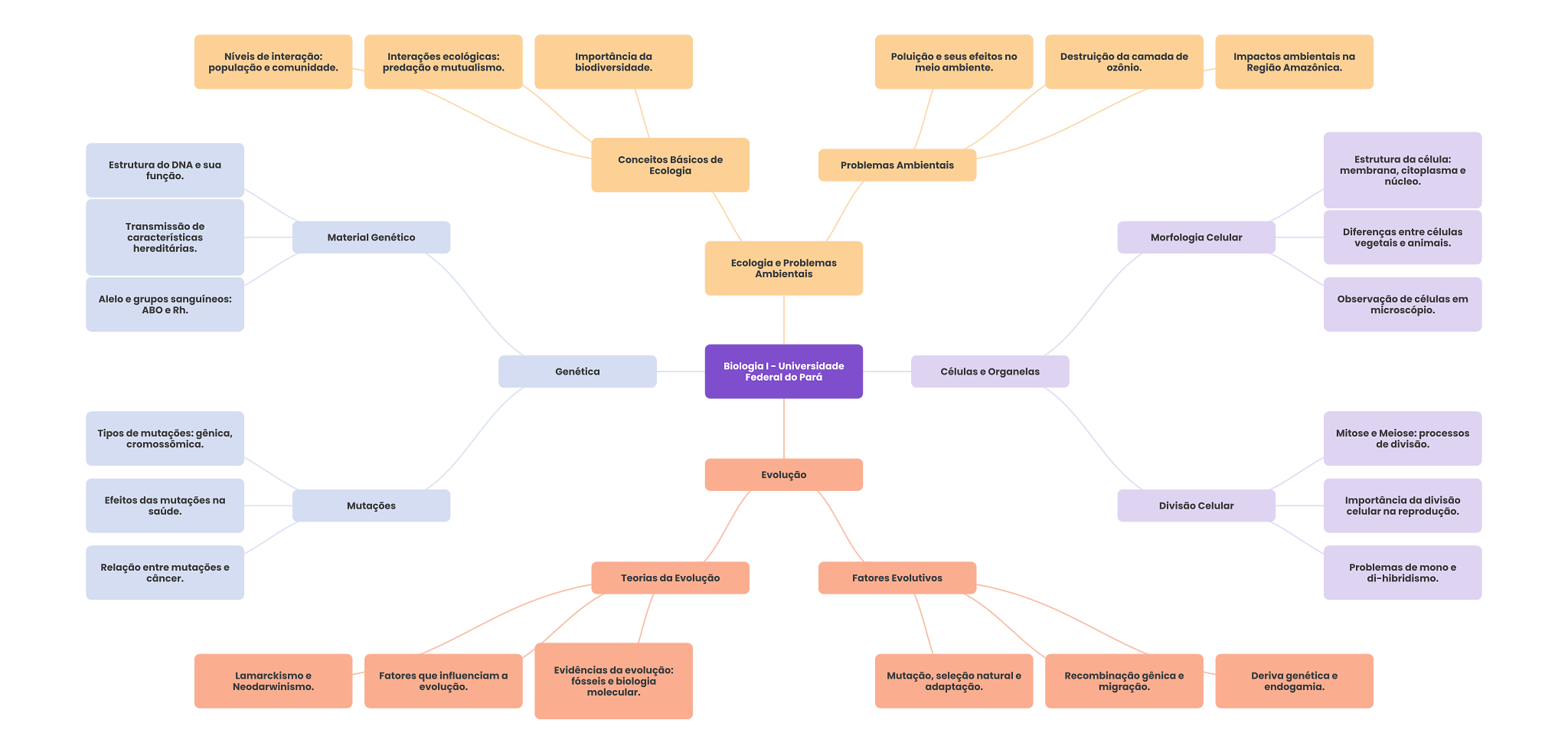 Níveis de interação: Interações ecológicas: Importância da Poluição e seus efeitos no Destruição da camada de Impactos ambientais na população e comunidade. predação e mutualismo. biodiversidade. meio ambiente. ozônio. Região Amazônica. Conceitos Básicos de Estrutura da célula: Estrutura do DNA e sua Problemas Ambientais função. Ecologia membrana, citoplasma e núcleo. Transmissão de características Material Genético Morfologia Celular Diferenças entre células hereditárias. vegetais e animais. Ecologia e Problemas Ambientais Alelo e grupos sanguíneos: Observação de células em ABO Rh. microscópio. Genética Biologia Universidade Federal do Pará Células e Organelas Tipos de mutações: gênica, Mitose e Meiose: processos cromossômica. de divisão. Evolução Efeitos das mutações na Divisão Celular Importância da divisão saúde. Mutações celular na reprodução. Relação entre mutações e Problemas de mono e câncer. Teorias da Evolução Fatores Evolutivos di-hibridismo. Lamarckismo e Fatores que influenciam a Evidências da evolução: fósseis e biologia Mutação, seleção natural e Recombinação gênica e Deriva genética e Neodarwinismo. evolução. molecular. adaptação. migração. endogamia.