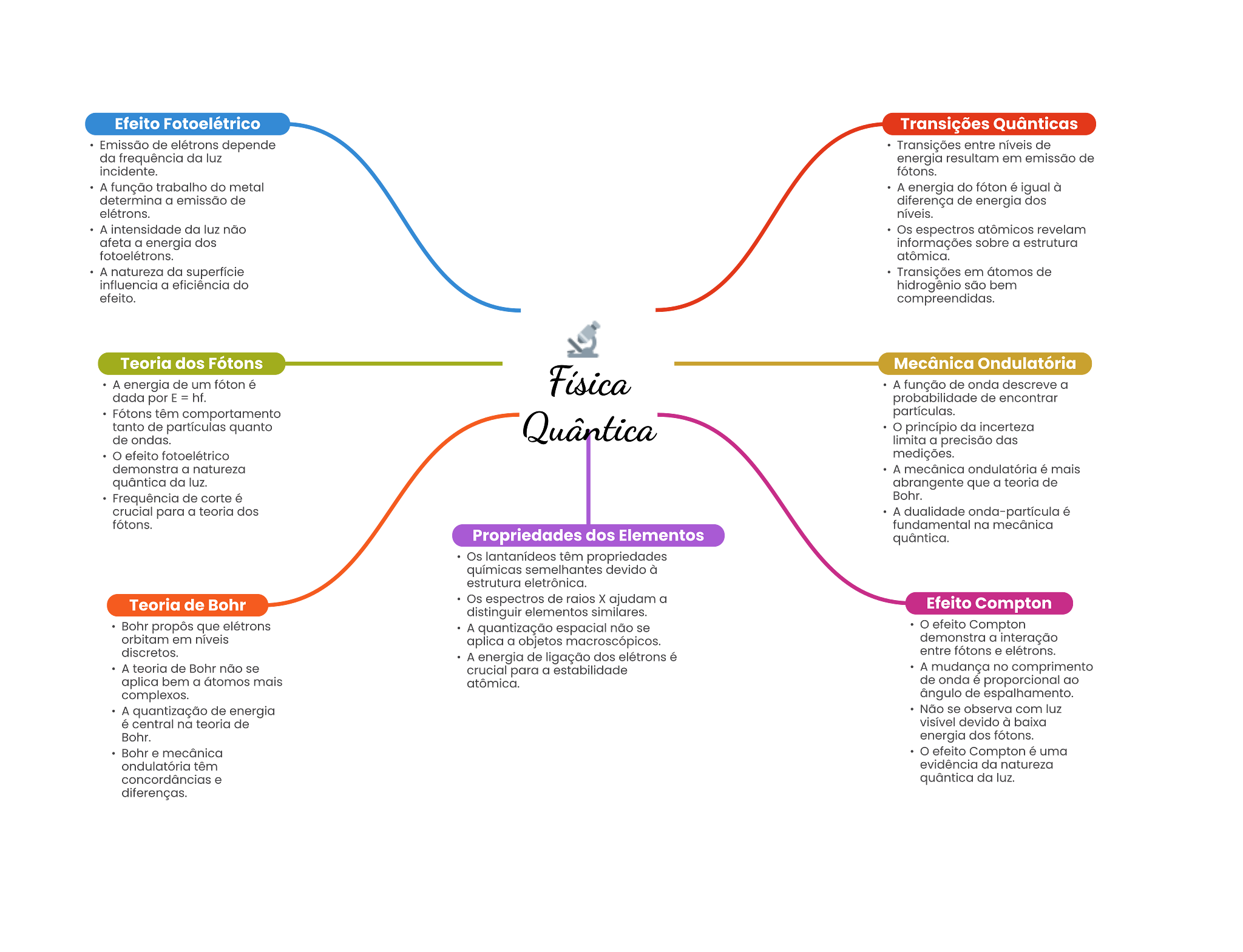 Efeito Fotoelétrico Transições Quânticas Emissão de elétrons depende Transições entre de da frequência da luz energia resultam em de A função trabalho do metal A energia do fóton determina a emissão de diferença de energia dos elétrons. A da luz não espectros atômicos afeta a energia dos Informações sobre a estrutura atômica. A natureza da superficie Transições em de influencia a do são bem Teoria dos Fótons Mecânica Ondulatória A energia de um fóton é A função de descreve a dada por E hf. probabilidade de encontrar Fótons têm comportamento partículas. tanto de quanto da de limita a precisão das efeito medições. demonstra a natureza A mecânica male quântica da luz. que a teoria de Frequência de corte é Bohr. crucial para a teoria dos A dualidade é fótona. fundamental na mecânica Propriedades dos Elementos quântica. Os têm propriedades químicas devido à estrutura Teoria de Bohr Os espectros de ralos ajudam a distinguir elementos similares. Efeito Compton Bohr que A quantização espacial não Compton orbitam em nivels aplica a objetos demonstra a discretos. A energia de ligação dos elétrons entre . A teoria de Bohr não se crucial para a estabilidade A mudança no comprimento aplica bem a atômica. de onda proporcional de A quantização de energia Não observa com luz central na tsoria de visivel devido à Bohr. energia dos Bohr mecânica efeito Compton uma ondulatória têm evidência da natureza concordâncias quântica da luz. diferenças.