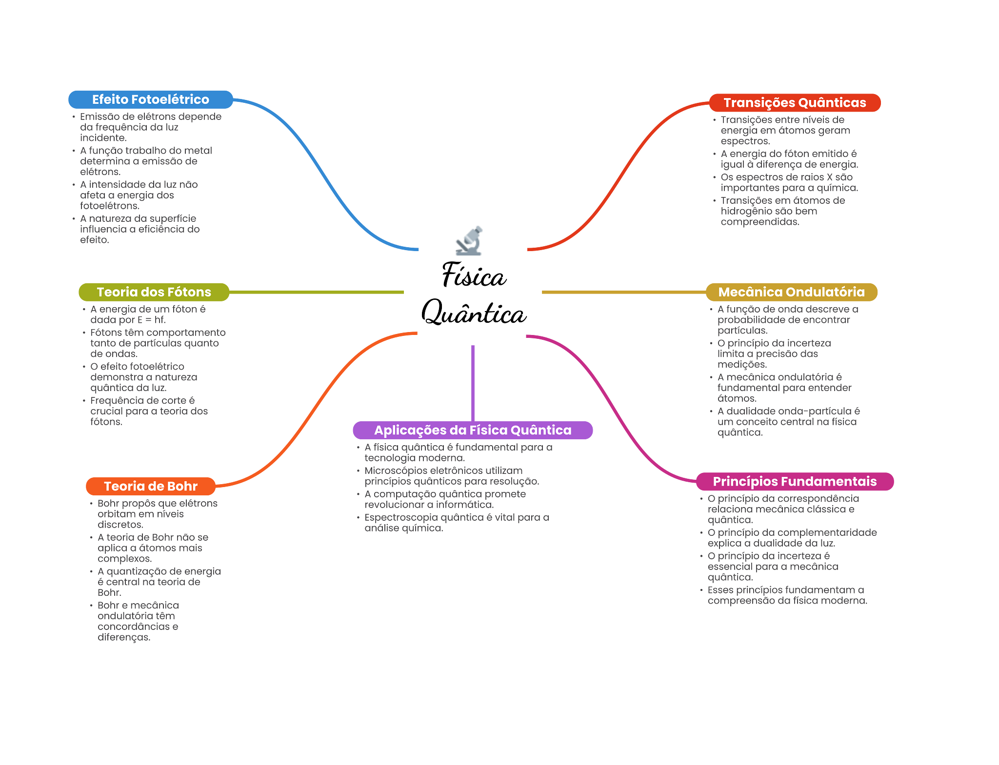 Efeito Fotoelétrico Transições Quânticas Emissão de elétrons depende Transições entre de da frequência da luz energia em geram espectros. A trabalho do metal A energia do emitido determina a emissão de diferença de elétrons. espectros de A da luz não Importantes para a quimica. afeta a energia dos Transições em de são bem A da superficie compreendidas. influencia a eficiência do efeito. Teoria dos Fótons Mecânica Ondulatória A energia de um é A função de onda descreve a dada por E hf. probabilidade de Fótons têm comportamento partículas. tanto de partículas quanto da de ondas. limita a precisão das efeito medições. demonstra natureza A mecânica ondulatória quântica da para entender Frequência de corte crucial para a teoria dos A dualidade é fótona. um central na física Aplicações da Física Quântica quântica. A física quântica para a tecnologia modema. eletrônicos utilizam Teoria de Bohr quânticos para resolução. Princípios Fundamentais A quântica Bohr propôs que elétrons revolucionar a informática. princípio da correspondência orbitam em nivels relaciona mecânica . Espectroscopia quântica é vital para a discretos. quântica. quimica. A teoria de Bohr não o principio da aplica a explica a da luz. complexes. da é A quantização de energia essencial para a central na de quântioa. Bohr. Esses fundamentam a Bohr mecânica da moderna. ondulatória têm e diferenças.