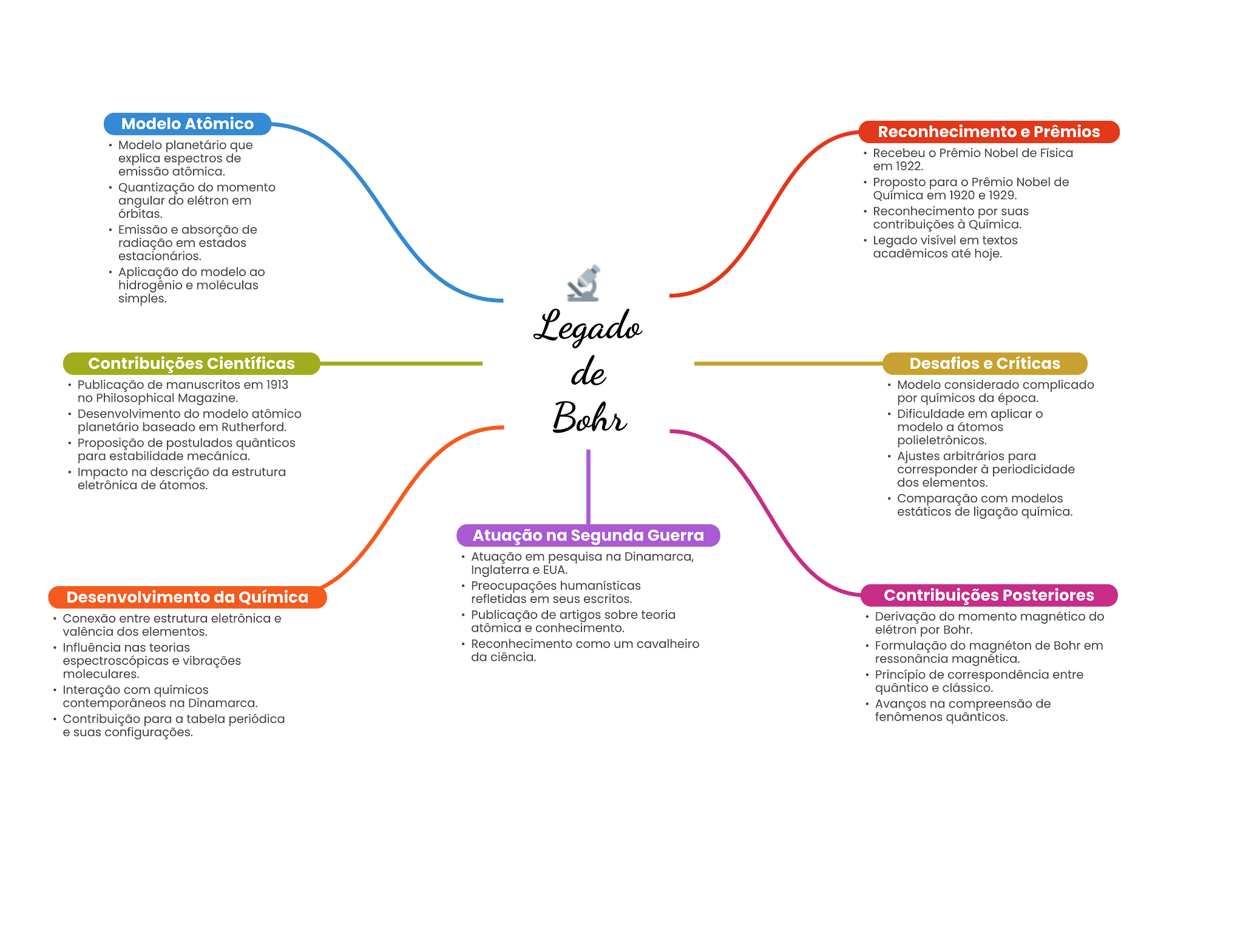 Modelo Atômico Reconhecimento e Prêmios que explica espectros de Recebeu Prêmio Nobel de atômica. em 1922. Quantização do momento Proposto para o Prêmio Nobel de angular do elétron em em 1920 1929. por Emissão absorção de contribuições à radiação em estados Legado em textos até hoje. Aplicação do modelo . Contribuições Científicas Desafios e Críticas Publicação de manuscritos em 1913 considerado complicado no Philosophical Magazine. por quimicos da época. do modelo atômico em aplicar bassado em Rutherford. modelo a Proposição de postulados quânticos para mecânica. arbitrários para impacto na descrição da estrutura corresponder à periodicidade de dos elementos. Comparação com modelos estóticos de ligação quimica. Atuação na Segunda Guerra Atuação em pesquisa na Dinamarca, EUA. Preocupações Desenvolvimento da Química em escritos. Contribuições Posteriores entre estrutura Publicação de sobre teoria Derivação do momento magnético do valência dos elementos. atômica conhecimento. por Bohr. nos Reconhecimento como um Formulação do magnéton de Bohr em vibrações da ciência. moleculares. de correspondência entre com quântico na Avanços na de Contribuição para a tabela periódica quânticos. . configurações.