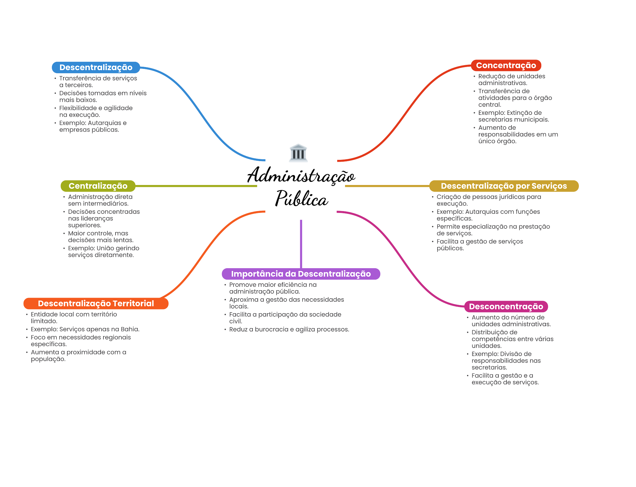 Descentralização Concentração Transferência de serviços Redução de unidades a terceiros. administrativas. Decisões tomadas em Transferência de mais atividades para órgão Flexibilidade . central. na execução. Exemplo: Extinção de Exemplo: Autarquias secretarias empresas Aumento de em um único órgão. Centralização Descentralização por Serviços Administração direta Criação de jurídicas para sem execução. Decisões concentradas Exemplo: com funções nas superiores. Permite na prestação controle, mas de serviços. decisões lentas. Facilita a gestão de serviços Exemplo: União gerindo públicos. serviços diretamente. Importância da Descentralização Promove malor eficiência na administração Descentralização Territorial Aproxima a gestão Desconcentração local com território a participação da sociedade Aumento do número de limitado. civil. Exemplo: Serviços na Reduz a burocracia processos. Distribuição de Foco em necessidades regionals entre unidades. a proximidade com a Exemplo: Divisão de população. responsabilidades nas Facilita a gestão a execução de serviços.