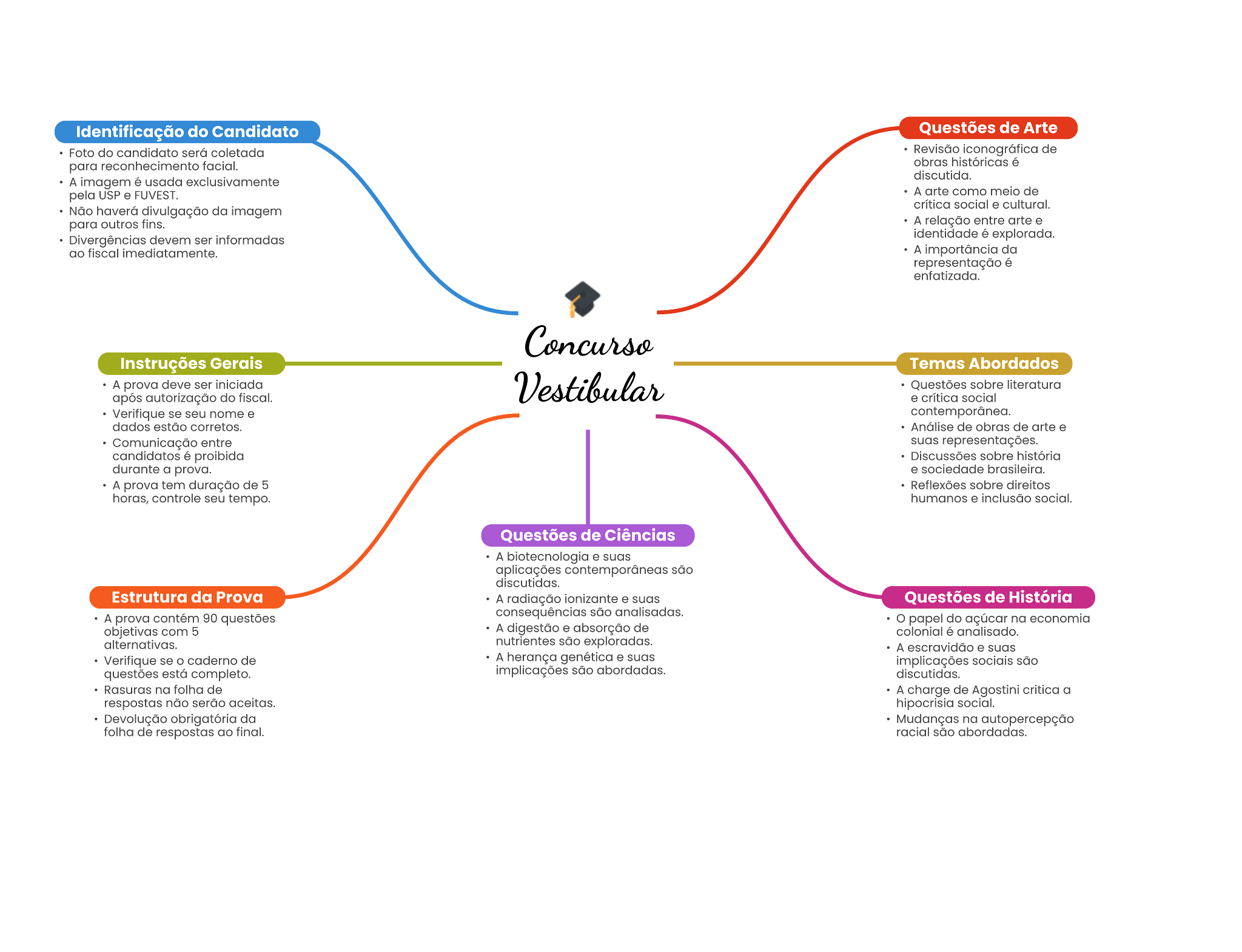 Identificação do Candidato Questões de Arte Foto do candidato será colstada Revisão de para reconhecimento obras históricas A imagem é usada exclusivamente pela USP FUVEST. A arte como melo de Não haverá divulgação da imagem critica social cultural. para outros fine. A relação entre arte Divergências devem ser identidade é explorada. ao A da representação Instruções Gerais Temas Abordados A deve ser Questões sobre literatura autorização do fiscal. social Verifique seu nome contemporânea. dados estão corretos. de obras de arte Comunicação entre representações. Discussões sobre história durante a prova. sociedade brasileira. A prova tem duração de 5 sobre direitos horas, controle tempo. humanos social. Questões de Ciências A biotecnologia aplicações são Estrutura da Prova A radiação Questões de História A prova contém 90 questões consequências papel do açúcar na economia com 5 A absorção de colonial é alternativas. nutrientes exploradas. A escravidão e Verifique se caderno de A herança implicações sociale são questões completo. implicações são abordadas. Rasuras na folha de A charge de Agostini critica a respostas não serão aceitas. Devolução obrigatória da na autopercepção folha de ao final. racial são abordadas.