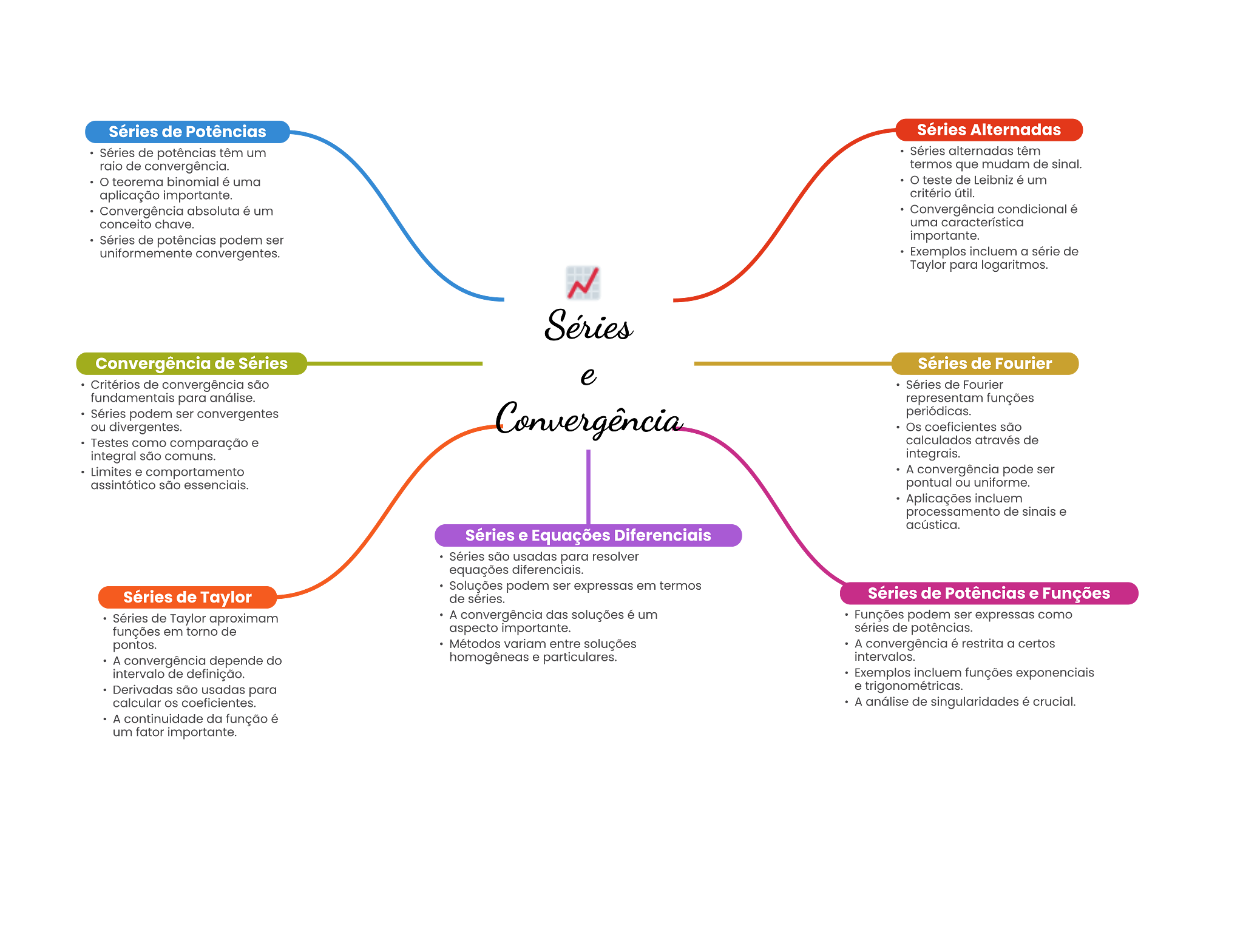 Séries de Potências Séries Alternadas Séries de potências têm um Séries alternadas rato de convergência. termos que mudam de é uma de um aplicação importante. critério Convergência absoluta é um Convergência condicional chave. uma característica Séries de podem ser importante. uniformemente convergentes. Exemplos a série de Taylor para logaritmos. Convergência de Séries Séries de Fourier Critérios de convergência são Séries de fundamentale para representam funções Séries podem ser convergentes ou Os são Testes como comparação calculados de integral Limites . comportamento A convergência pode ser assintótico são pontual ou uniforme. Aplicações Incluem processamento de e acústica. Séries e Equações Diferenciais Séries são usadas para resolver equações Soluções podem ser em termos Séries de Taylor de Séries de Potências e Funções Séries de Taylor aproximam A convergência dos soluções é um Funções podem ser como funções em de aspecto de potências. pontos. Métodos entre soluções A convergência restrita a certos A convergência depende do homogêneas . particulares. intervalos. de definição. Exemplos funções usadas para . calcular A de crucial. A continuidade da função um fator