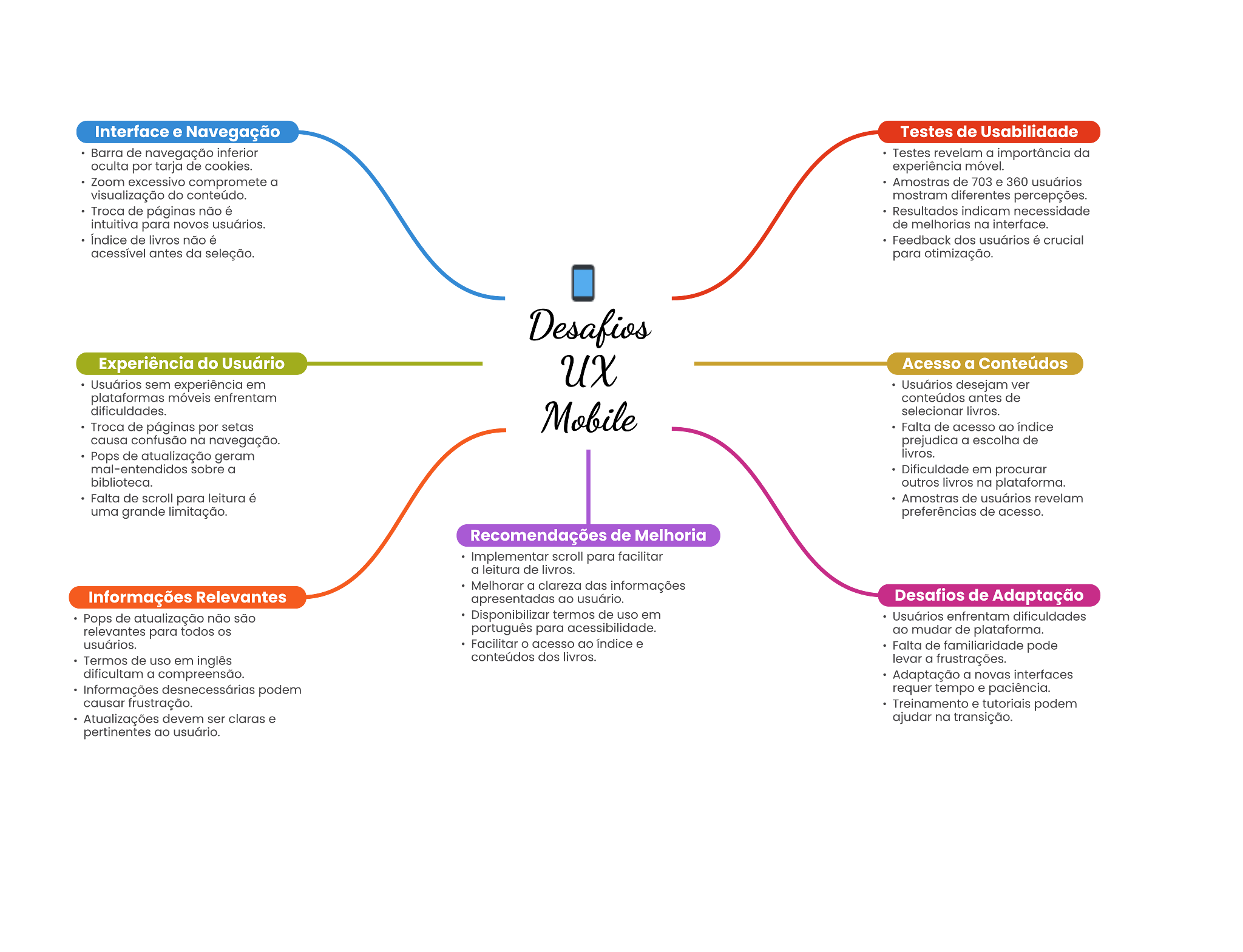 Interface e Navegação Testes de Usabilidade Barra de navegação a da oculta por tarja de cookies. experiência Zoom excessivo a Amostras de 703 e 360 usuários do conteúdo. mostram diferentes percepções. Troca de páginas não Resultados necessidade para novos usuários. de melhorias na de livros não Feedback dos crucial da seleção. para otimização. Experiência do Usuário Acesso a Conteúdos Usuários sem experiência em Usuários desejam ver plataformas enfrentam conteúdos antes de selecionar Troca de páginas por Faita de acesso causa confusão na prejudica a escolha de de geram sobre a em procurar biblioteca. outros livros na plataforma. Falta de scroll para leitura Amostras de usuários uma grande limitação. preferências de acesso. Recomendações de Melhoria scroll para a leitura de Melhorar a dos Informações Relevantes apresentadas usuário. Desafios de Adaptação de não são Disponibilizar termos de uso em enfrentam relevantes para todos os português para mudar de usuários. acesso de familiaridade pode Termos de uso conteúdos dos livros. a frustrações. a compreensão. Adaptação a novas podem requer tempo paciência. Treinamento podem devem ser claras . ajudar na transição. pertinentes usuário.