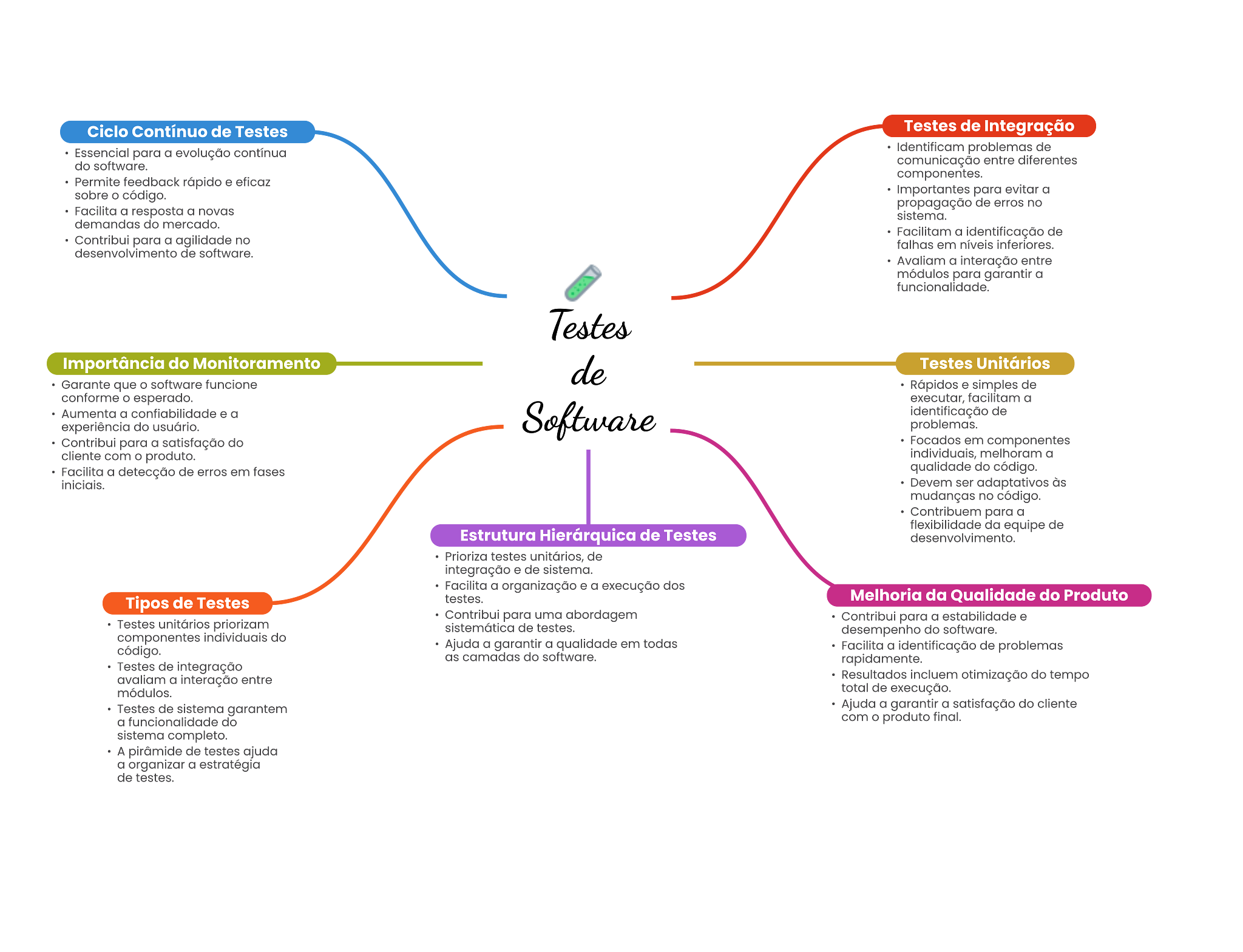 Ciclo Contínuo de Testes Testes de Integração Essencial para a continua de do software. comunicação entre diferentes Permite feedback rápido eficaz componentes. sobre código. Importantes para a propagação de erros no Facilita a resposta a novas demandas do mercado. Facilitam identificação de para a aglidade no fathas em desenvolvimento de software. a entre para garantir a Importância do Monitoramento Testes Unitários Garante que o software funcione simples de conforme o esperado. executar, facilitam a Aumenta a confiabilidade a de experiência do usuário. problemas. Contribui para a satisfação do Focados em componentes com o produto. melhoram a Facilita a detecção de erros em fasse qualidade do código. ser adaptativos às mudanças no código. Contribuem para a flexibilidade da equipe de Estrutura Hierárquica de Testes desenvolvimento. Prioriza testes unitários, de e de Focilita a a execução dos Tipos de Testes Melhoria da Qualidade do Produto para uma abordagem para a estabilidade unitários de testes. componentes do desempenho do software. código. Ajuda a garantir a qualidade em todos Facilita a identificação de problemas as camadas do software. Testes de avaliam a entre Resultados otimização do tempo total de execução. Testee de sistema Ajuda a garantir a satisfação do cliente a do com produto final. completo. A de testes ajuda a organizar a estratégia de