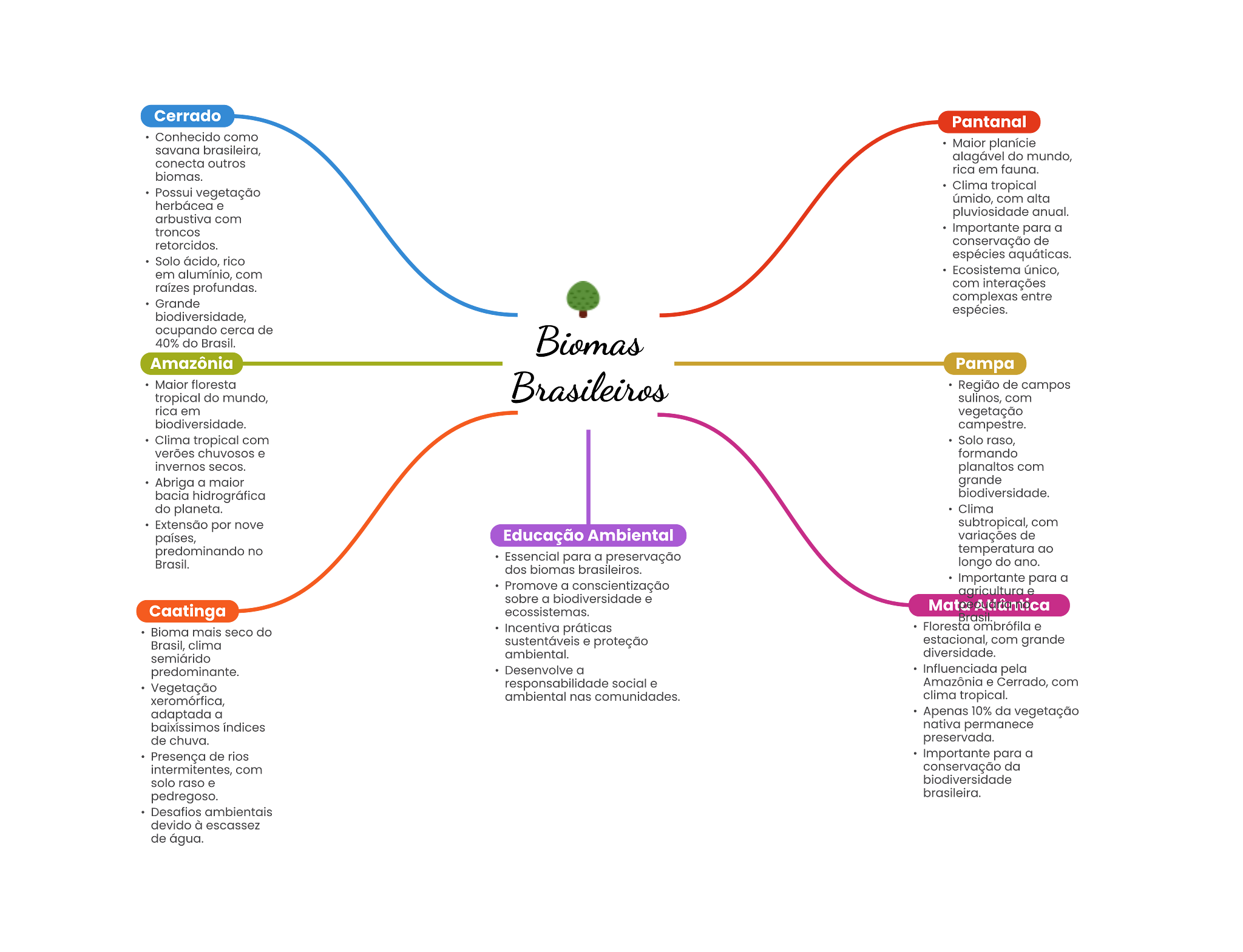 Cerrado Pantanal Conhecido como savana Maior outros alagável do mundo, rica em biomas. vegetação Clima tropical úmido, com alta arbustiva com anual. troncos para a retorcidos. conservação de Solo ácido, rico espécies aquáticas. em com único, com Grande complexas entre espécies. ocupando cerca de 40% do Amazônia Pampa floresta de campos tropical do mundo, com rica em vegetação biodiversidade. Clima tropical com Solo raso, verões chuvosos formando invemos secos. com Abriga a grande bacia hidrográfica do Clima por nove subtropical, com países, Educação Ambiental variações de predominando no temperatura para a preservação dos biomas longo do ano. . Promove a conscientização para a sobre a biodiversidade Caatinga Bioma do . práticas clima proteção estacional, com grande ambiental. diversidade. predominante. a pela Vegetação responsabilidade social Amazônia Carrado, com xeromórfica, ambiental nos clima tropical. adaptada a Apenas 10% da vegetação nativa permanece de chuva. preservada. Presença de para a com conservação da solo raso devido à de água.