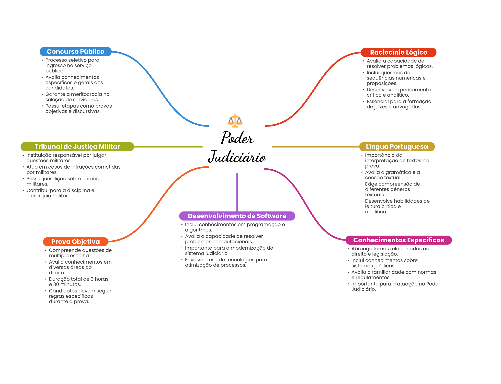 Concurso Público Raciocínio Lógico Processo seletivo para a capacidade de no serviço resolver problemas lógicos. público. questões de Avalia conhecimentos sequências numéricas . específicos dos proposições. candidatos. pensamento Garante a meritocracia na . seleção de servidores. Essencial para a formação Possul etapas como provas de . objetivas Tribunal de Justiça Militar Língua Portuguesa responsável por julgar Importância da questões militares. interpretação de textos na Atud em casos de prova. por militares. a gramática a Possul jurisdição sobre crimes cossão textual. Exige de Contribui para a disciplina e diferentes gêneros militar. Desenvolve habilidades de leitura critica analitica. Desenvolvimento de Software conhecimentos em programação algoritmos. a capacidade de resolver Prova Objetiva problemas Conhecimentos Específicos Compreende questões de para a do Abrange relacionados múltipla direito - conhecimentos em Envolve uso de para conhecimentos sobre do otimização de processos. jurídicos. direito. a familiaridade com normas Duração total de 3 horos regulamentos. 30 minutos. para a atuação no Poder devem seguir Judiciário. regras a prova.