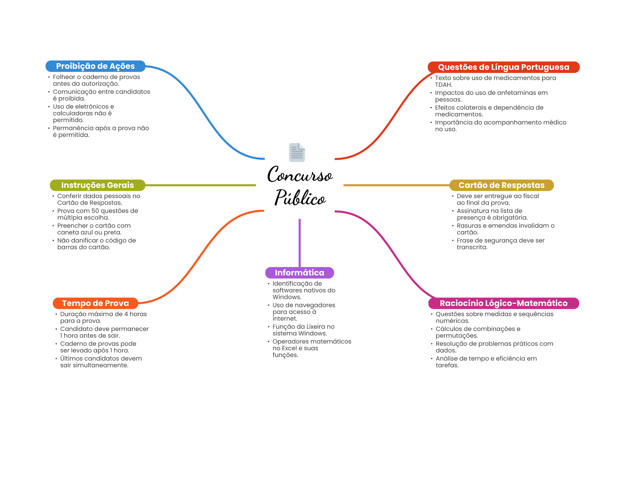 Proibição de Ações Questões de Língua Portuguesa Folhear cademo de provas Texto sobre de medicamentos para antes da autortzação. TDAH. Comunicação entre do uso de em Uso de eletrônicos Efeitos . dependência de calculadoras não medicamentos. permitido. do acompanhamento médico Permanência a prova não no uso. é permitida. Instruções Gerais Cartão de Respostas Confertr dados no Deve ser entregue fiscal Cartão de Respostas. final da prova. Prova com 50 questões de Assinatura na de escolha. presença obrigatória. Preencher cartão com Rasuras emendas ou preta. cartão. Não danificar código de de segurança ser barras do cartão. transcrita. Informática de softwares nativos do Tempo de Prova Uso de navegadores Raciocínio Lógico-Matemático Duração de 4 horae para acesso Questões sobre medidas . sequências para a prova. numéricas. Candidato deve Função da no Cálculos de combinações 1 hora antes de sistema Windows. permutações. Cademo de provas pods Operadores Resolução de problemas com ser levado após 1 hora. no Excel . dados. candidatos funções. Análise de tempo . eficiência em