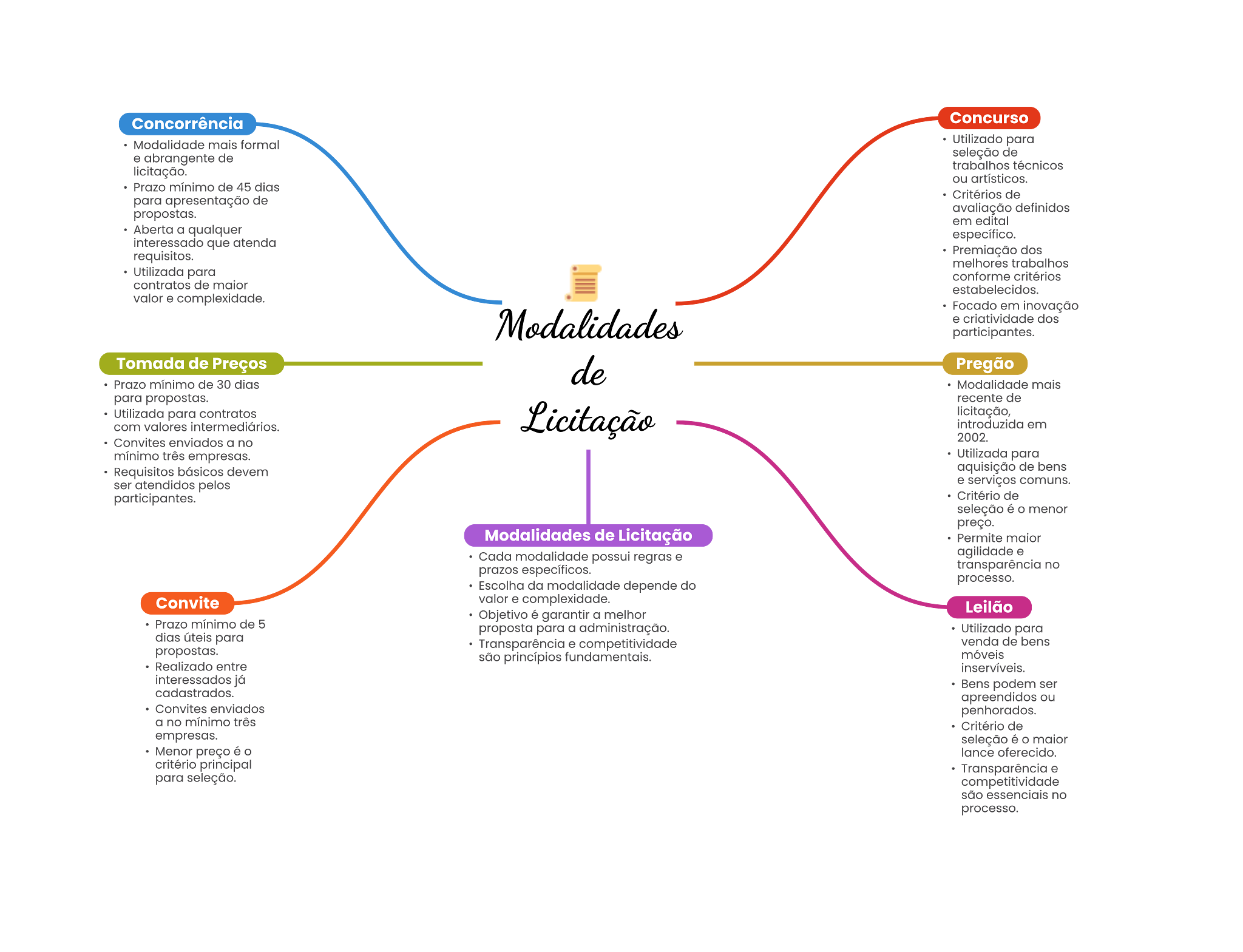 Concorrência Concurso Modalidade mais formal Utilizado para . abrangente de seleção de licitação. trabalhos técnicos ou Prazo mínimo de 45 dias para apresentação de de propostos. definidos em edital Aberta a qualquer sepecífico. que atenda requisitos. Premiação dos melhores trabalhos Utilizada para conforme critérios contratos de valor complexidade. Focado em Inovação criatividade dos participantes. Tomada de Preços Pregão Prazo mínimo de 30 Modalidade para propostas. recente de Utilizada para contratos licitação, com valores intermediários. em a no 2002. trêe Utilizada para Requisitos básicos devem aquisição de bens ser atendidos pelos serviços participantes. de seleção é menor preço. Modalidades de Licitação Permite Cada modalidade possul regras específicos. transparência no Escolha da modalidade do processo. Convite valor . complexidade. Leilão Objetivo é garantir a melhor Prazo mínimo de 5 proposta para a administração. Utilizado para para Transparência . competitividade venda de bene propostas. são entre podem ser cadastrados. apreendidos ou Convites enviados penhorados. a no de empresas. seleção Menor preço o lance oferecido. principal Transparência para seleção. competitividade no processo.