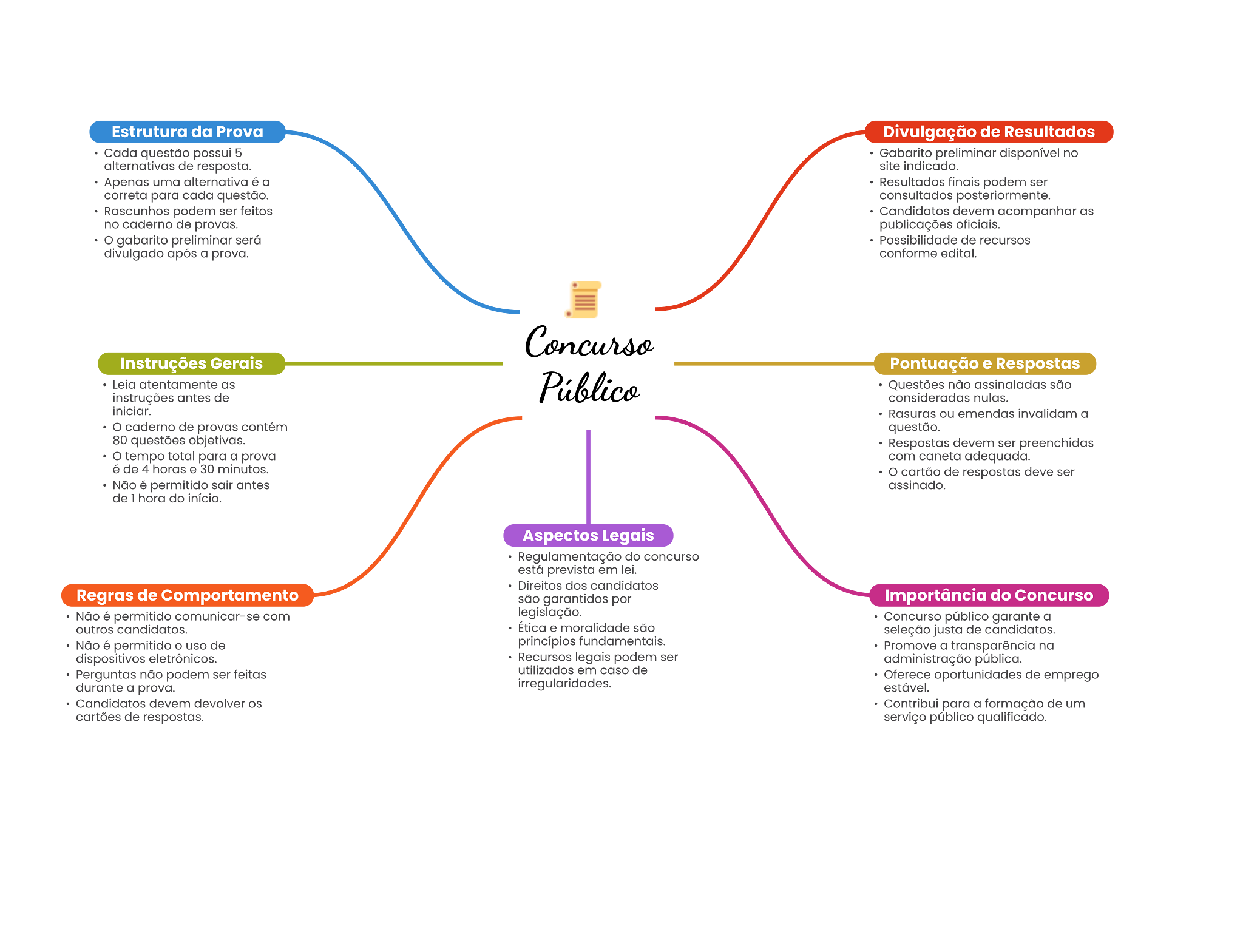 Estrutura da Prova Divulgação de Resultados Cada questão possui 5 Gabarito preliminar disponível no de resposta. site indicado. Apenas uma alternativa é a Resultados podem ser correta para cada questão. consultados Rascunhos podem ser feitos Candidatos devem acompanhar as no cademo de provas. publicações oficials. gabarito preliminar será Possibilidade de recursos divulgado a prova. conforme edital. Instruções Gerais Pontuação e Respostas atentamente as Questões não são instruções antes de iniciar. Rasuras ou a de provas contém questão. 80 questões Respostas devem ser tempo total para a prova com caneta adequada. de 4 horas 30 minutos. cartão de ser Não permitido sair assinado. de 1 hora do Aspectos Legais Regulamentação do concurso em Direitos dos candidatos Regras de Comportamento garantidos por Importância do Concurso Não permitido comunicar-se com legislação. Concurso público garante a outros candidatos. Ética moralidade são seleção justa de candidatos. Não permitido uso de fundamentals. Promove a transparência na dispositivos Recursos legale podem ser administração pública. Perguntas não podem ser feitas utilizados em caso de oportunidades de emprego durante a prova. estável. Candidatos devem devolver Contribui para a formação de um cartões de serviço público qualificado.
