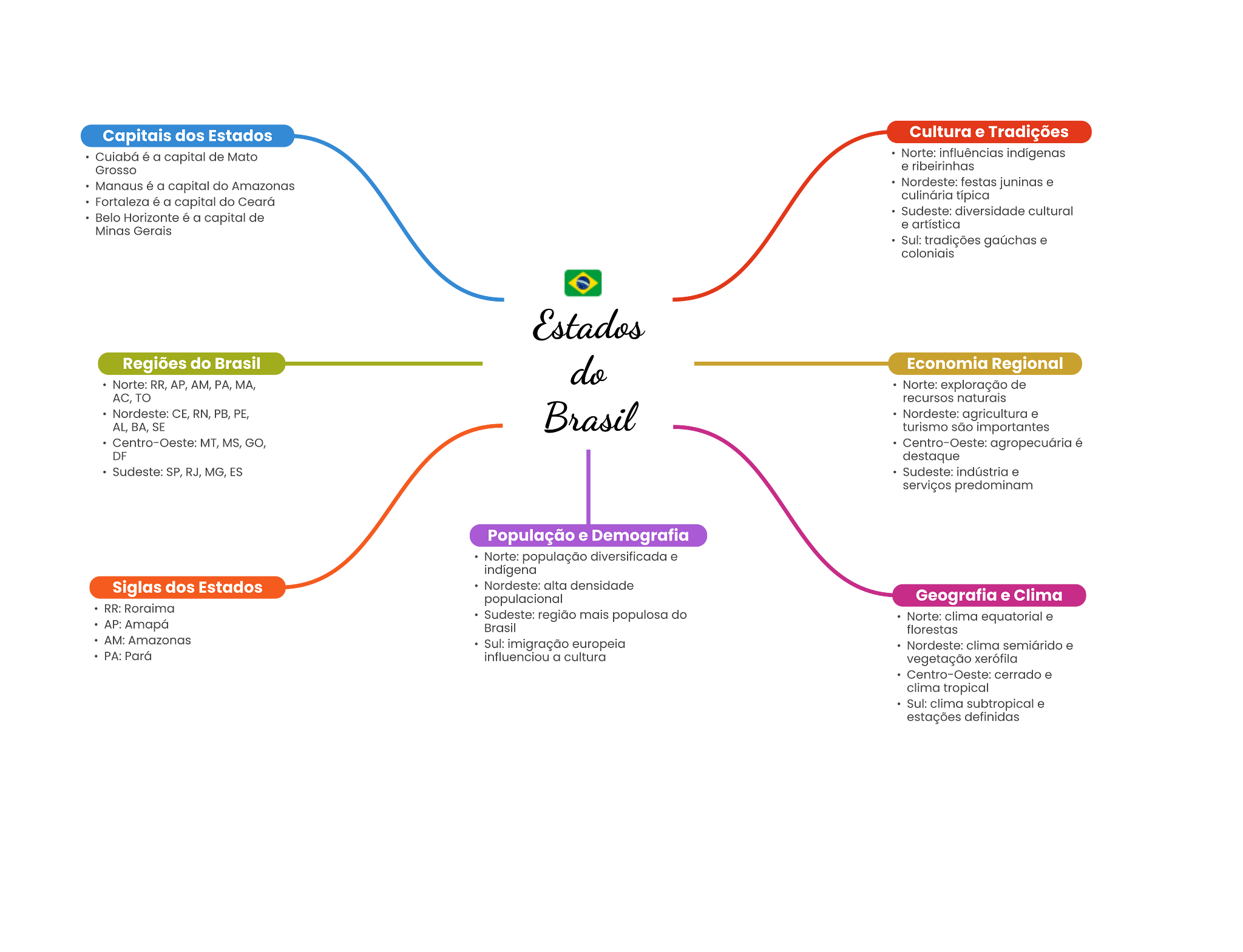 Capitais dos Estados Cultura e Tradições a capital de Mato . ribeirinhas a capital do Amazonas Nordeste: Fortaleza é a capital do culinária típica diversidade cultural Belo Hortzonte é a capital de Gerais . tradições gaúchas Regiões do Brasil Economia Regional RR, AP, AM, PA, MA, Norte: de AC, TO recursos naturale Nordests: CE, RN, PB, PE, agricultura . AL, BA, SE turismo são MT, MS, GO, DF destaque SP, RJ, MG, ES serviços predominam População e Demografia Norte: população Siglas dos Estados alta densidade populacional Geografia e Clima RR: região do AP: clima equatorial . florestas AM: Amazonas europeia semiárido PA: Pará a cultura vegetação cerrado tropical Sub clima subtropical . estações definidas