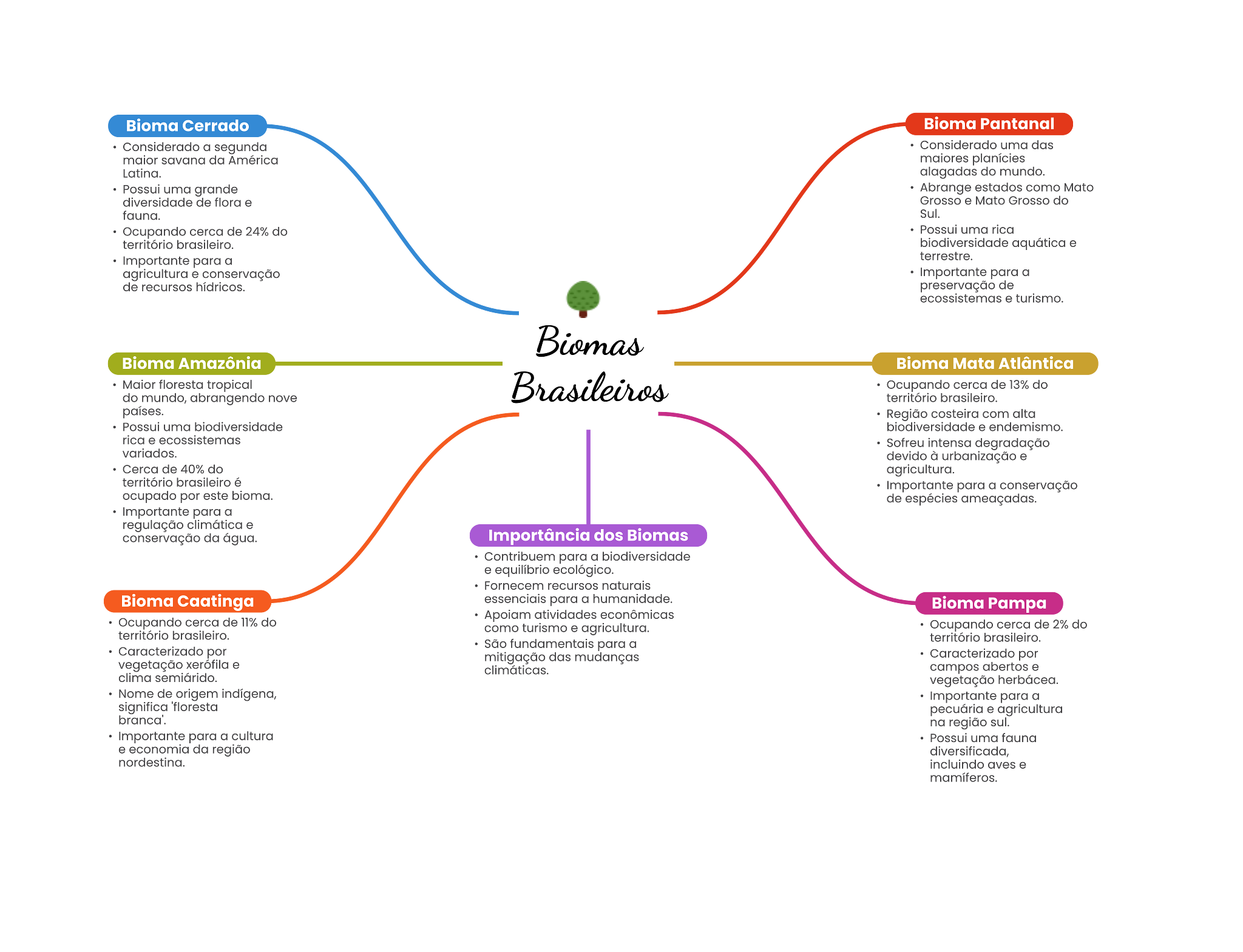 Bioma Cerrado Bioma Pantanal Considerado a segunda Considerado uma das savana da Latina. alagadas do mundo. Possul uma grands Abrange estados como Mato diversidade de flora @ Grosso . Mato Grosso do Sul. Ocupando de 24% do uma rica território aquática . para a agricultura conservação Importante para a de recursos preservação de turismo. Bioma Amazônia Bioma Mata Atlântica floresta tropical Ocupando cerca de 13% do do mundo, abrangendo nove território brasileiro. costeira com alta uma biodiversidade rica ecossistemas Sofreu degradação variados. devido à Cerca de 40% do agricultura. território importante para a conservação ocupado por este bioma. de para a regulação climática conservação da água. Importância dos Biomas Contribuem para a equilibrio Fornecem recursos naturale Bioma Caatinga essenciale para a humanidade. Bioma Pampa Ocupando cerca de П% do atividades econômicas como agricultura. Ocupando de 2% do Caracterizado por São para a território brasileiro. mitigação das mudanças Caracterizado por vegetação campos abertos clima vegetação Nome de origem para a significa pecuária . agricultura na região para a cultura uma fauna . economia da regido incluindo aves .