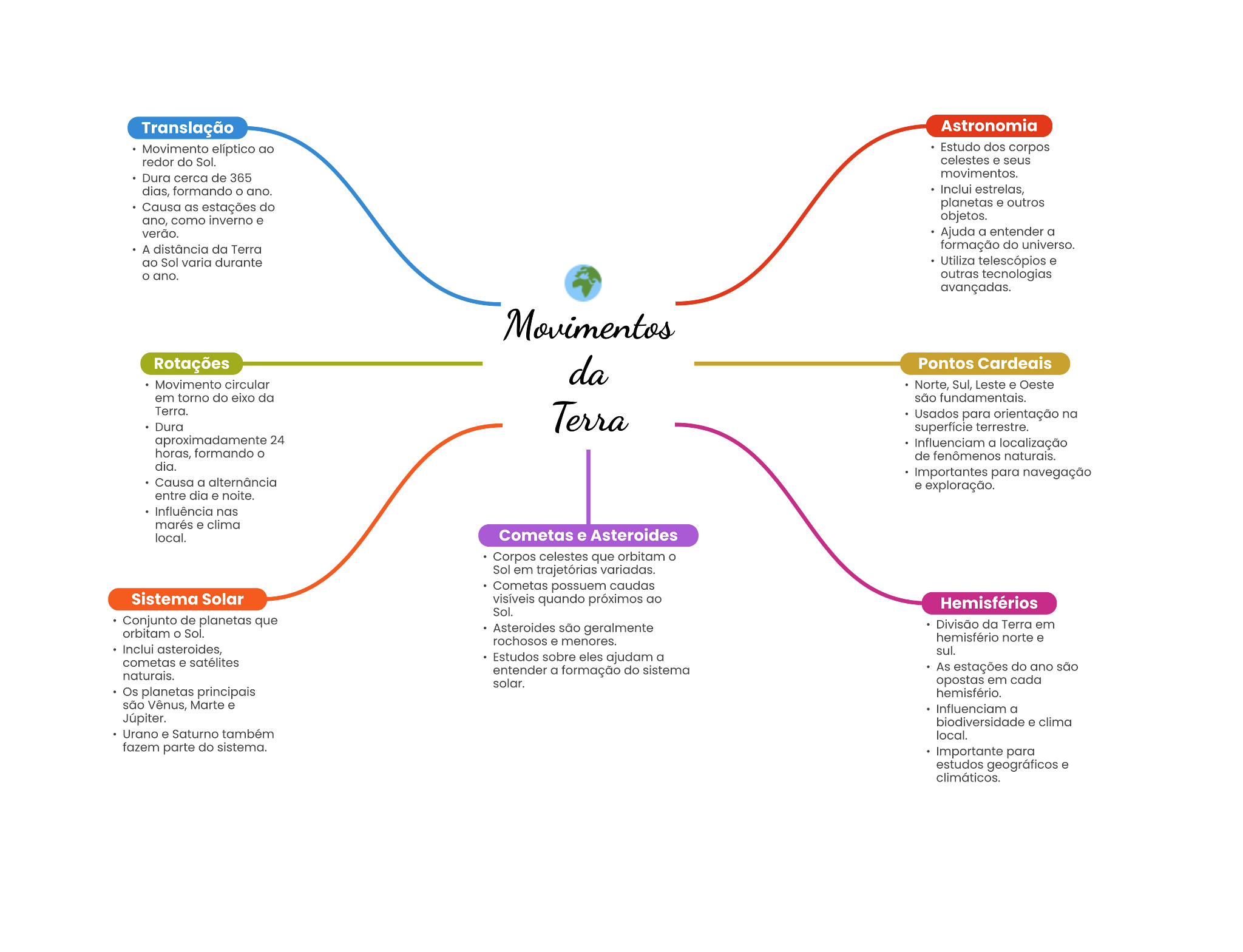 Translação Astronomia Movimento eliptico Estudo dos corpos redor do Sol. celestes seus Dura cerca de 365 movimentos. formando ano. Inclui estreias, Causa as estações do ano, como objetos. Ajuda a entender a A distância da Terra formação do universo. Sol varia durante Utiliza ano. outras tecnologias avançadas. Rotações Pontos Cardeais Movimento circular Norte, Sul, Leste e em do da são Terra. Usados para orientação na Dura superficie terrestre. 24 influenciam a localização formando de dia. importantes para navegação Causa a exploração. entre dia clima local. Cometas e Asteroides Corpos que arbitam Sol em variadas. Cometas caudas Sistema Solar quando Hemisférios Conjunto de que o Sol. geralmente Divisão da Terra em rochosos . menores. hemisfário norte asteroides, cometas . Estudos sobre ajudam a entender a formação do As estações do ano solar. em cada planetas principale são Marte a Júpiter. . clima Urano . também local. parte do para estudos geográficos climáticos.