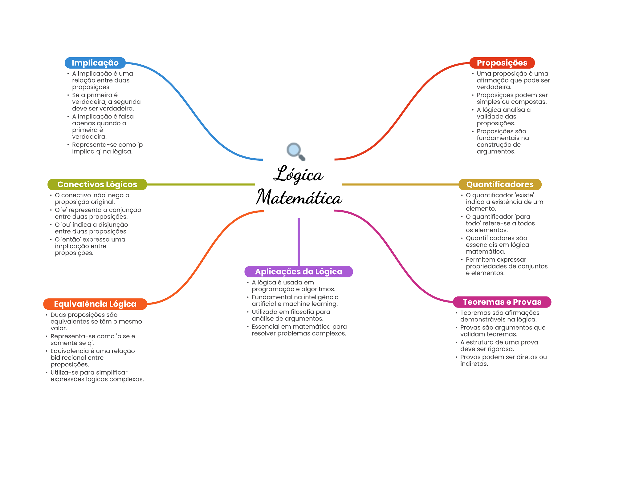Implicação Proposições A implicação é uma Uma proposição é uma relação entre duas afirmação que pode ser proposições. Se a primeira Proposições podem ser verdadeira, a segunda simples ou deve ser A a A falsa validade das quando a proposições. Proposições são fundamentale na Representa-se como construção de Implica q' na argumentos. Conectivos Lógicos Quantificadores consctivo nega a quantificador proposição original. Indica a de um o representa a conjunção elemento. entre duas proposições. quantificador para 'ou' indica a disjunção todo' refere-se a todos entre duas proposições. elementos. uma Quantificadores são entre em lógica proposições. expressor propriedades de conjuntos Aplicações da Lógica elementos. A lógica usada em programação e Fundamental na Equivalência Lógica artificial machine learning. Teoremas e Provas Duas proposições são Utilizada em para Teoremas são afirmações equivalentes têm de argumentos. na lógica. valor. Essencial em matemática para Provas são argumentos que como resolver problemas validam somente se q. A estrutura de uma prova Equivalência uma relação deve ser rigorosa. bidirecional entre Provas podem ser diretas ou proposições. para simplificar expressões lógicas complexas.