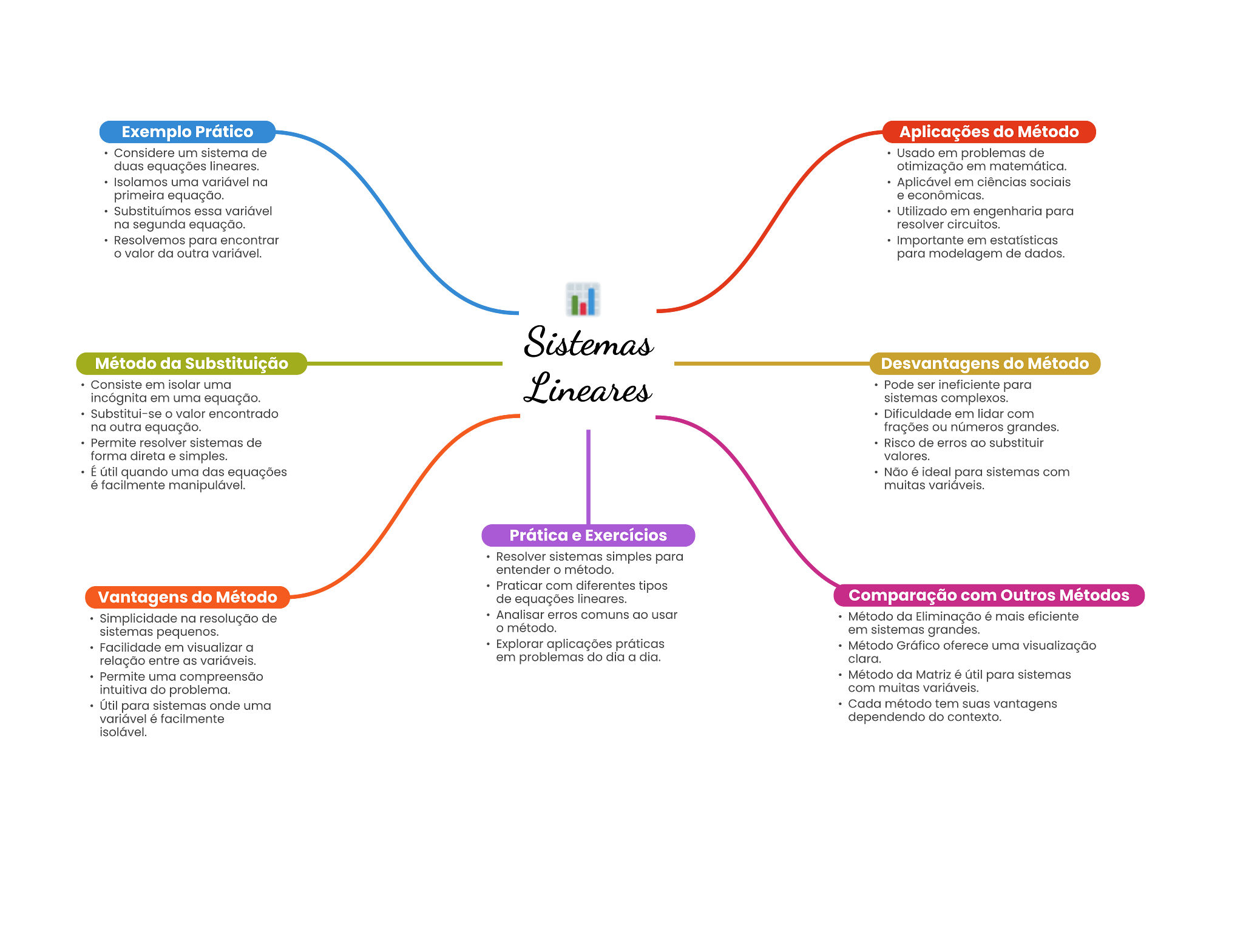 Exemplo Prático Aplicações do Método Considere um sistema de em problemas de duas equações lineares. otimização em Isolamos uma variável na Aplicável em primeira equação. econômicas. variável Utilizado em engenharia para na segunda equação. resolver para encontrar em estatísticas valor da outra para modelagem de dados. Método da Substituição Desvantagens do Método Consiste em uma Pode ser para em uma equação. sistemas o valor encontrado Dificuldade em lidar com na outra equação. frações ou números Permite resolver sistemas de Risco de erros ao substituir forma direta simples. valores. É quando uma das equações Não é para sistemas com facilimente Prática e Exercícios Resolver para entender método. Praticar com diferentes tipos Vantagens do Método de equações Comparação com Outros Métodos Simplicidade na resolução de erros comune do Método da Eliminação é mais eficiente sistemas pequence. método. em grandes. Facilidade em visualizar a Explorar aplicações Método Gráfico oferece uma visualização relação entre as variávela. em problemas do dia a dia. Permite uma Método da Matriz útil para sistemas do problema. com multas para sistemas onde uma Cada método vantagens variável facilmente dependendo do