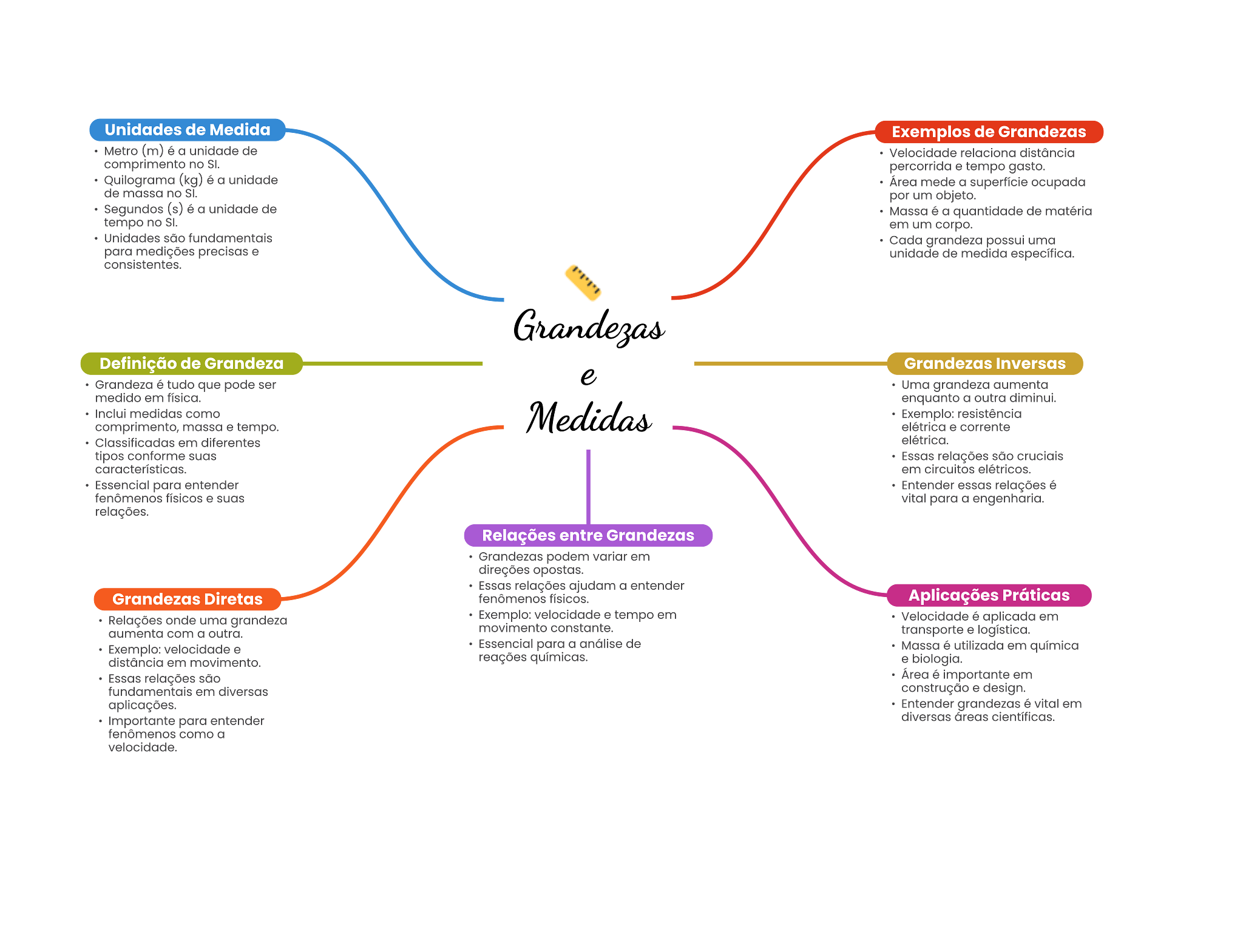 Unidades de Medida Exemplos de Grandezas Metro (m) a unidade de Velocidade relaciona distância comprimento no SL percorrida tempo gasto. Quilograma (kg) é a unidade a superficie ocupada de massa no SL por um objeto. Segundos (a) a unidade de Massa é a quantidade de matéria tempo no em um corpo. Unidades são Cada grandeza uma para medições precisas unidade de medida consistentes. Definição de Grandeza Grandezas Inversas Grandeza tudo que pode ser Uma aumenta medido em fisica. enquanto a outra medidas como Exemplo: comprimento, massa tempo. elétrica . corrente Classificadas em diferentes tipos conforme Essas são em elétricos. Essencial para entender Entender relações . vital para a engenharia. Relações entre Grandezas podem varior em direções opostos. relações ajudam a entender Grandezas Diretas fenômenos Aplicações Práticas Relações onde uma grandeza Exemplo: velocidade tempo em Velocidade é aplicada em com a outra. movimento transporte Exemplo: velocidade Essencial para a de é utilizada em em movimento. reações biologia. Essas relações Área é importante em fundamentais em construção design. aplicações. Entender grandezas vital em para entender diversas como a velocidade.